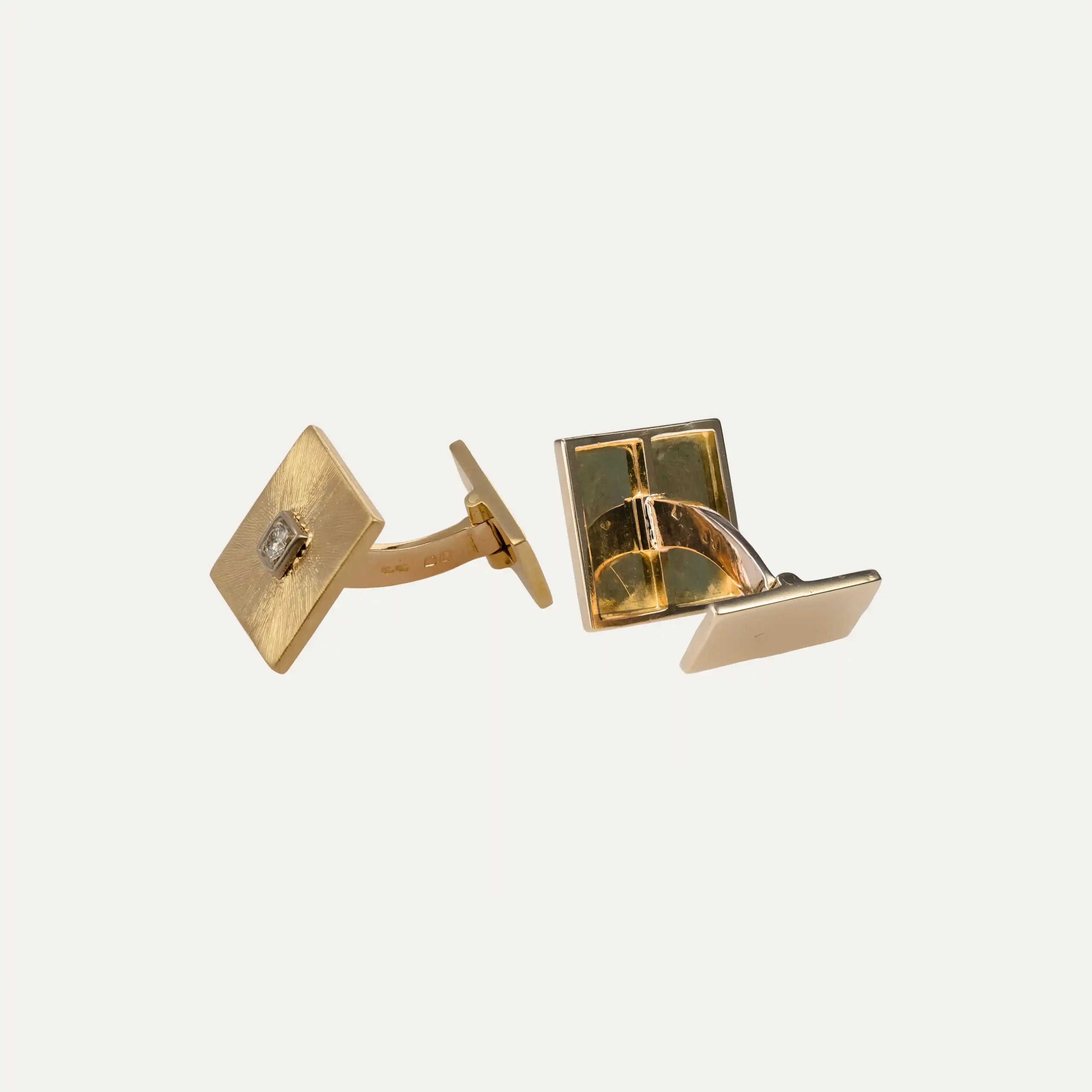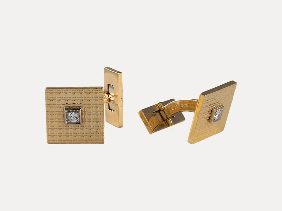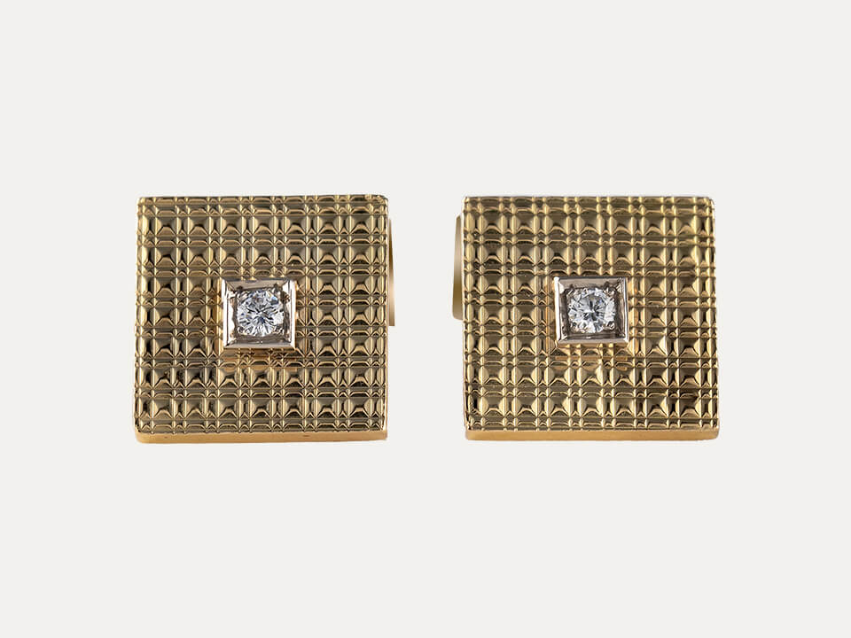 18kt – 750‰ yellow gold cufflinks, satin-finished square, with 2 dimonds, brilliant cut diamonds, with 0.13ct in total.