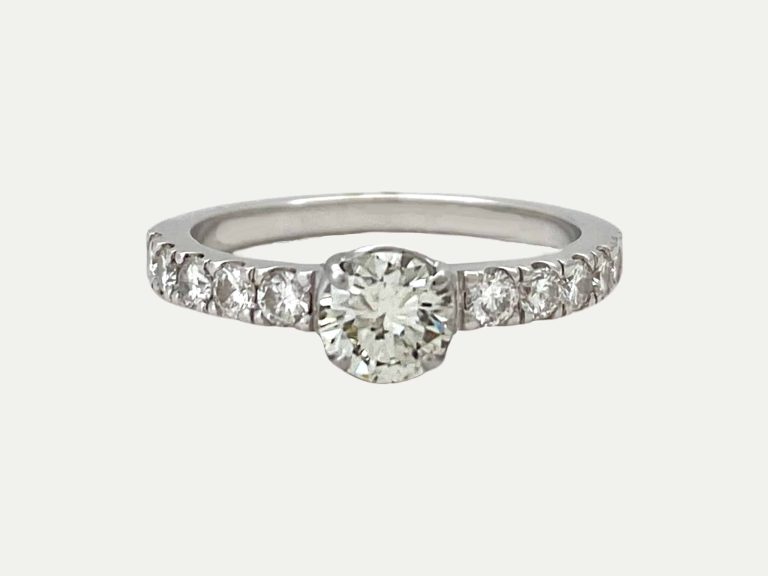 19,2 kt – 800 ‰ white gold ring with 1 brilliant cut diamond with 0.46 ct in the center and 10 brilliant cut diamond with 0.20 ct in total.