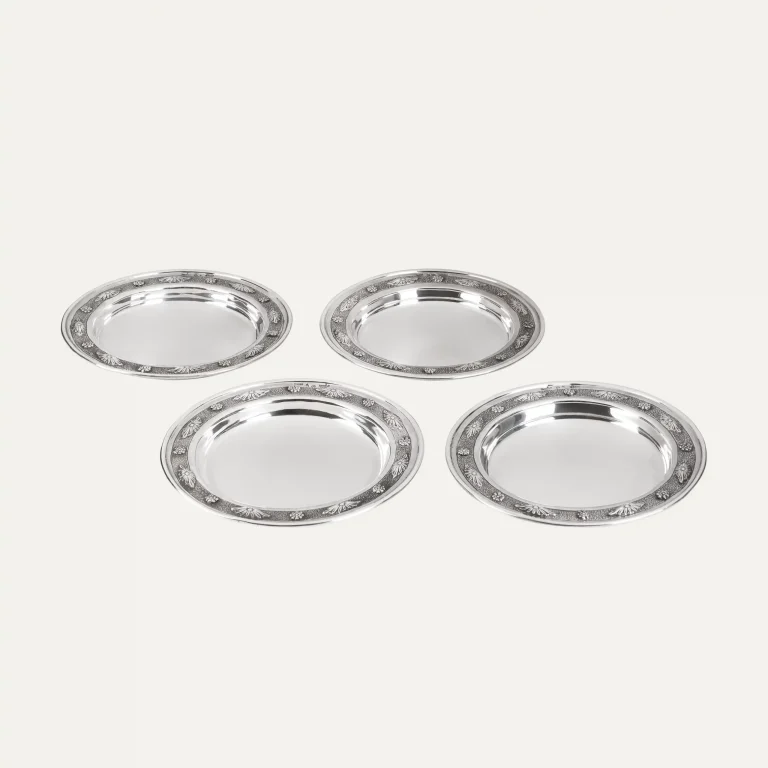 Four small dishes in 916 ‰ silver, with raised decoration of “vegetalist motifs”. Signed “Leitão & IR.”. Portuguese, bearing the Porto assay mark (1887–1937) and the silversmith’s mark of Leitão & Irmão, registered in 1887.