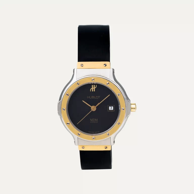 Hublot MDM Quartz Movement Watch. Case in stainless steel and 18kt – 750‰ yellow gold, bezel in gold secured by visible screws. Diameter of 28mm and thickness of 7.5mm. Black dial, hour, minute, and second hands, date at 3 o’clock. Crown in steel and gold with Hublot logo. Sapphire crystal. Black rubber strap with double folding clasp in steel and gold. Year 2004. Original Hublot box and documents. This watch is backed by our one-year warranty.