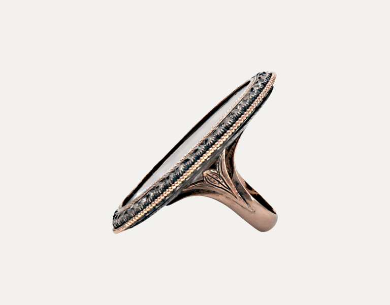 Gold and silver ring set with “Minas Novas” (quartz), with miniature of King João VI. Restorations and adaptations. Portuguese, without hallmark, under Decree-Law n.º 120/2017, art. 2, paragraph 2, item C and art. 3.