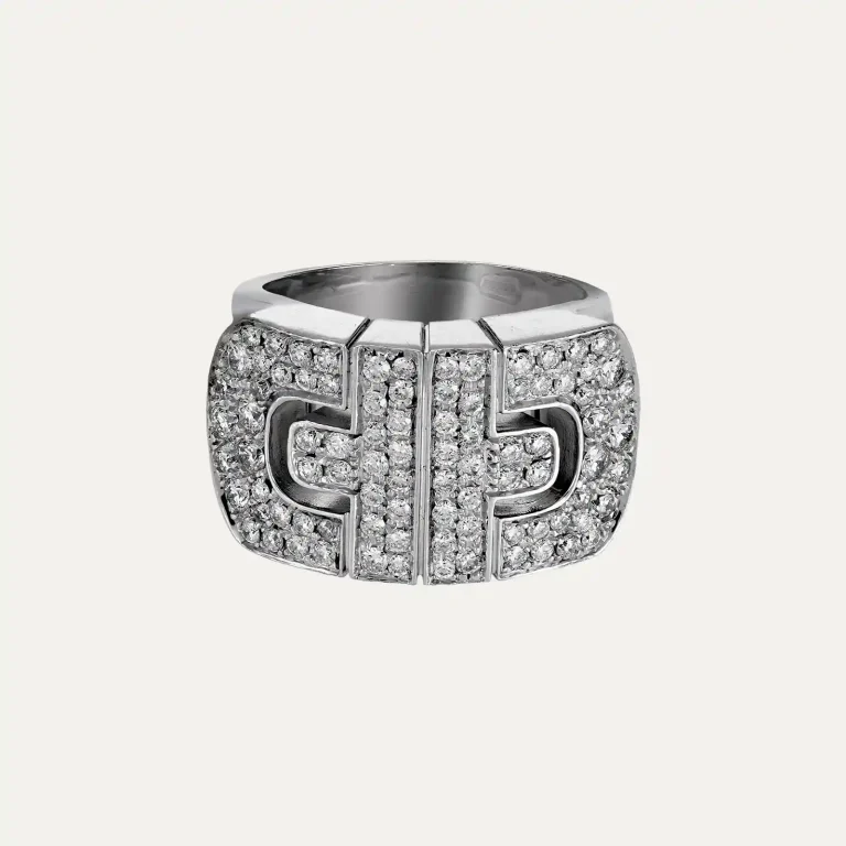 18kt – 750‰ Bulgari white gold ring, from the Parentesi collection. Inspired by the iconic Parentesi design, with an interlaced, geometric pattern that evokes the paving stones that covered the ancient roads of Rome. Set with a pave of 88 brilliant-cut diamonds totalling around 1.14ct, G colour and VS clarity. Signed Bulgari, italian hallmarks. This ring is part of a set with the necklace Ref: 9003673.