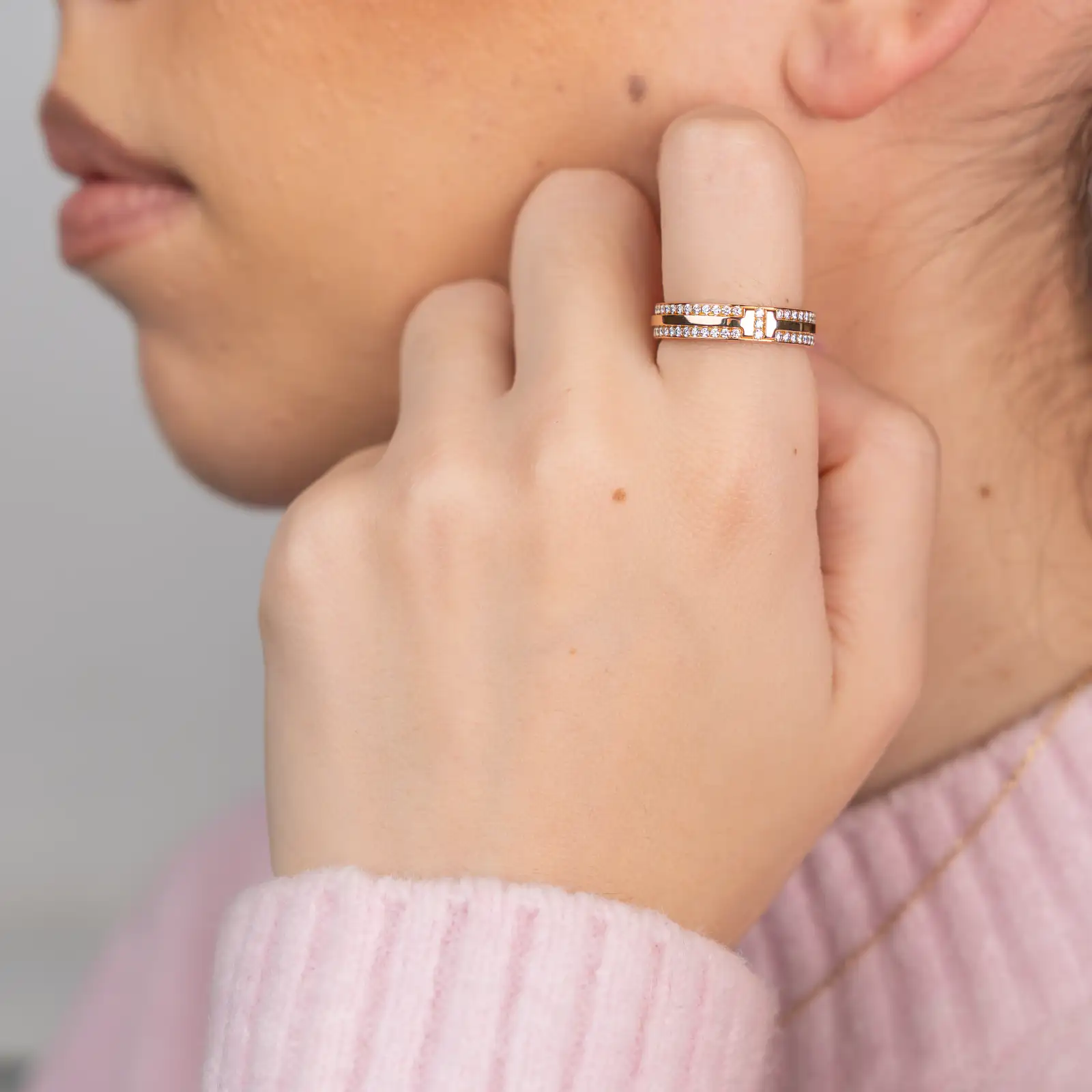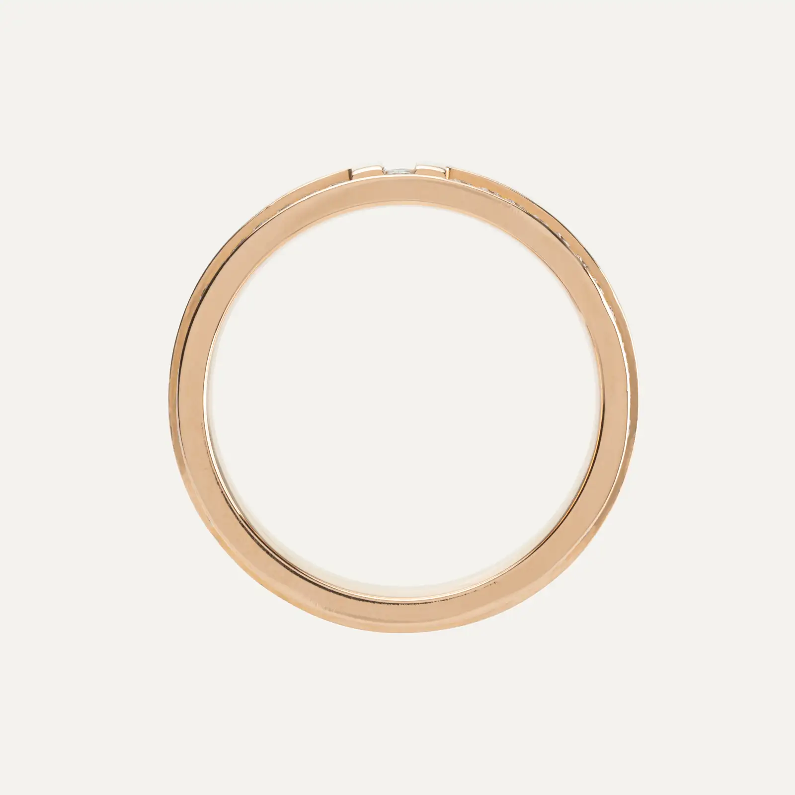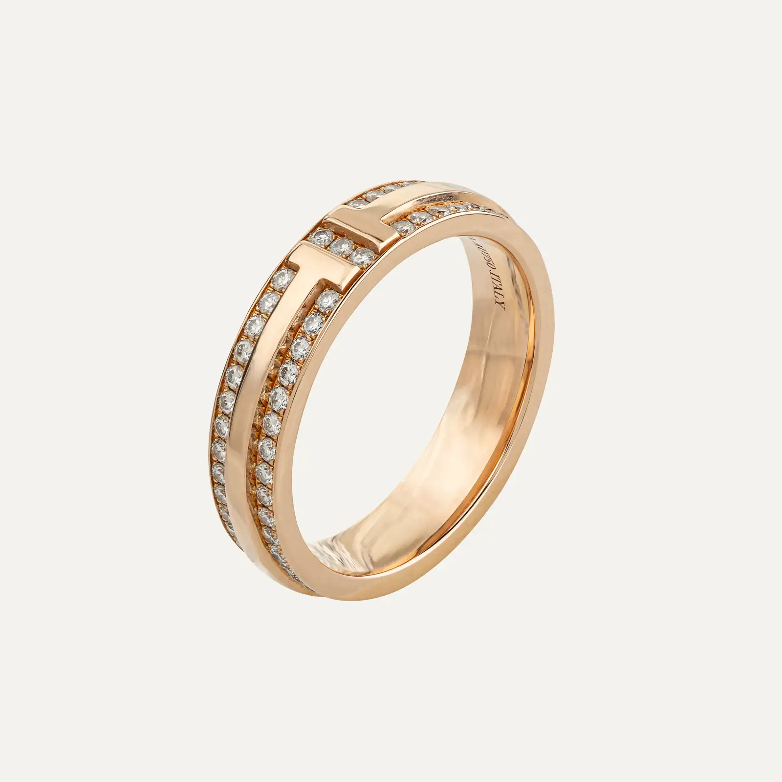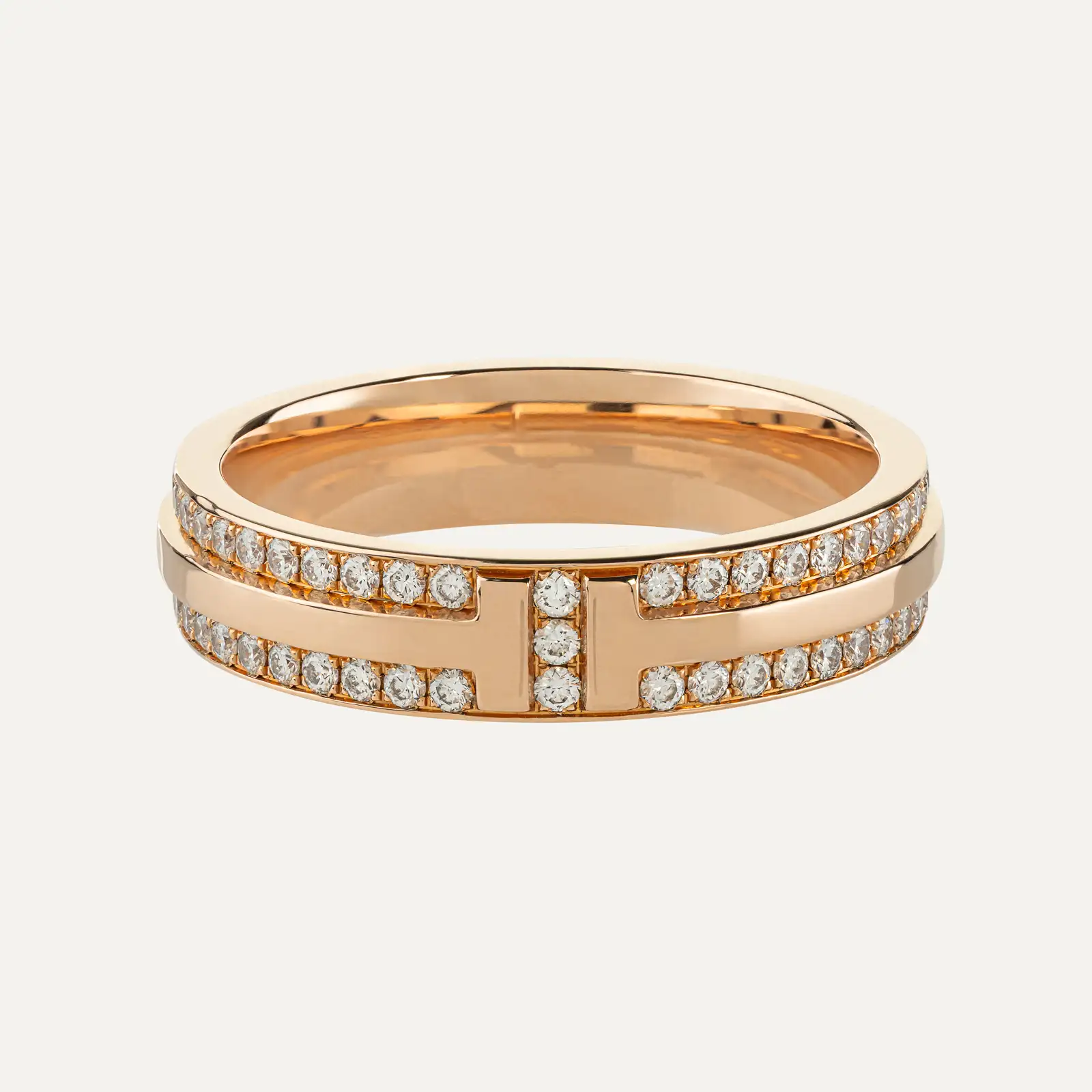 This Tiffany & Co. ring features a contemporary design in rose gold 18kt – 750‰, enhanced by two rows of brilliant-cut diamonds. The geometric central element adds modernity to the piece, creating a perfect balance between classic elegance and striking personality.