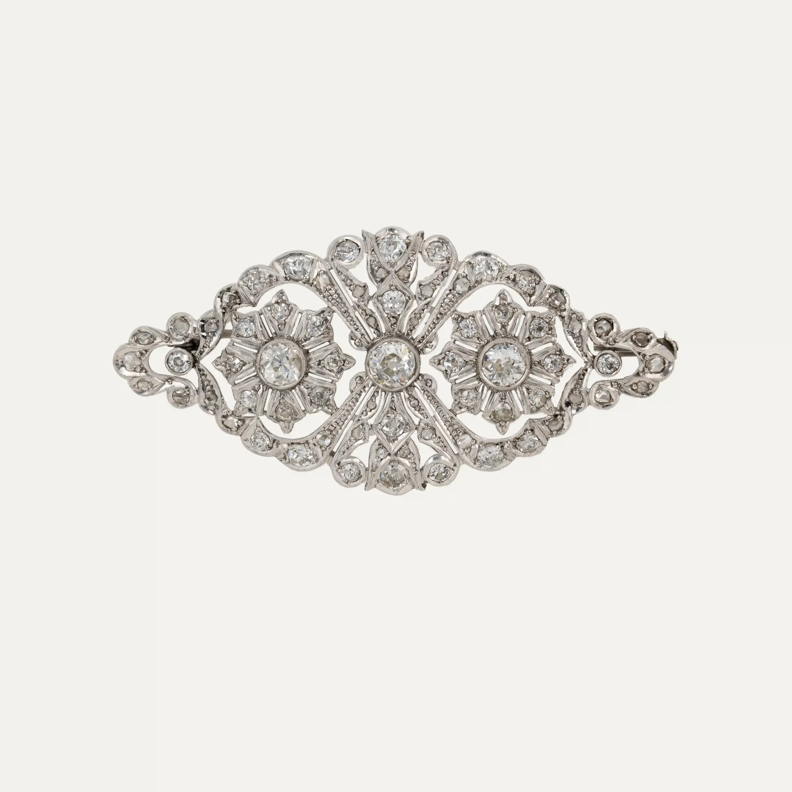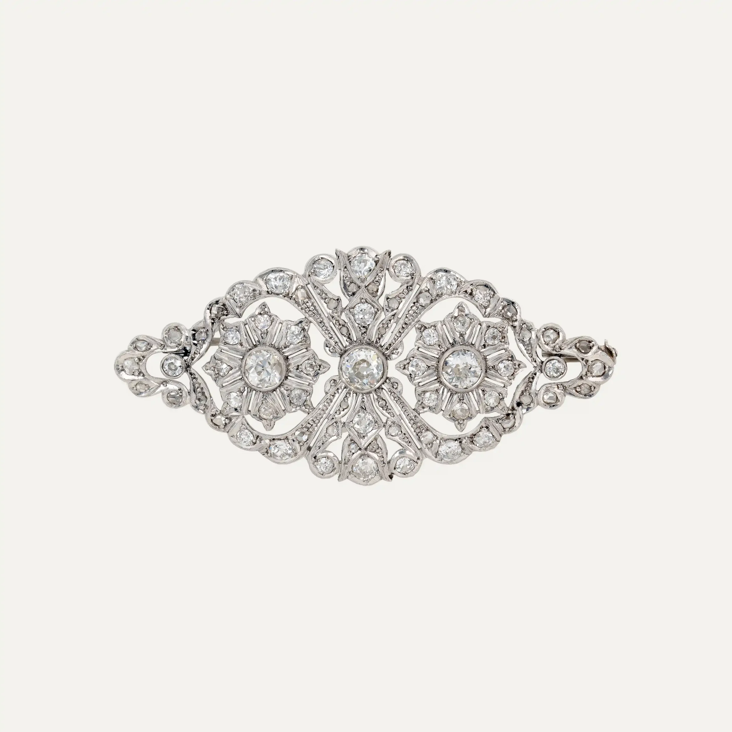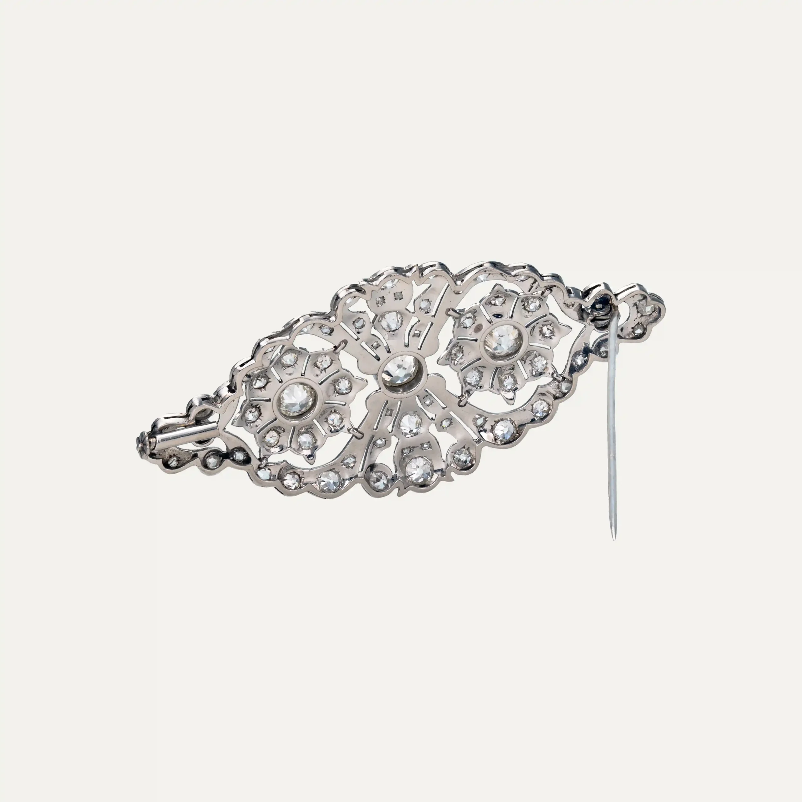Art Deco brooch in 950 ‰ platinum, delicately crafted with old-cut diamonds. It features a symmetrical design, with two central floral motifs highlighted by three principal diamonds weighing approximately 1.75 ct in total, surrounded by 66 diamonds that provide exceptional brilliance.