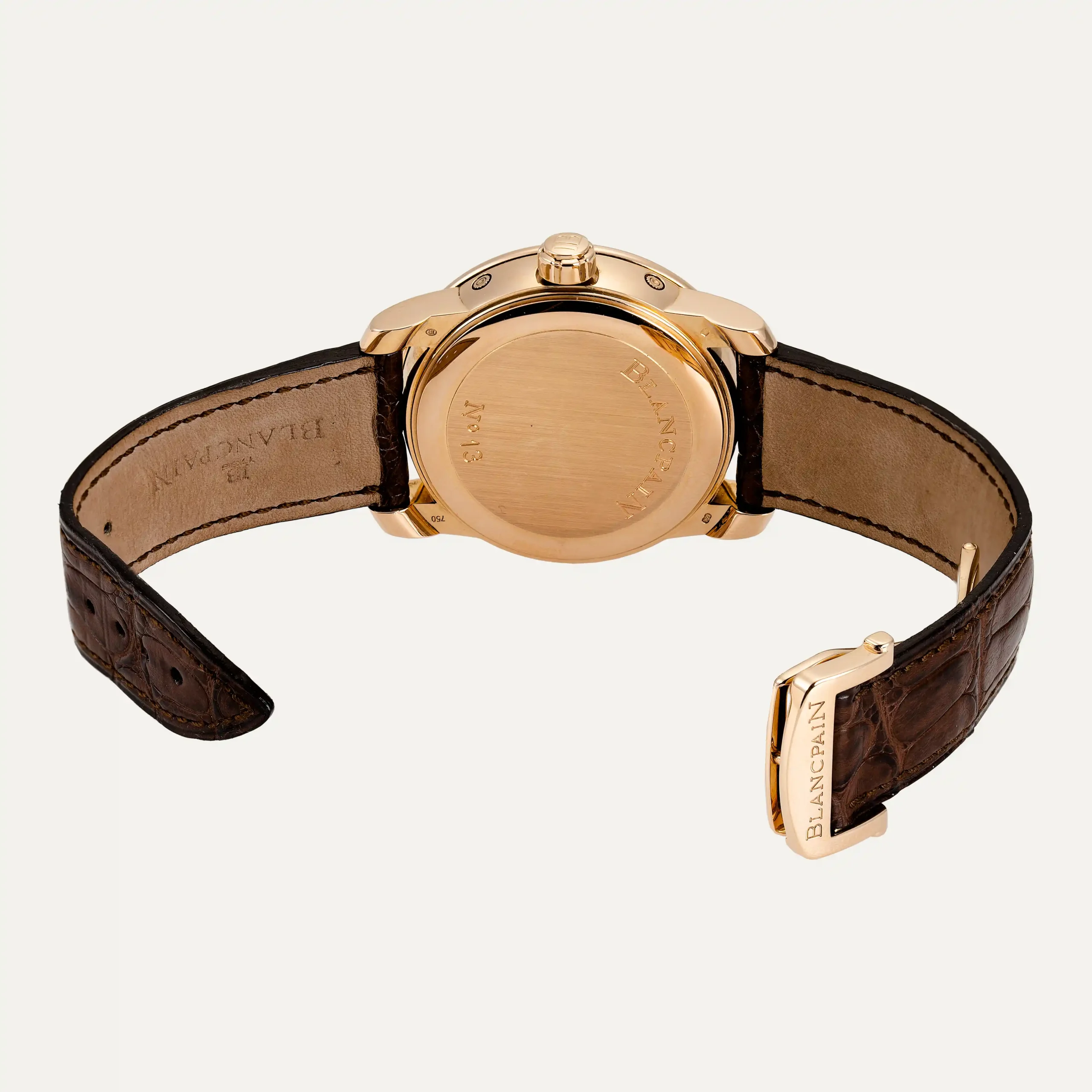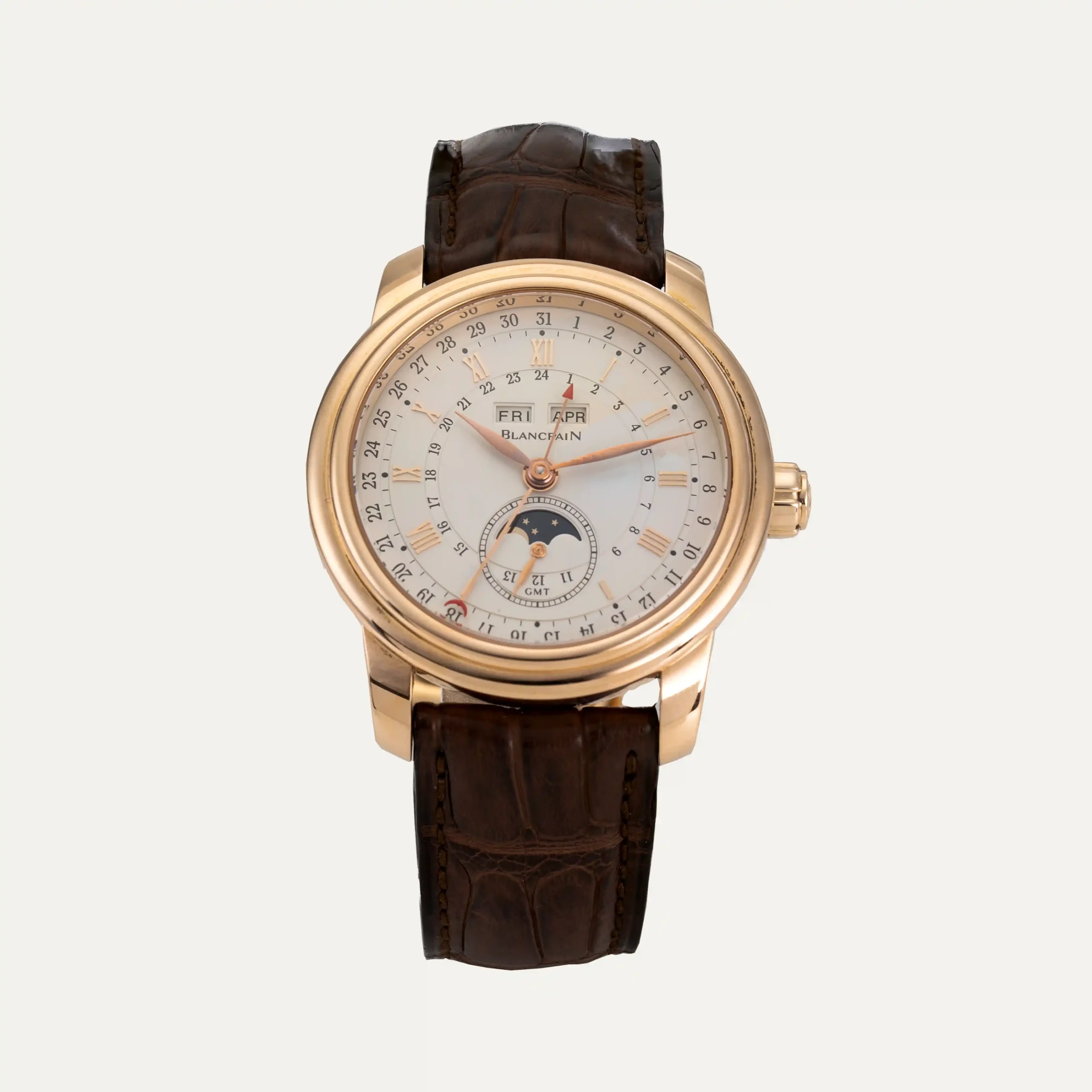 Blancpain Le Brassus Complete Calendar GMT watch, automatic movement, 42 mm in diameter and approximately 13.2 mm thick. 18kt – 750‰ rose gold case, polished bezel, opaline silver dial with Roman numerals, gold appliqués, hour, minute and second hands, date displayed by a central half-moon hand, day and month windows at 12 o’clock, moon phase and small seconds at 6 o’clock, second time zone with 24-hour GMT hand. Crown with Blancpain logo. Sapphire crystal. Brown alligator leather strap with rose gold folding clasp. “The Watch Register” certificate. This watch is supported by our one-year guarantee.