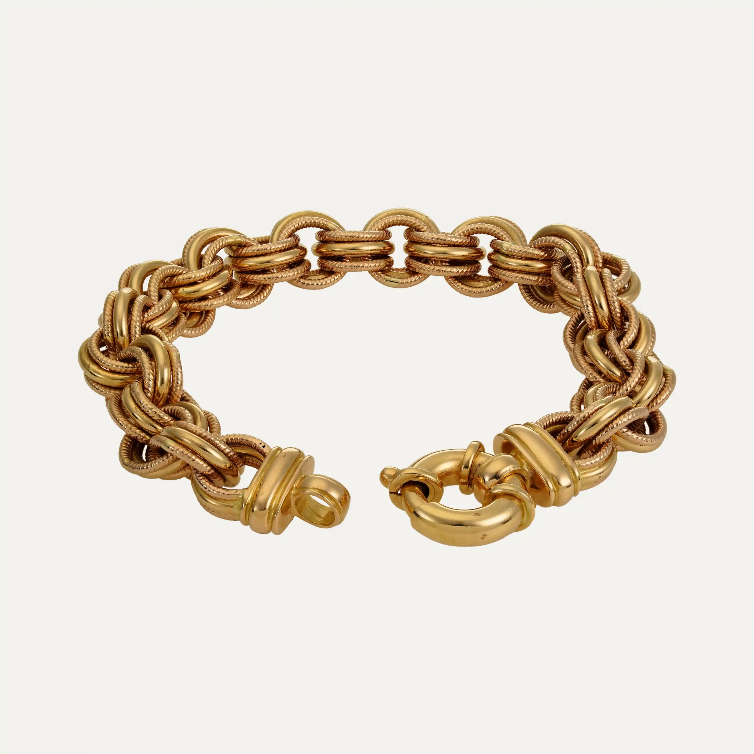 19.2kt – 800‰ yellow gold bracelete, articulated round interlaced links with three rings. Clasp with spring ring.