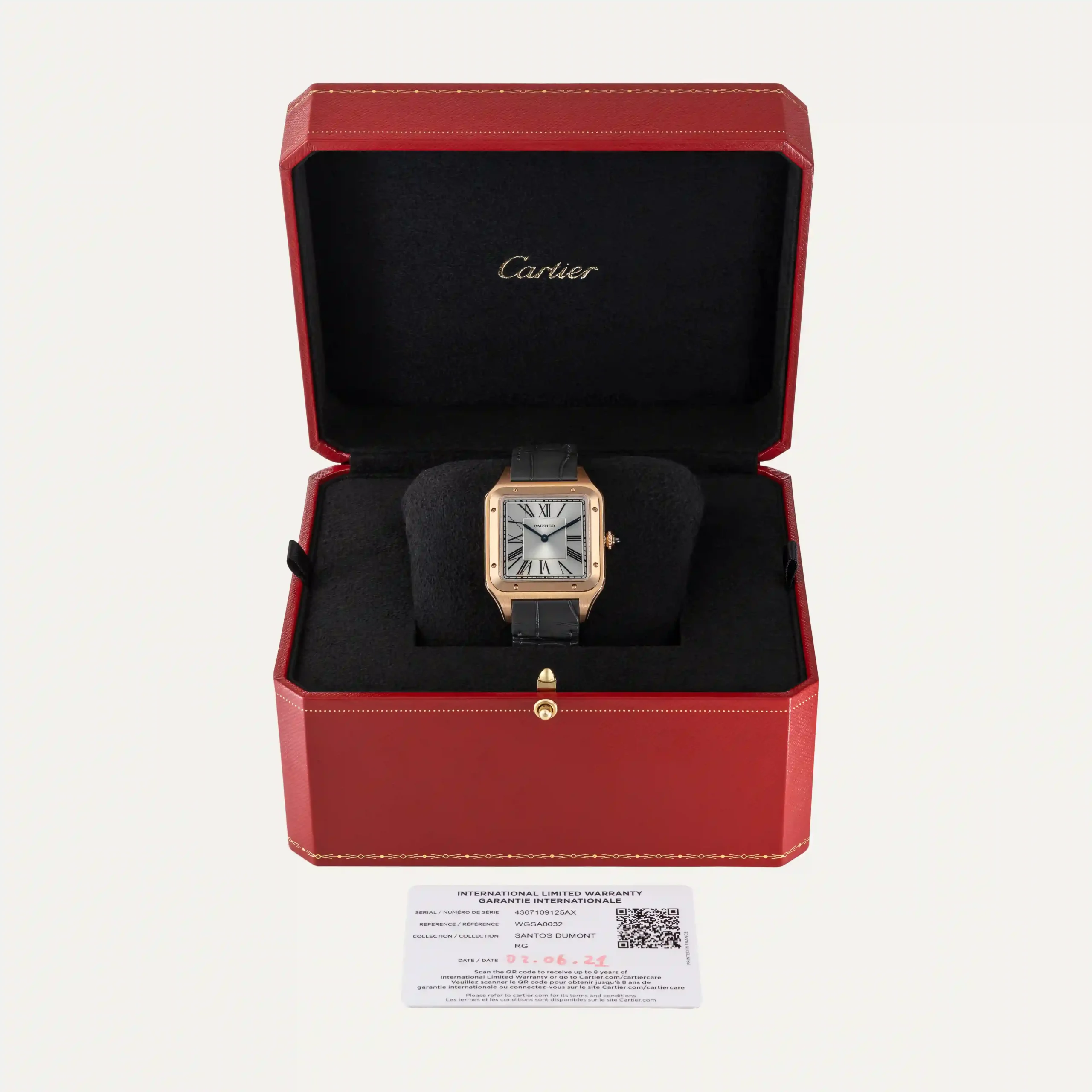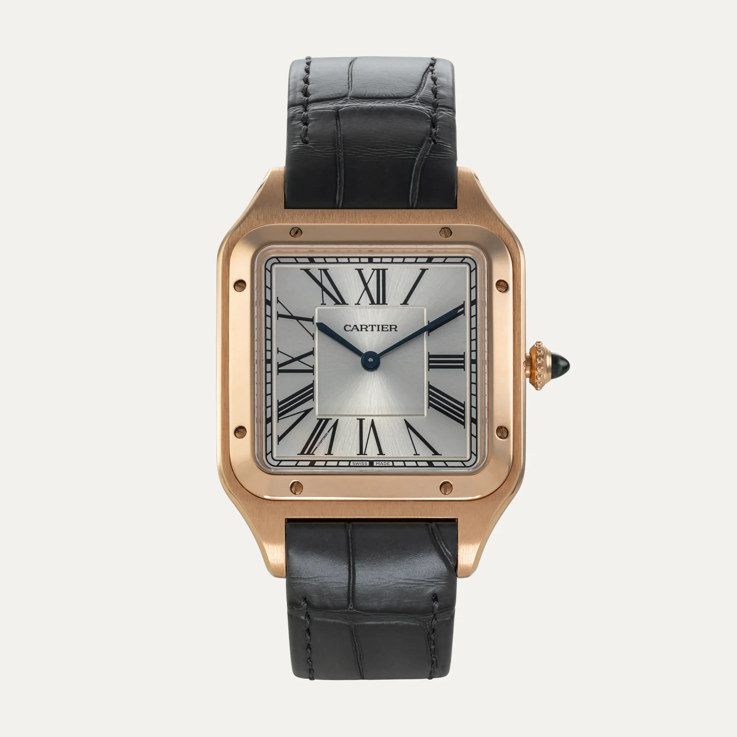 Cartier Santos Dumont watch, which pays homage to the Brazilian aviator Alberto Santos-Dumont. Manual winding mechanical movement, 18kt – 750‰ rose gold case, measuring 46.6 mm x 33.9 mm and 7.5 mm thick, crown with a blue sapphire, satin silver dial with sunray effect, roman numerals and blued steel sword-shaped hands. Sapphire crystal. Grey crocodile leather strap with 18kt – 750‰ rose gold buckle. With original Cartier box and documents. Year 2021. “The Watch Register” certificate. Includes 1 year in-house warranty.