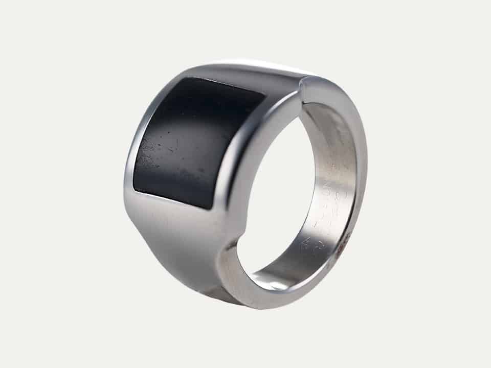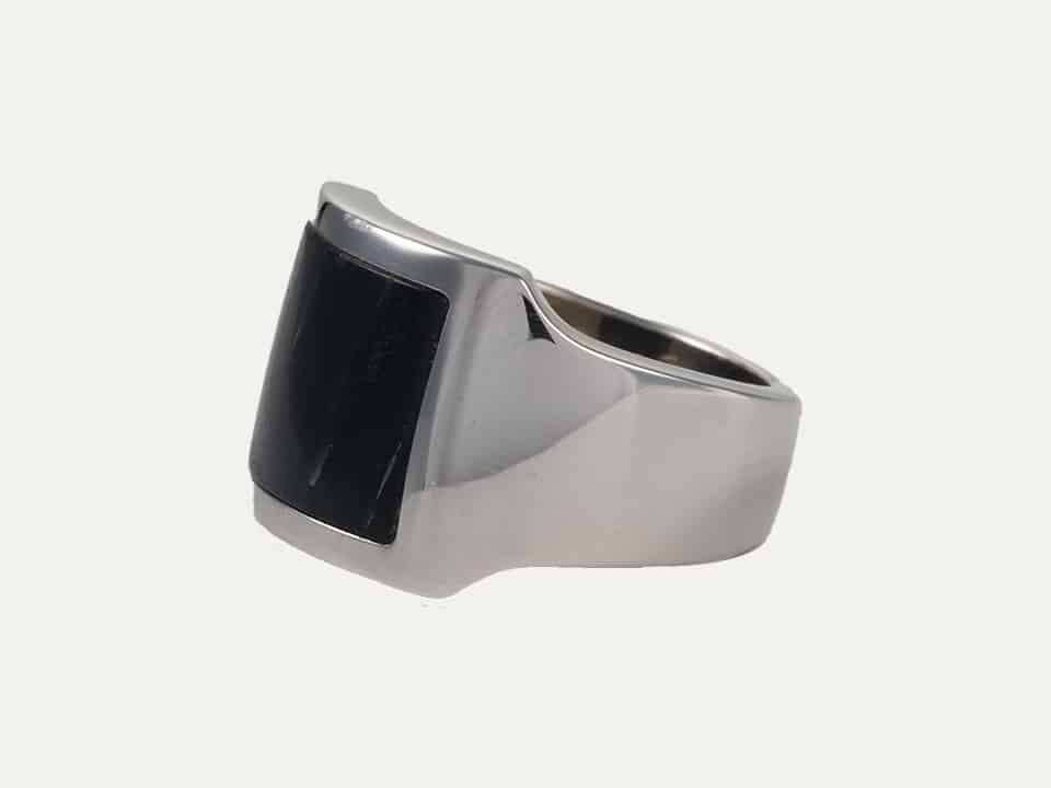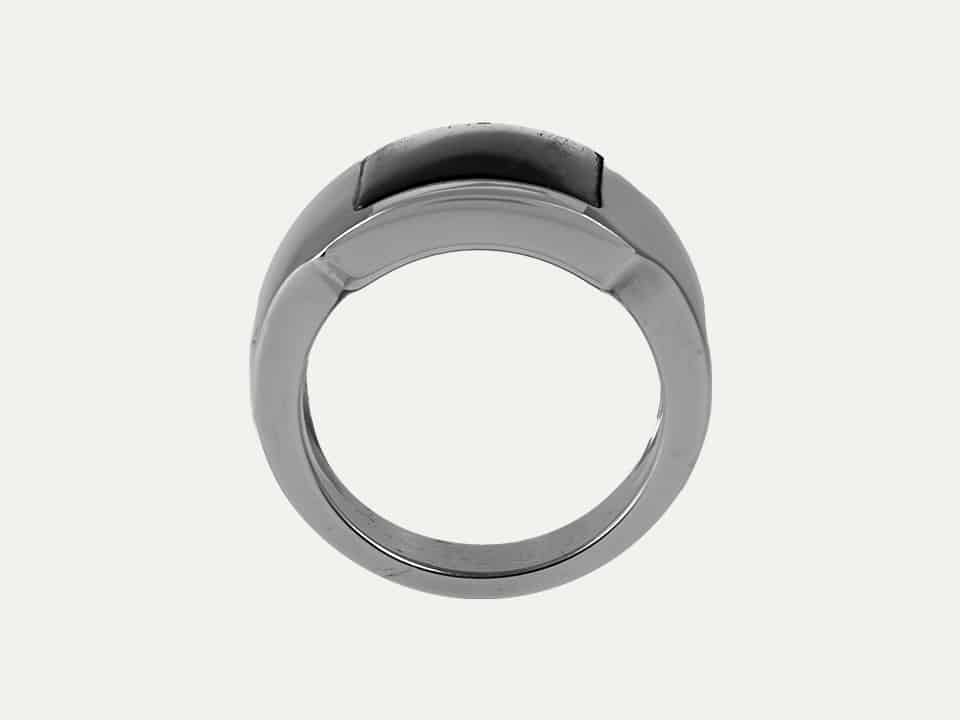 18kt – 750‰ Cartier Santos ring in white gold with hawk’s eye. Created by Louis Cartier. With original box and documents.