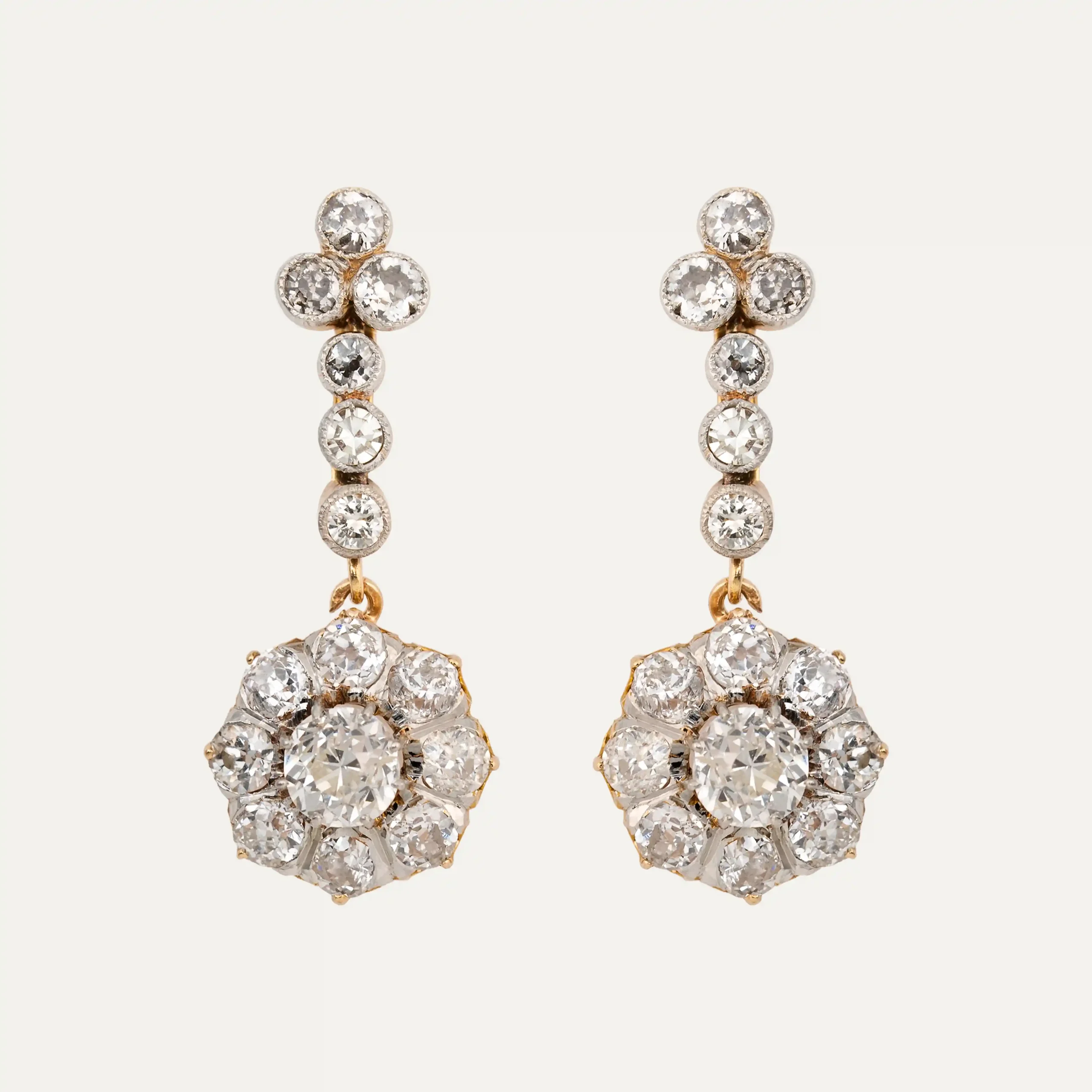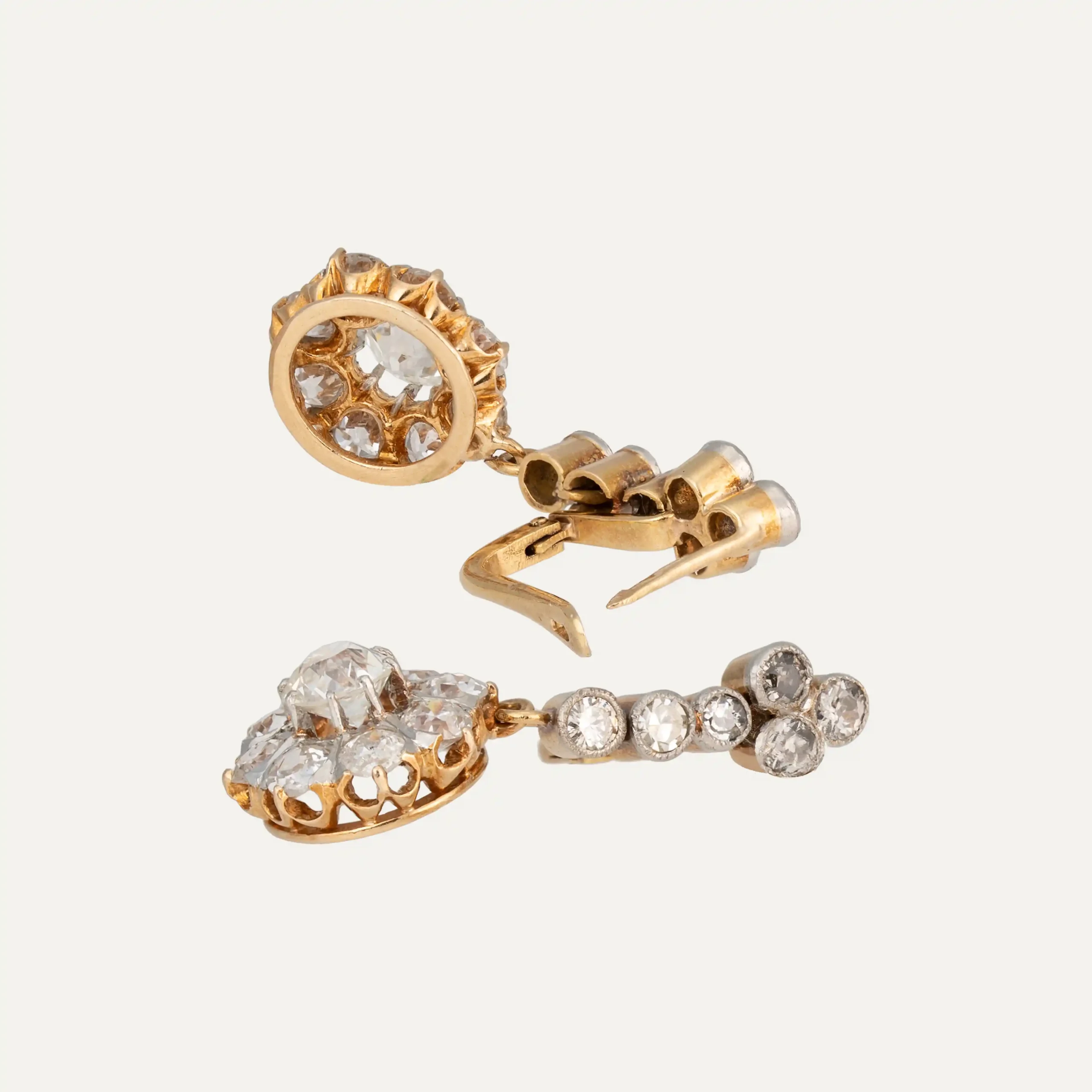 19.2 kt – 800 ‰ antique Portuguese gold earrings, delicately craftedand enriched with antique-cut diamonds. Each earring features a flower-shaped pendant, composed of a central diamond surrounded by eight diamonds. The upper part is adorned with diamonds set in white gold, totalling approximately 1.6 ct. Hook and loop system.