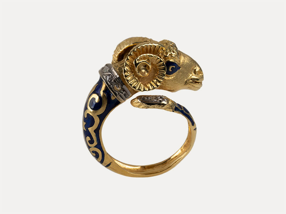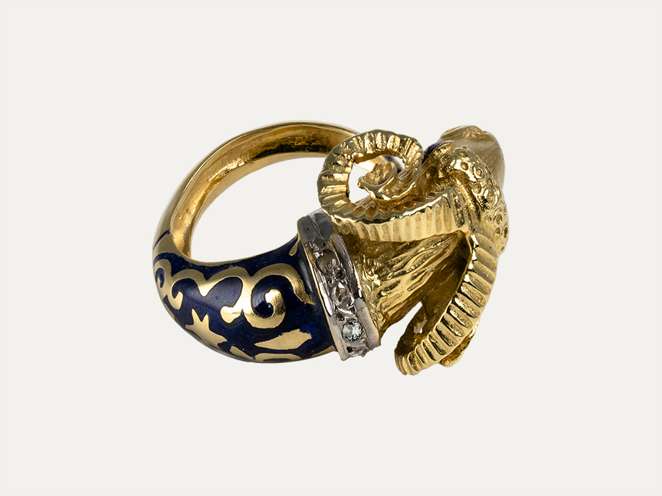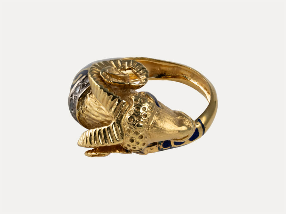 14kt – 585‰ yellow gold ring with Ram’s head, blue enamel and 6 small diamonds
