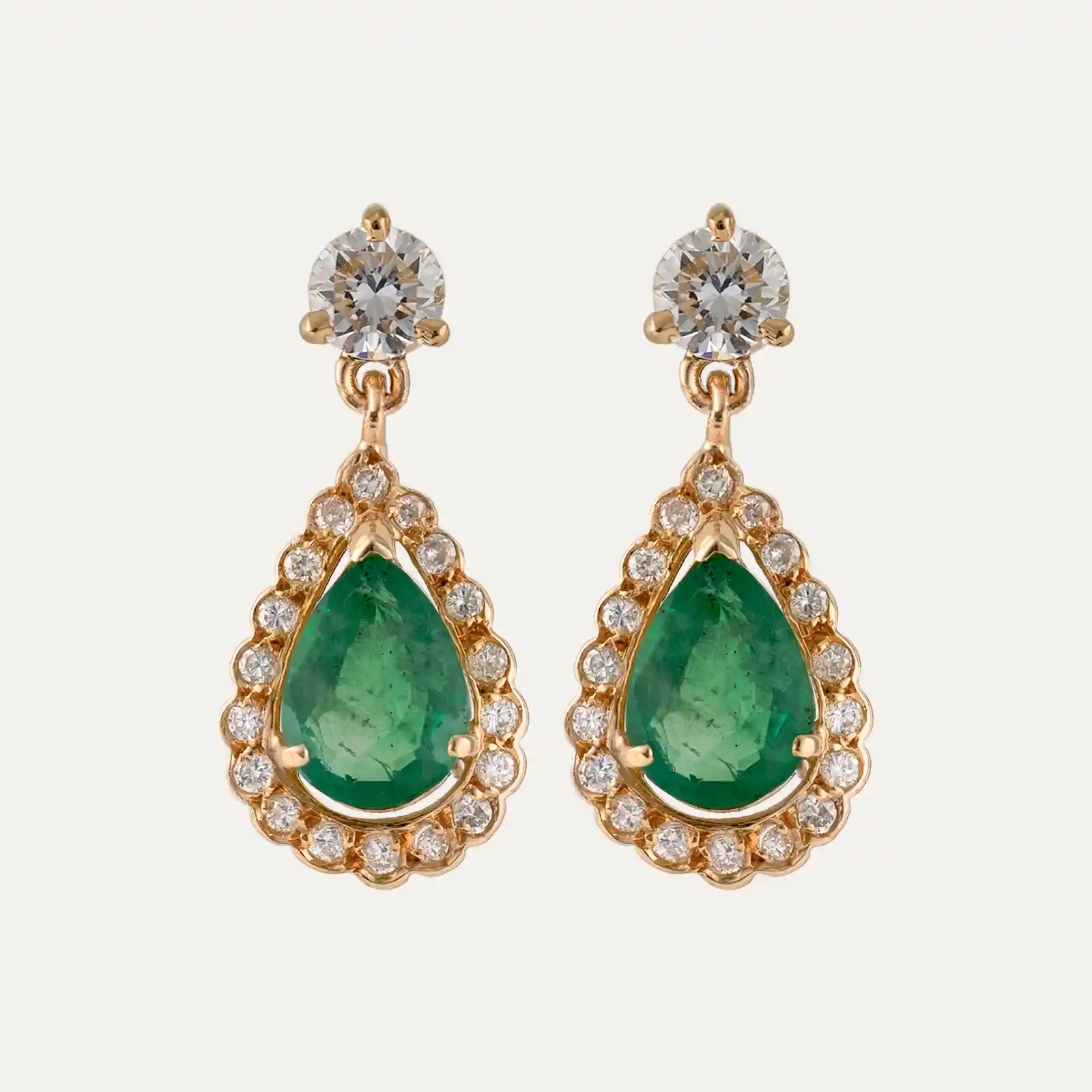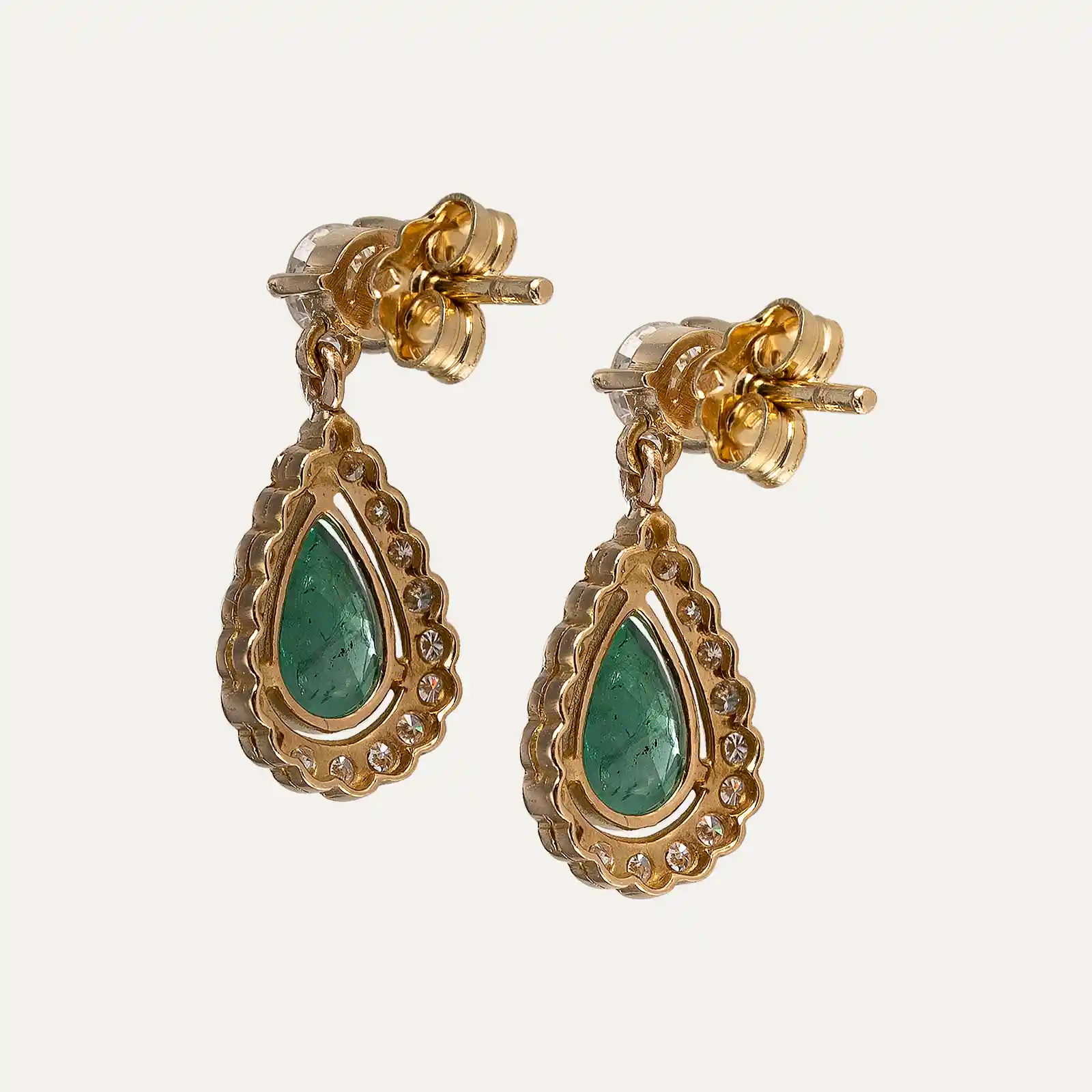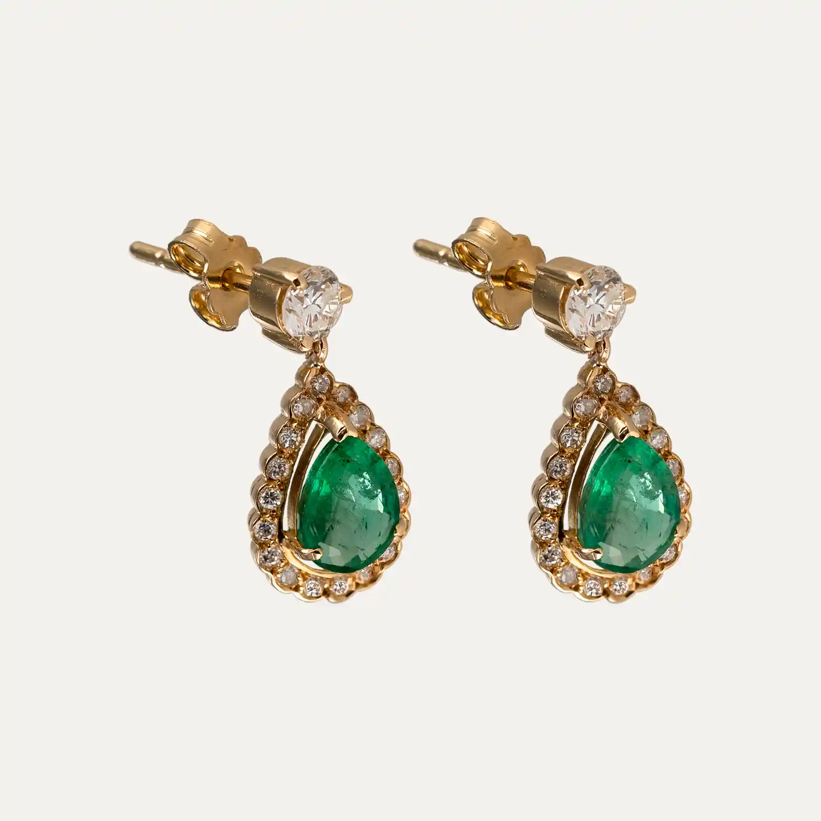 19.2kt – 800‰ yellow gold earrings, with 2 pear-cut emeralds about 1.68ct, surrounded by a frame of 36 brilliant-cut diamonds and 2 brilliant-cut diamonds at the top of the earrings about 0.676ct in total. Butterfly spring system with spikes.