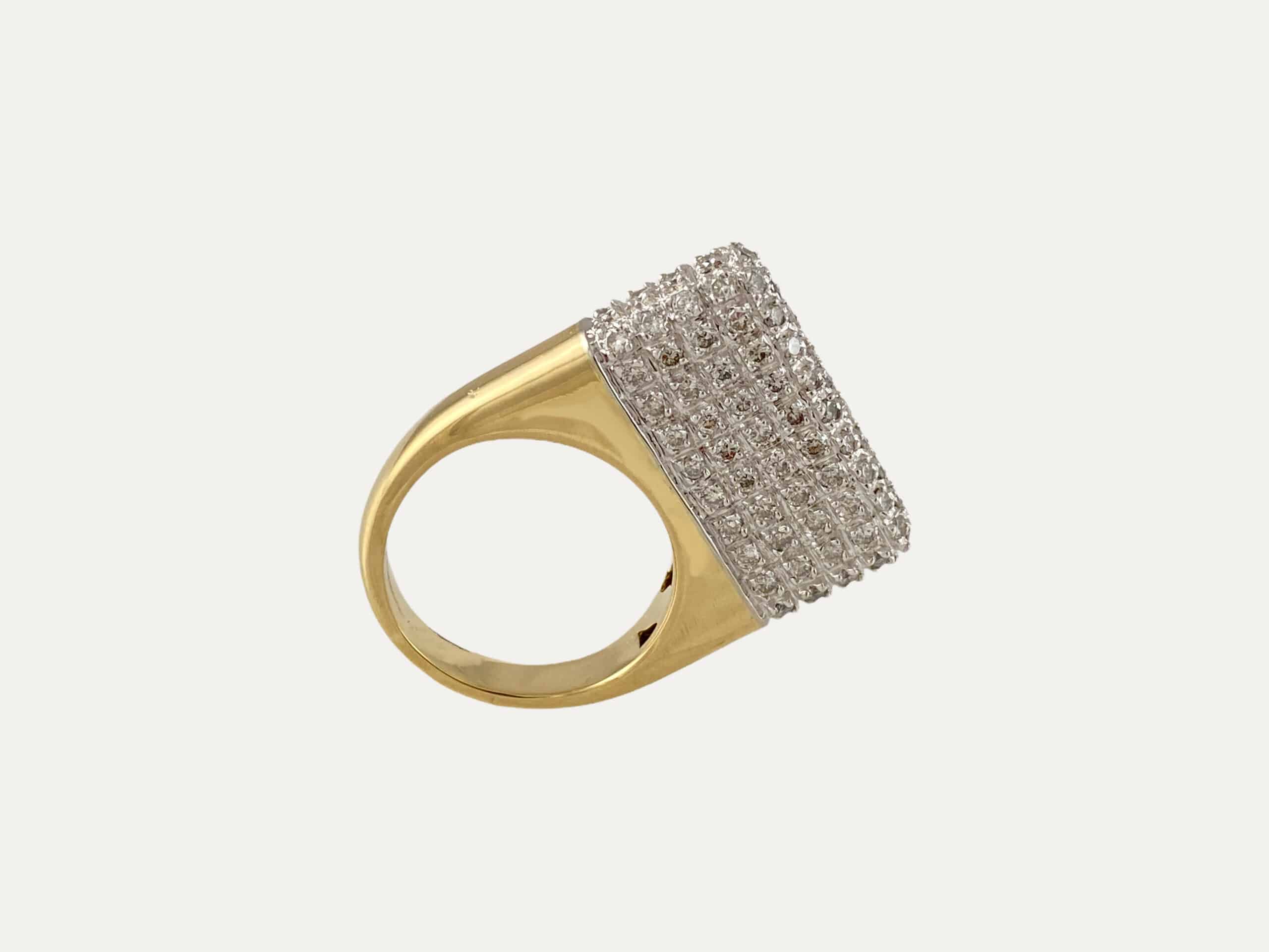 18 kt – 750 ‰ yellow gold ring and paveÌ with brilliant cut diamonds, circa 1.30 ct, set in 18 kt – 750 ‰ white gold.