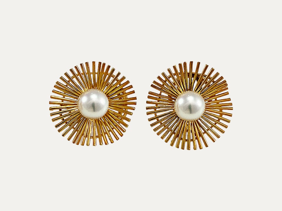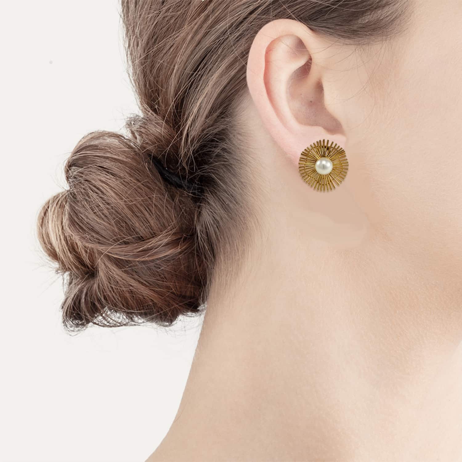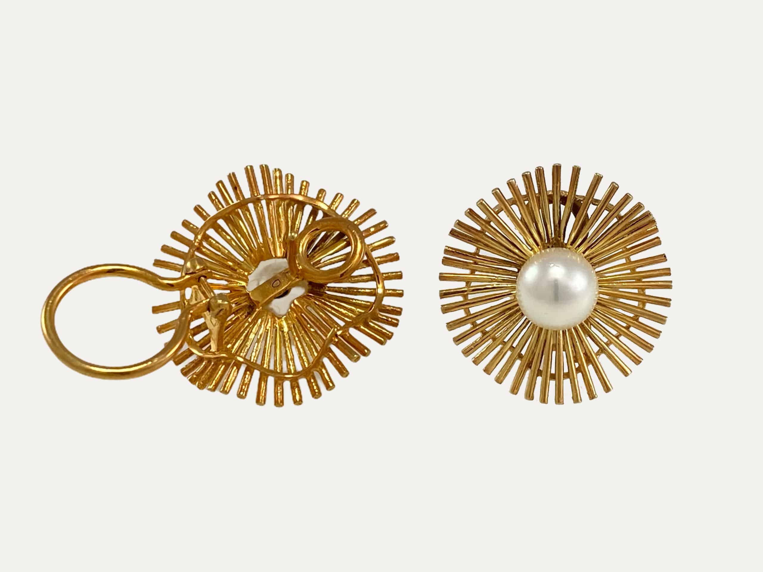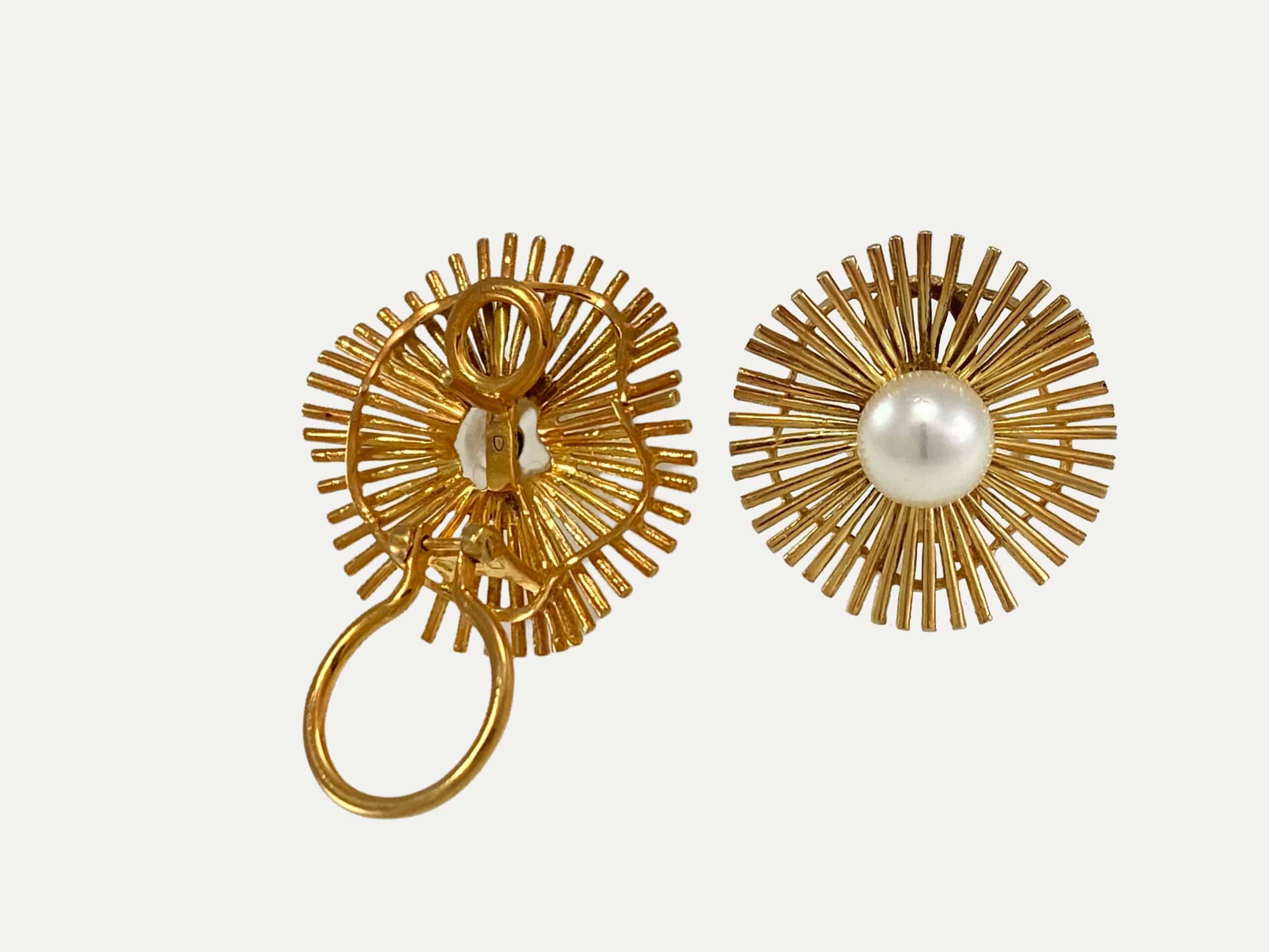 Pair of 18 kt – 750 ‰ yellow gold flower earrings with 7.25 mm diameter round white pearls in the center. The earrings are 2.1 cm in diameter. With posts and omega backs.