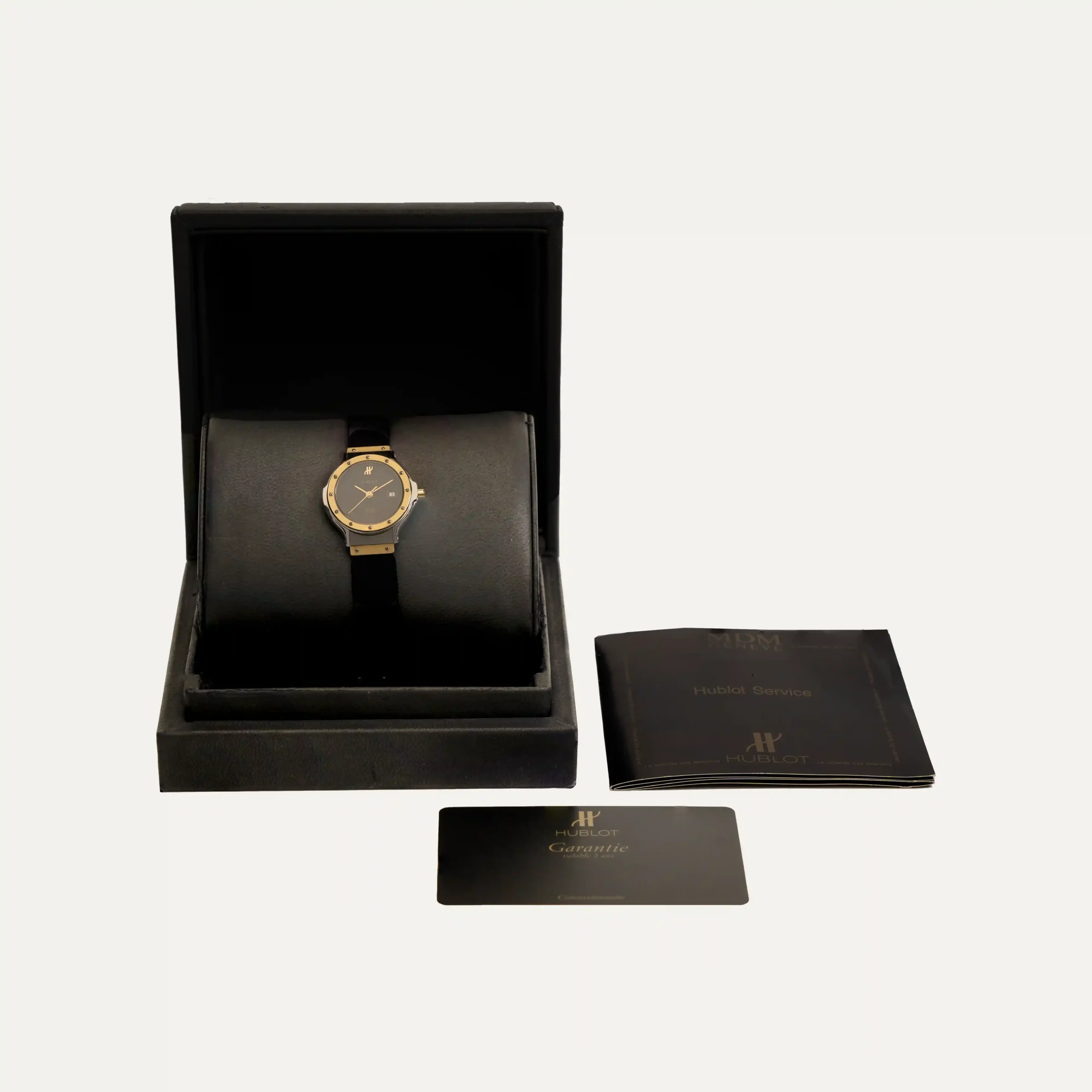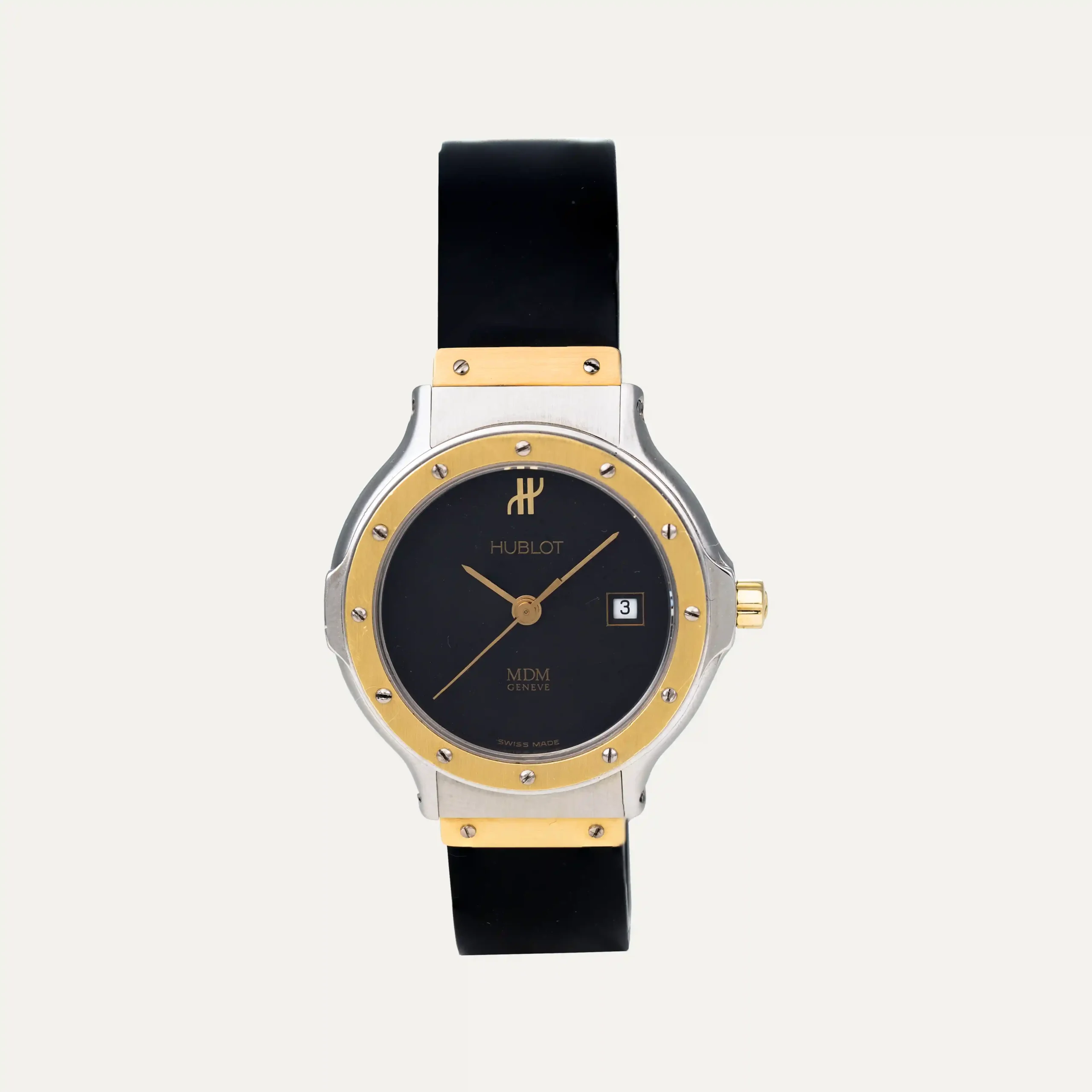 Hublot MDM Quartz Movement Watch. Case in stainless steel and 18kt – 750‰ yellow gold, bezel in gold secured by visible screws. Diameter of 28mm and thickness of 7.5mm. Black dial, hour, minute, and second hands, date at 3 o’clock. Crown in steel and gold with Hublot logo. Sapphire crystal. Black rubber strap with double folding clasp in steel and gold. Year 2004. Original Hublot box and documents. This watch is backed by our one-year warranty.