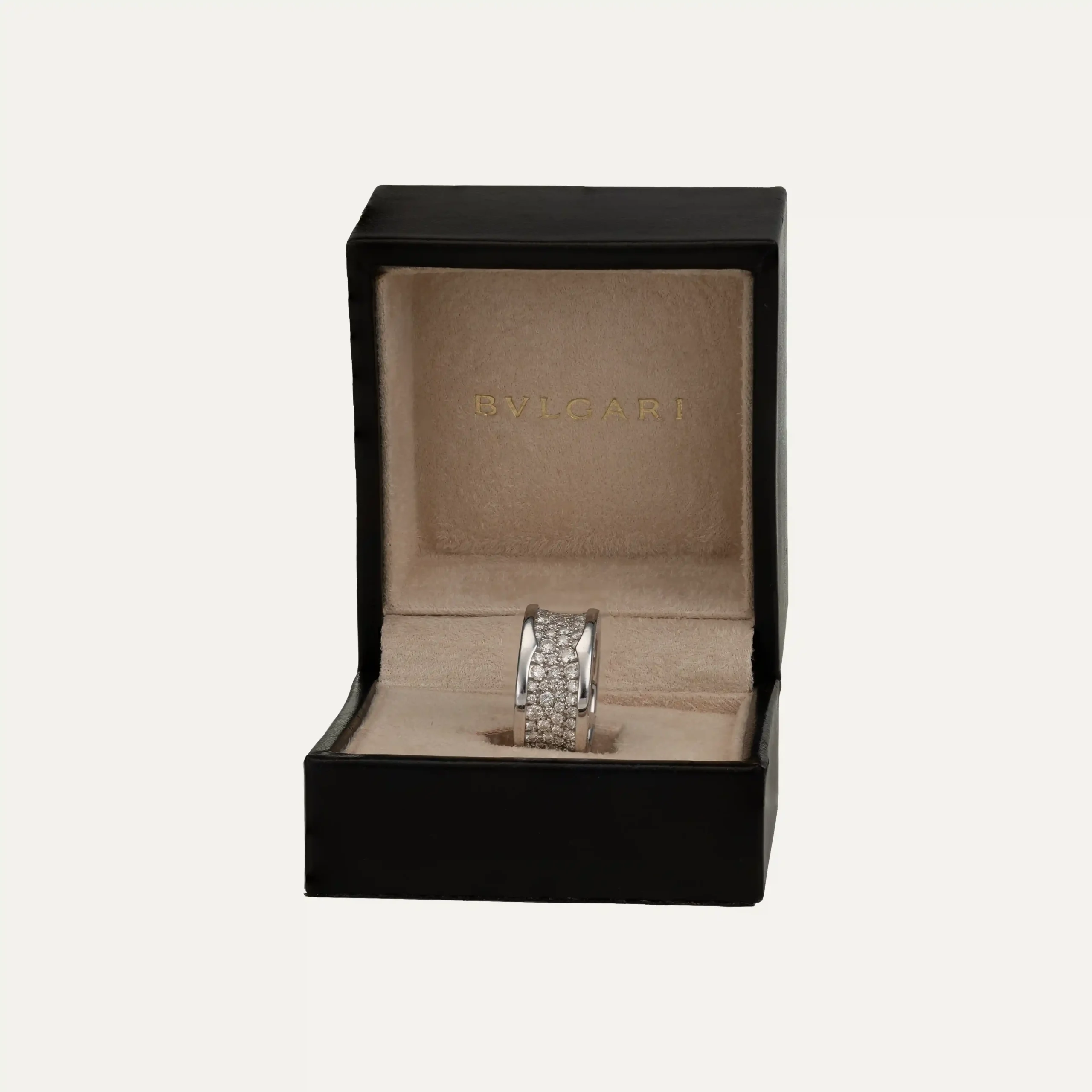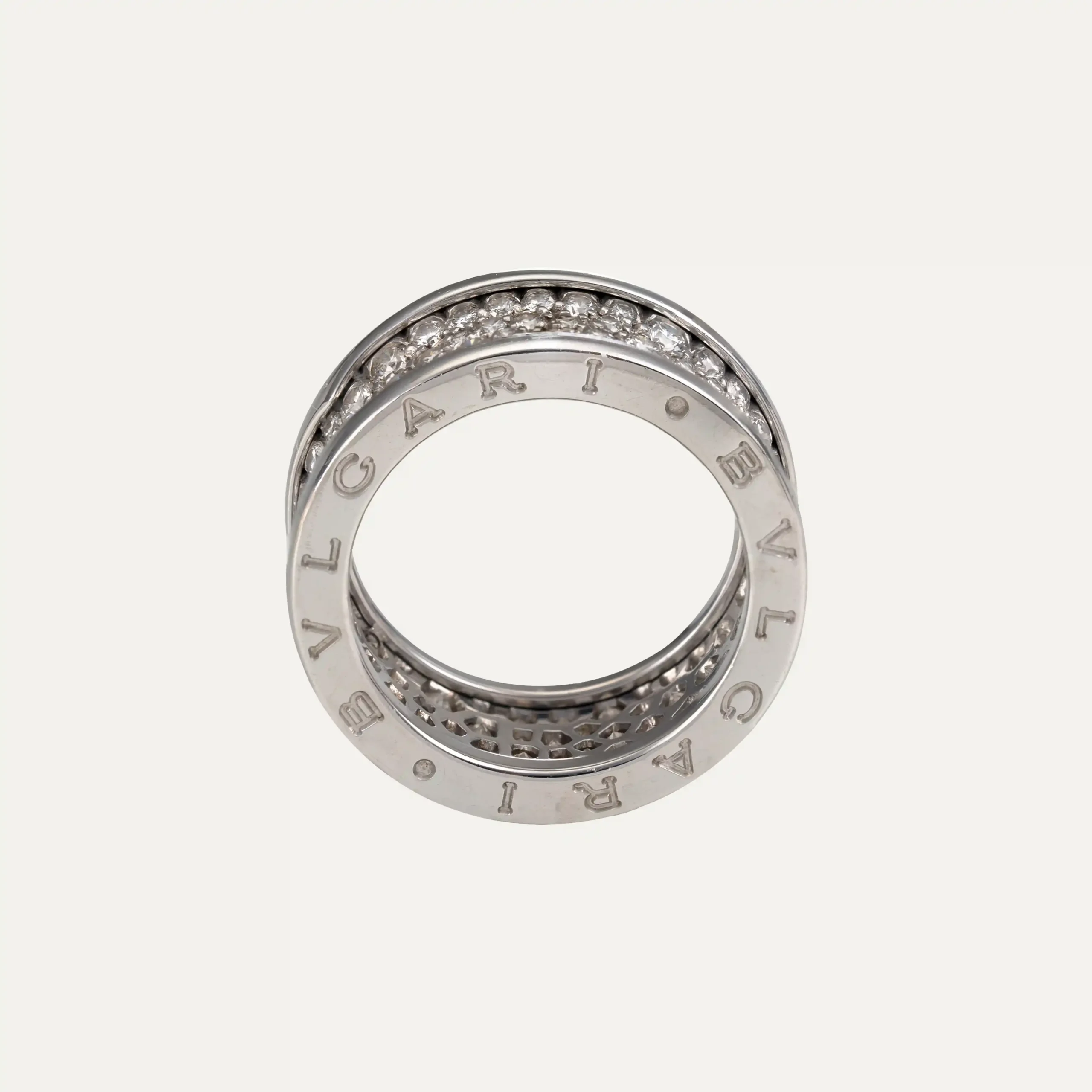 Bulgari 18kt – 750‰ white gold ring with diamond pavé, from the B.zero1 collection. It combines modern design with inspiration from Roman architecture. Its spiral shape symbolises new beginnings and innovation. Created in 1999 to celebrate the Millennium. With original box and Bulgari documents.