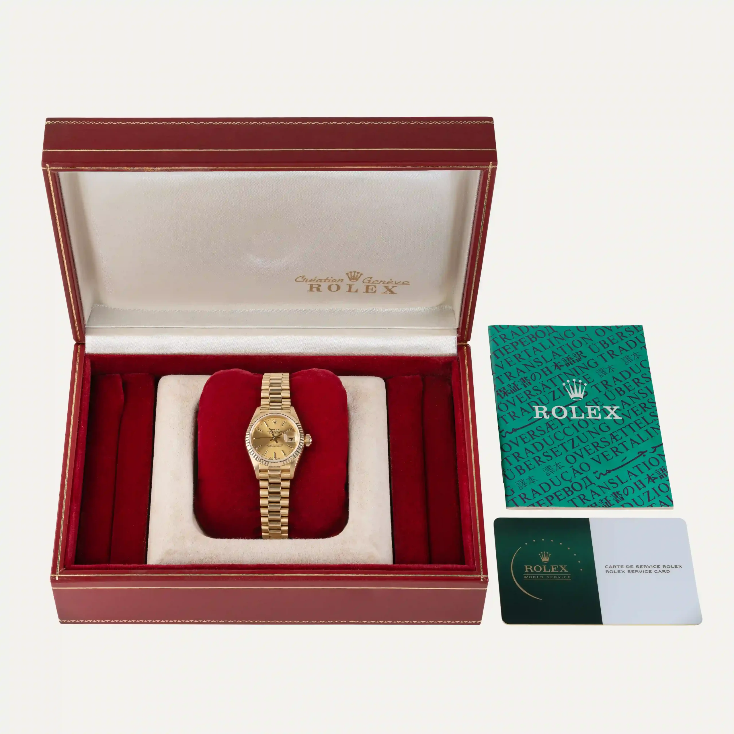 Rolex Datejust watch, automatic movement, 26 mm in diameter and 11.5 mm thick. 18kt – 750‰ yellow gold case, fluted gold bezel, gold dial with index, hour, minute and seconds hands, date at 3 o’clock. Screw-down crown with Rolex logo. Sapphire crystal. Gold bracelet with foldover clasp. Rolex box and documents. “The Watch Register” certificate. This watch is supported by our one-year guarantee.