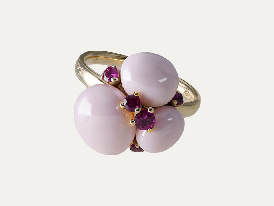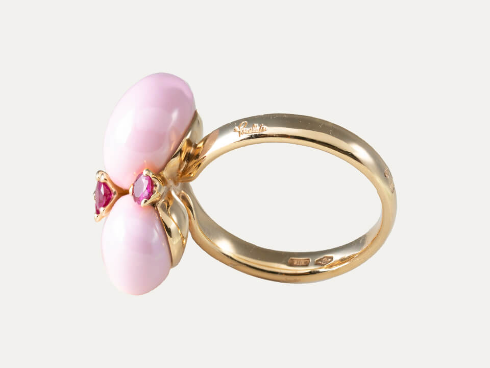18kt – 750‰ rose gold Capri Pomellato ring with ceramic and 5 round and faceted rubies. Original box and documents