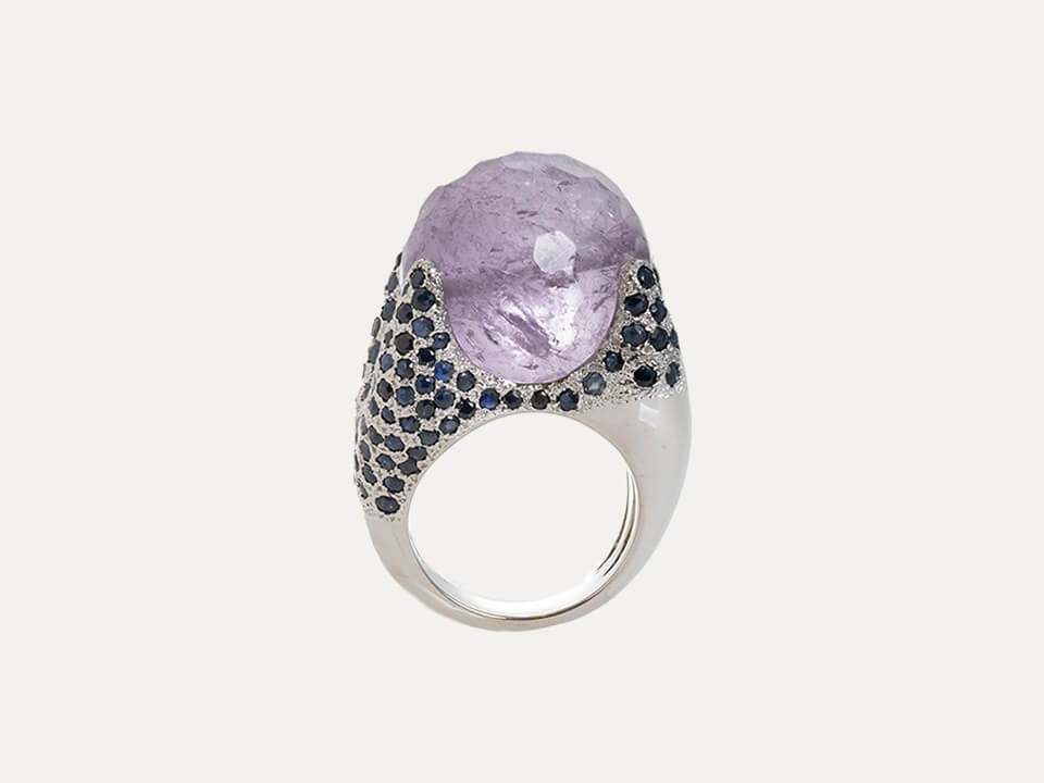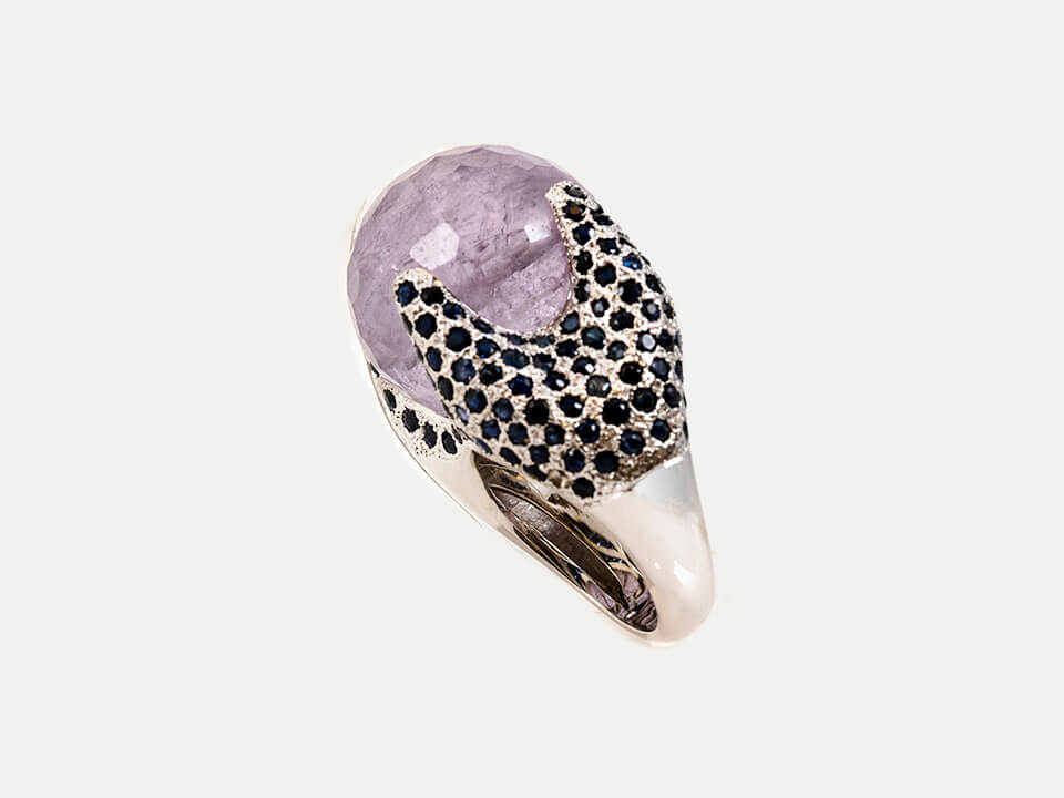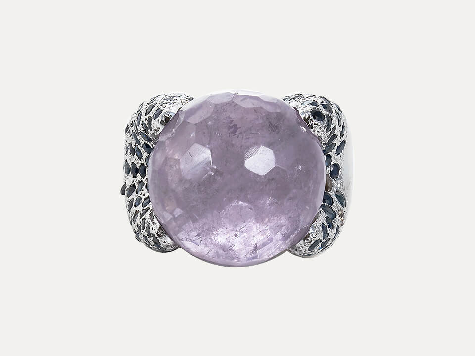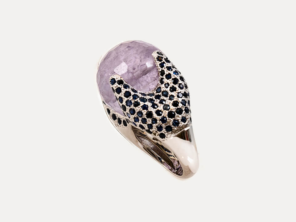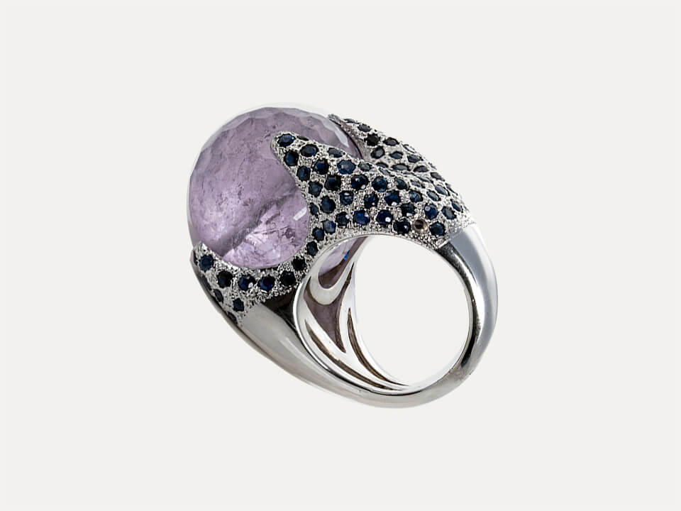 18kt – 750‰ white gold ring with 1 faceted spherical amethyst with 20.0mm diameter in the center, surrounded by blue sapphires. Polished finish