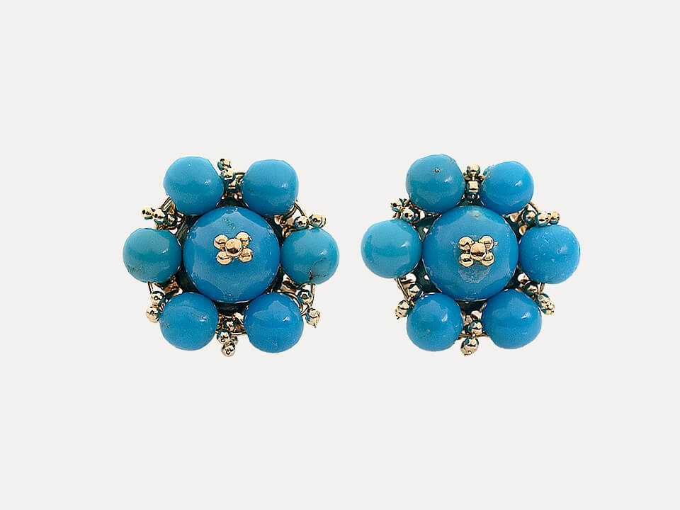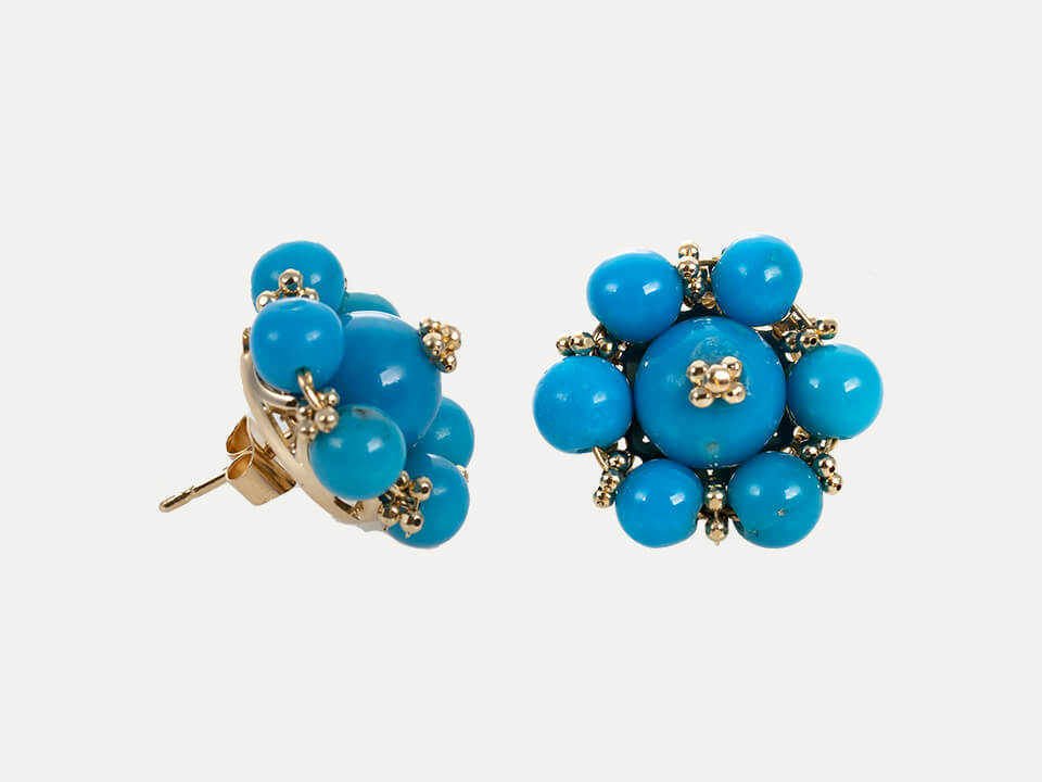 18kt – 750‰ yellow gold with 2 larger round turquoises in the center surrounded by 12 smaller round turquoises. Butterfly spring system with spikes.