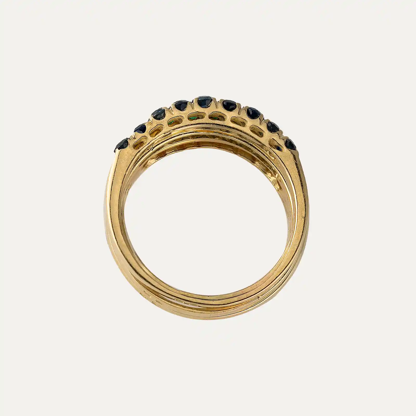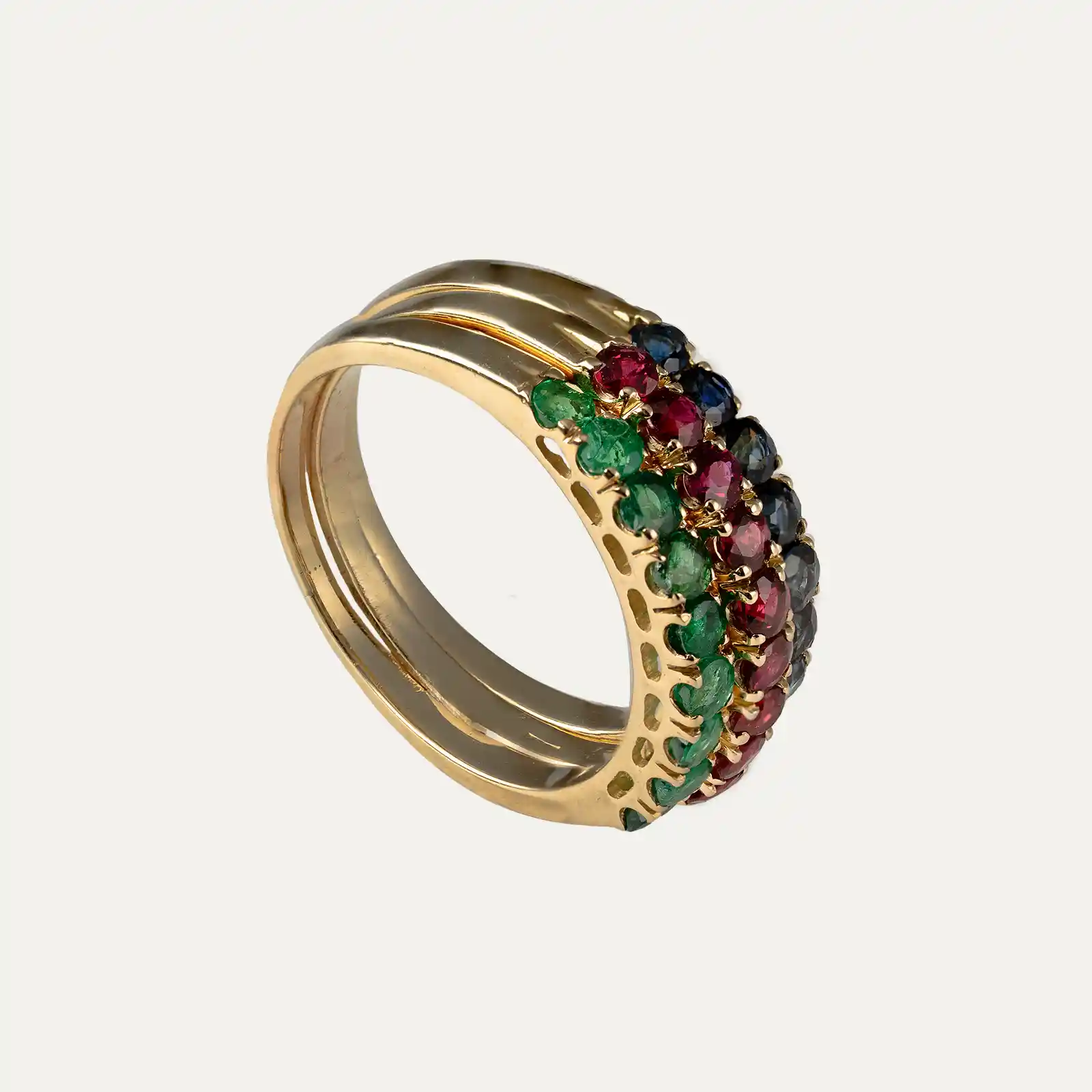 18kt – 750‰ yellow gold ring, composed of three movable rings, one with 9 emeralds, another with 9 rubies and the third with 9 sapphires. The rings can be worn together or separately, providing versatility and elegance.