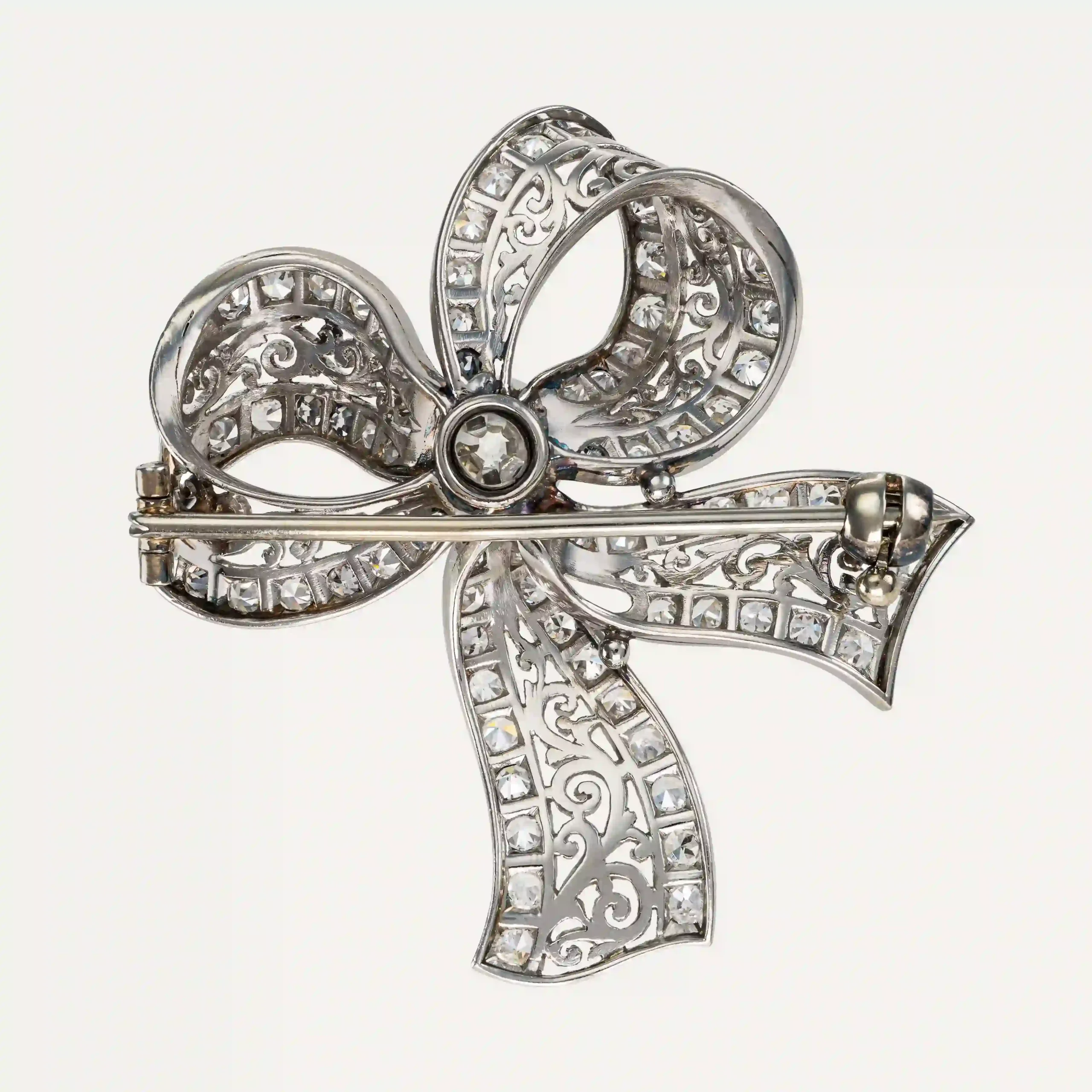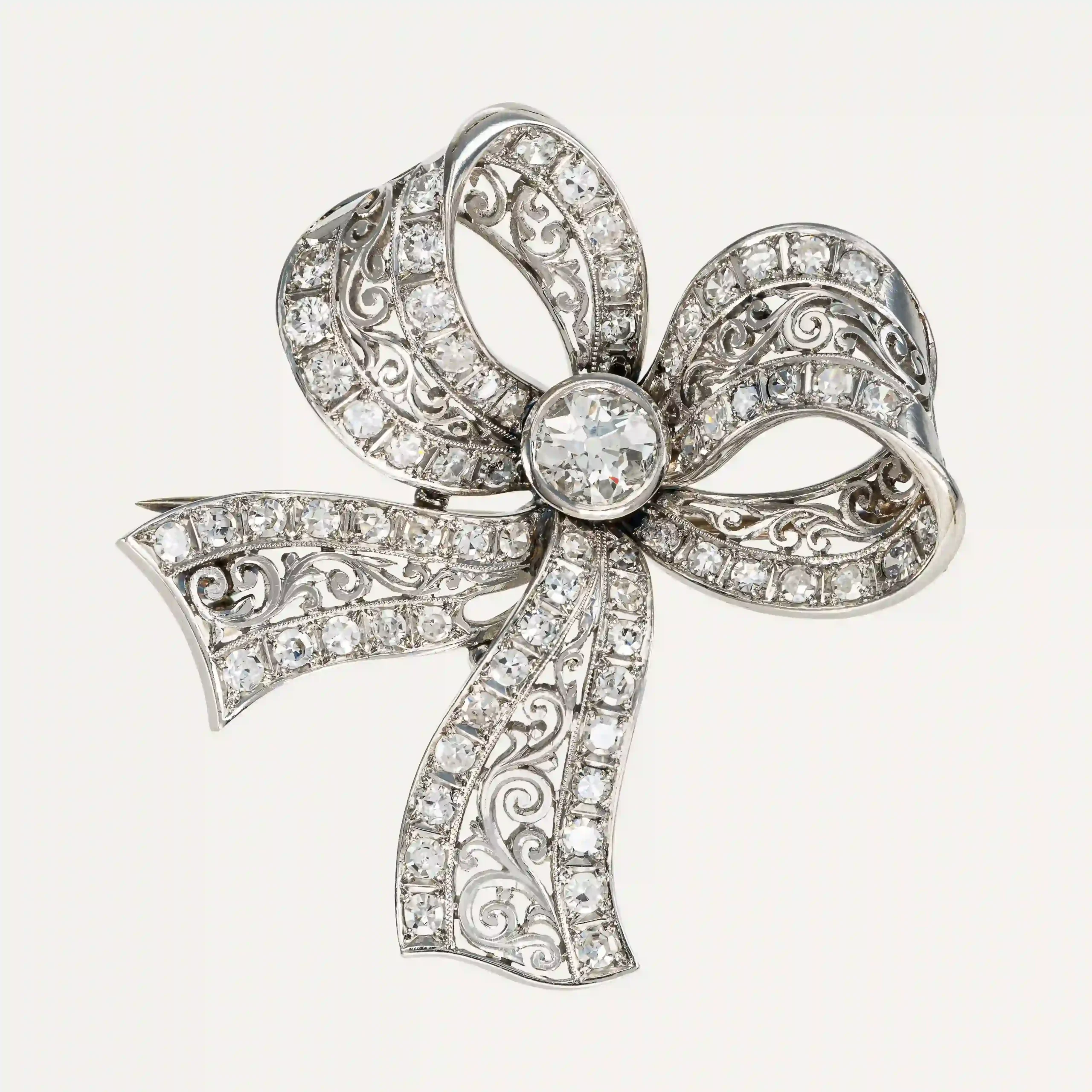 Alfinete, em forma de laço, em ouro branco 19.2 kt – 800 ‰ cravejado com 1 diamante talhe antigo europeu com cerca de 0,71 ct e 70 diamantes talhe 8/8 que totalizam 2,1 ct. Fecho com espigão seguro. Portugês, cerca de 1910. Sem marcas, ao abrigo do Decreto-Lei nº 120/2017, de 15 de Setembro – art. 2º, nº 2, alínea c).