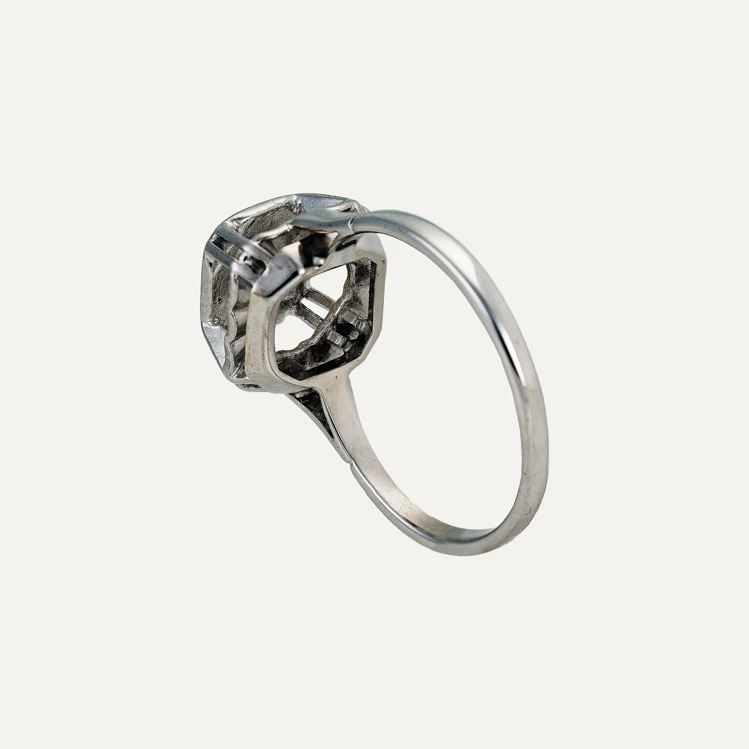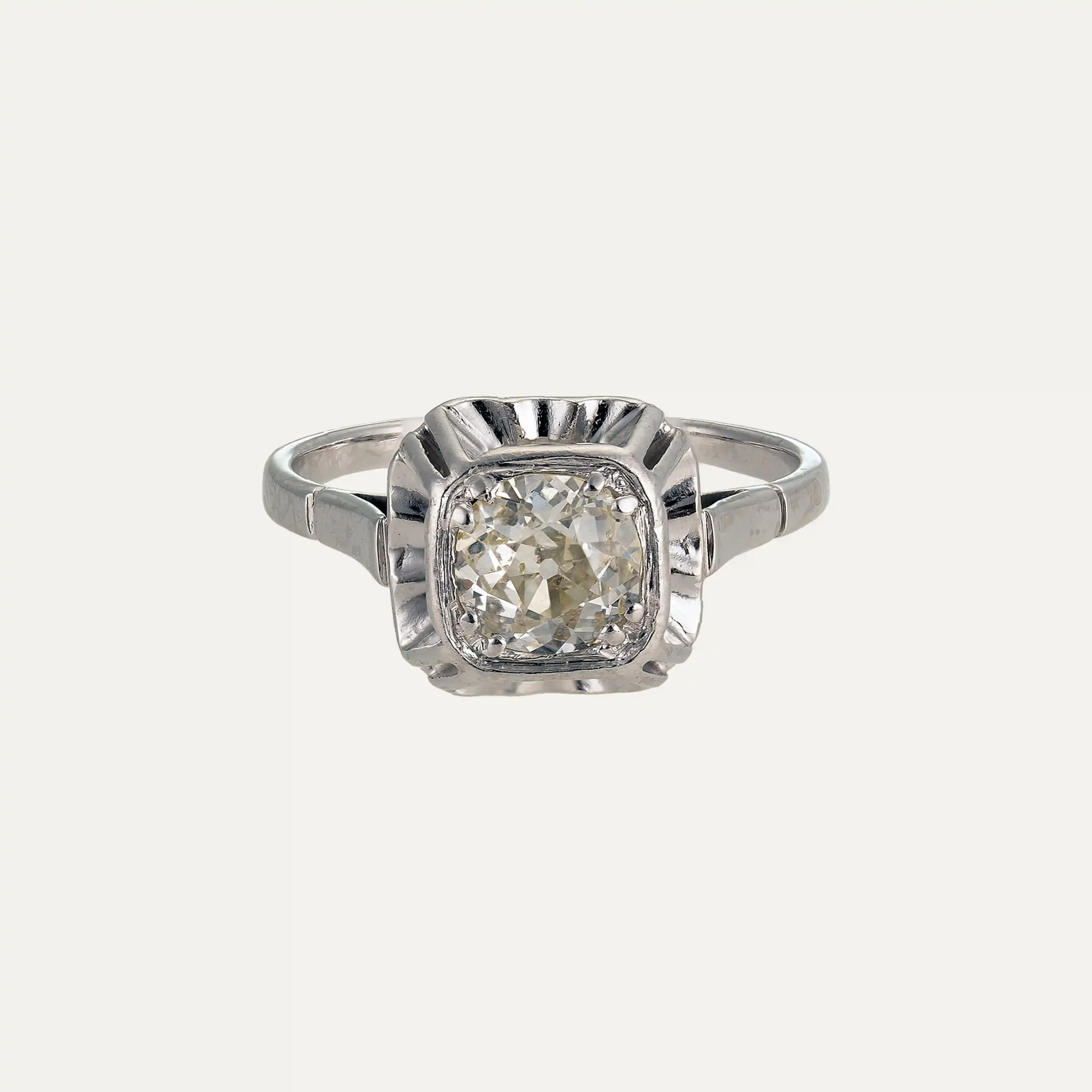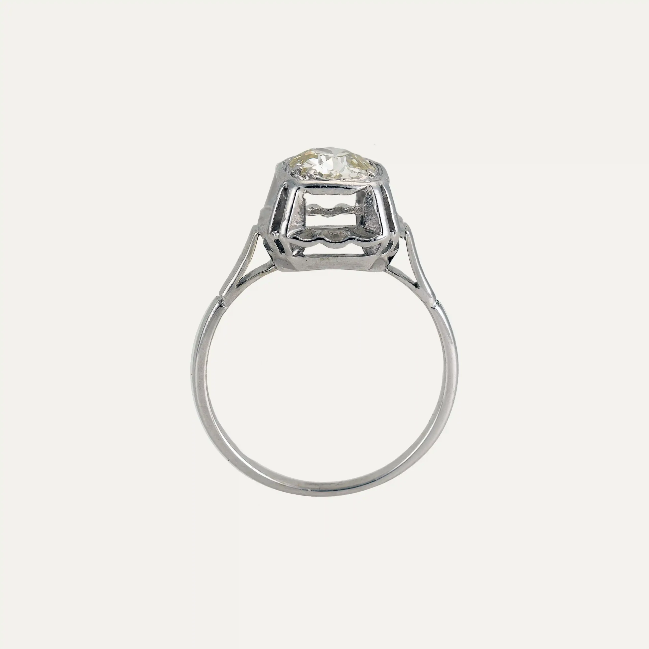 Anel em ouro branco 14kt – 585‰, com um diamante talhe brilhante antigo ao centro, com cerca de 1ct, (VVS2, K/L). Sem contraste ao abrigo do Decreto-Lei n.º 120/2017, artigo 2, nº 2, alínea C e artigo 3.