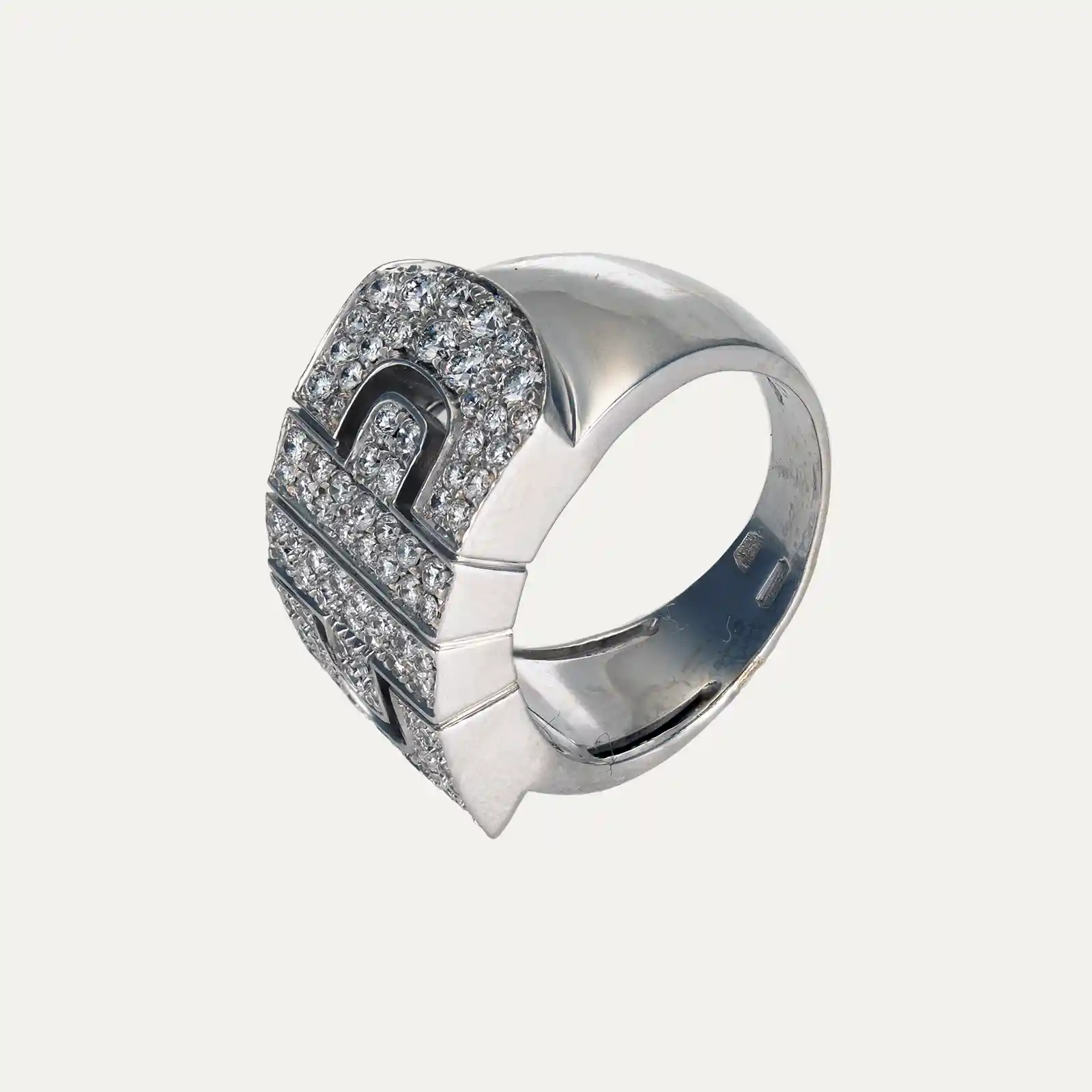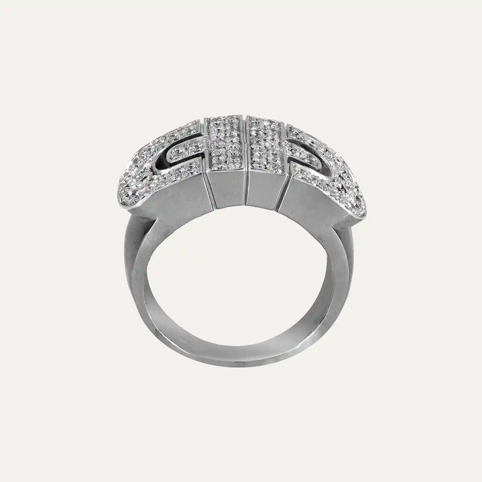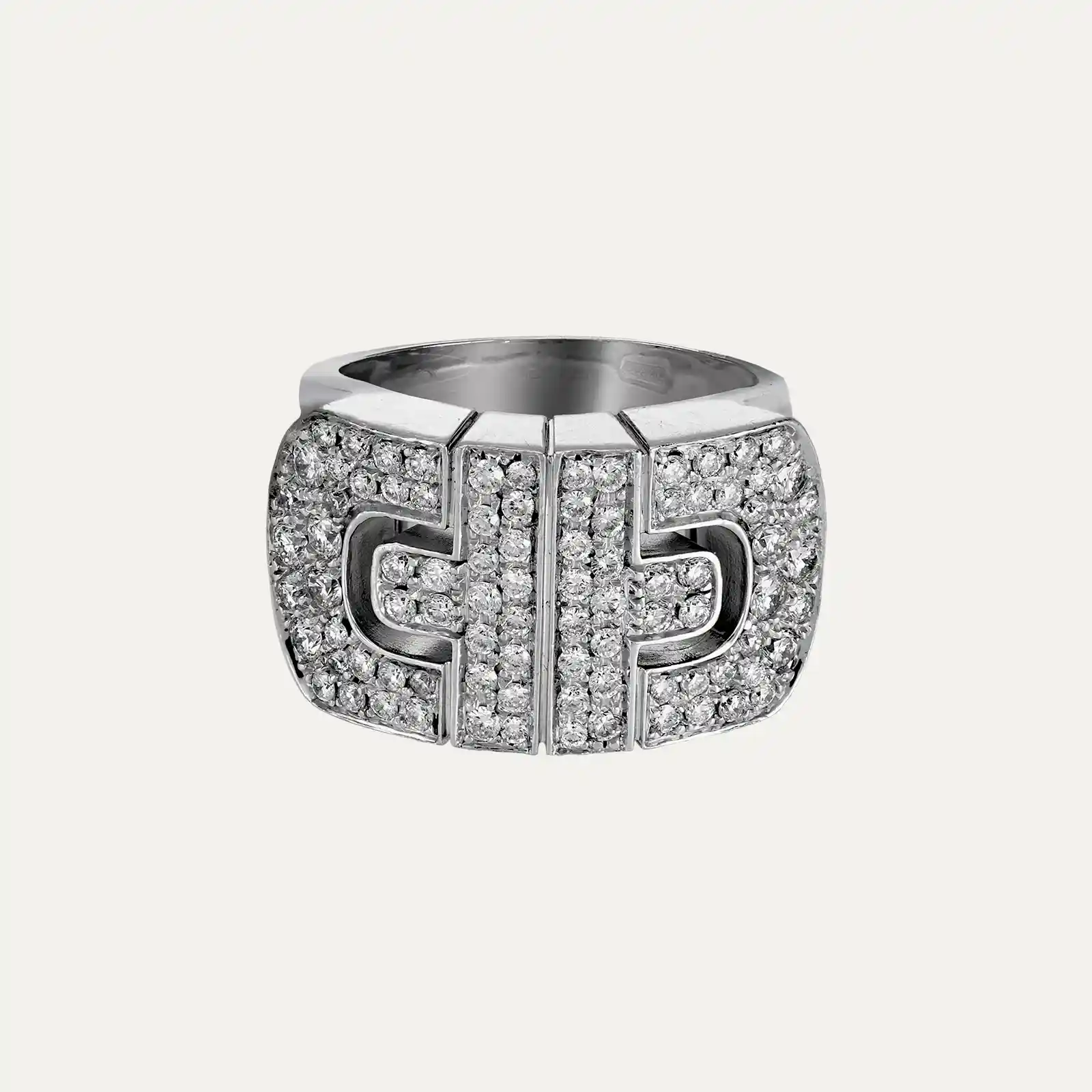 Anel Bulgari ouro branco 18kt – 750‰, da coleção Parentesi. Inspirado no icónico design Parentesi, com um padrão entrelaçado e geométrico que evoca as pedras de calçada que cobriam as antigas estradas de Roma. Cravado com pavê de 88 diamantes talhe brilhante com cerca de 1.14ct no total, cor G e pureza VS. Assinado Bulgari, marcas italianas. Este anel faz parte do conjunto com o fio da Ref:9003673.