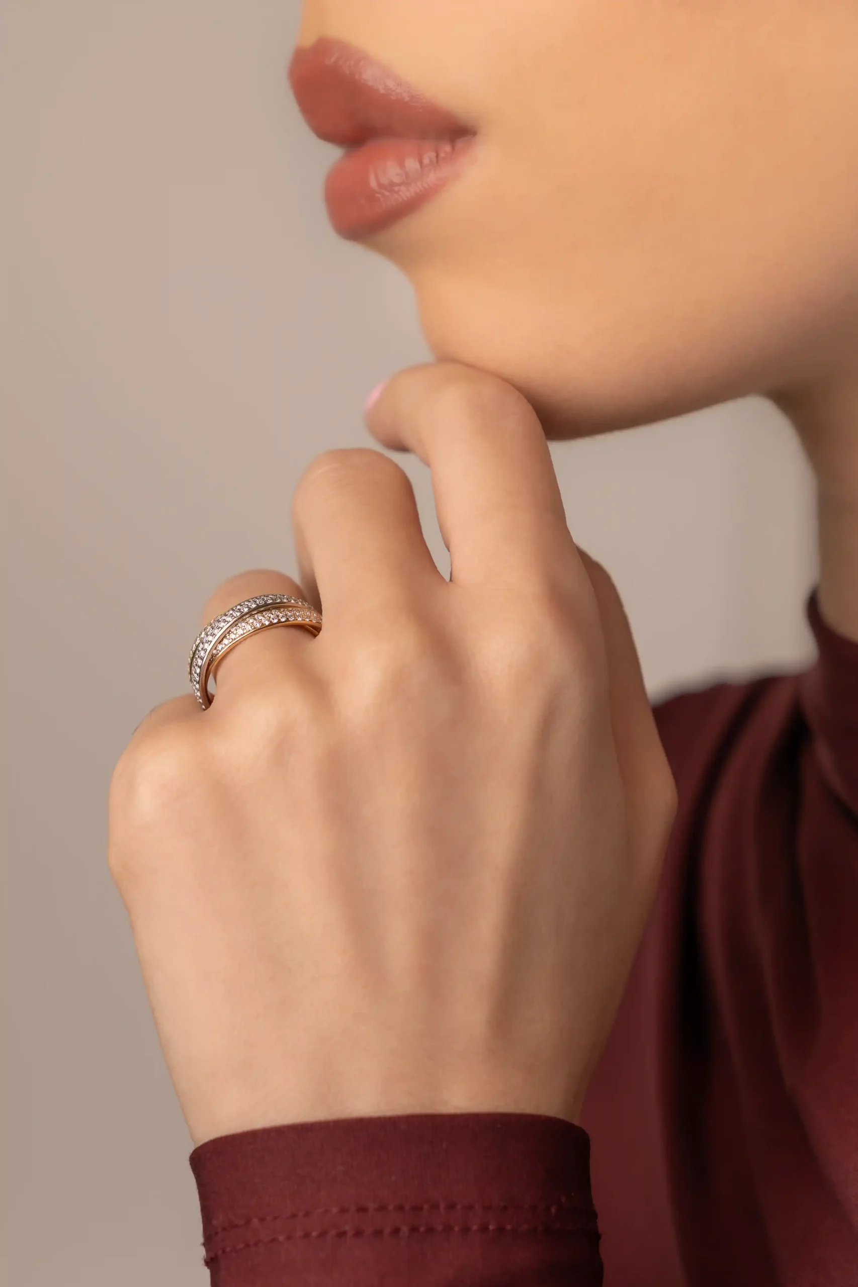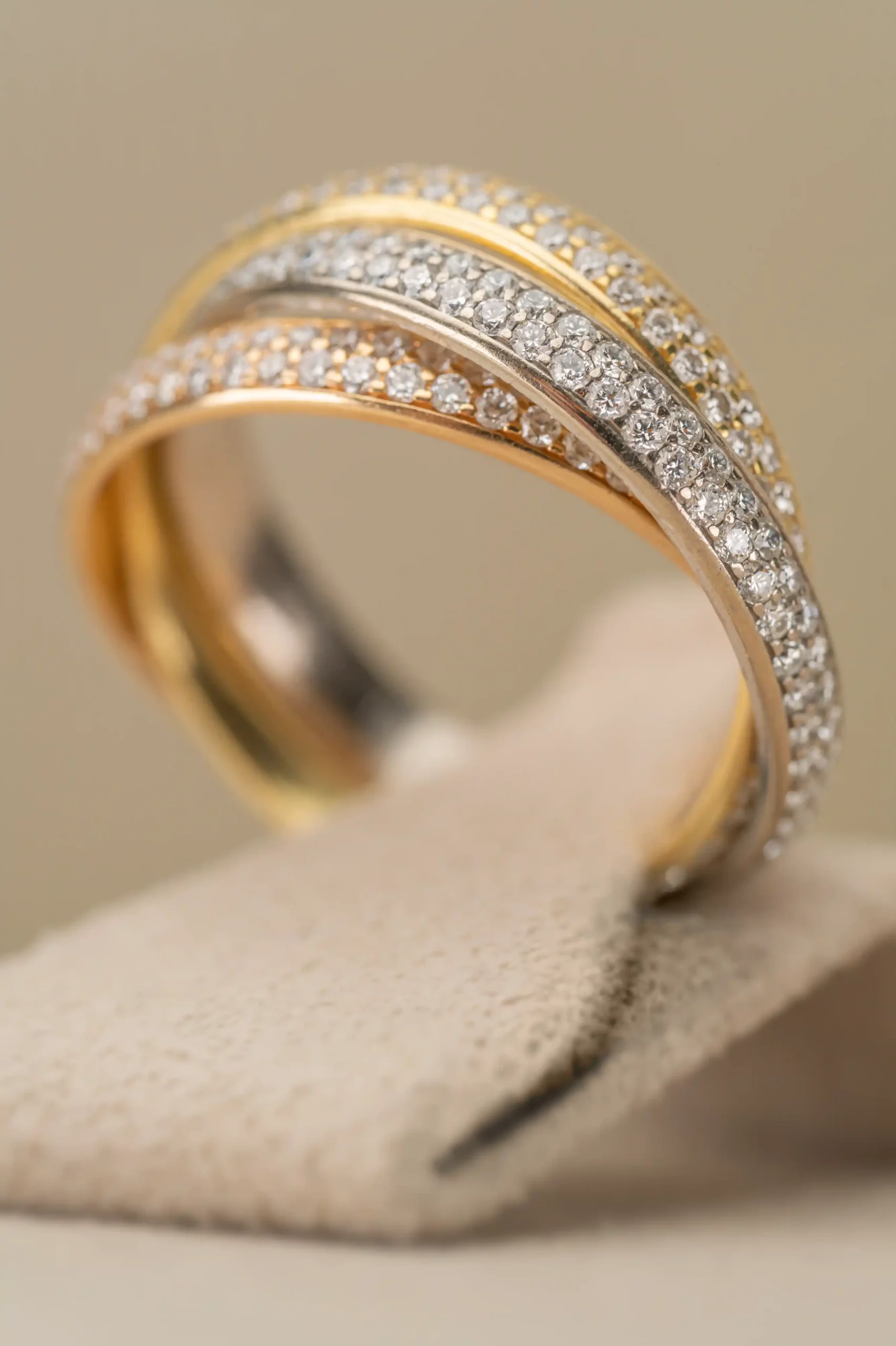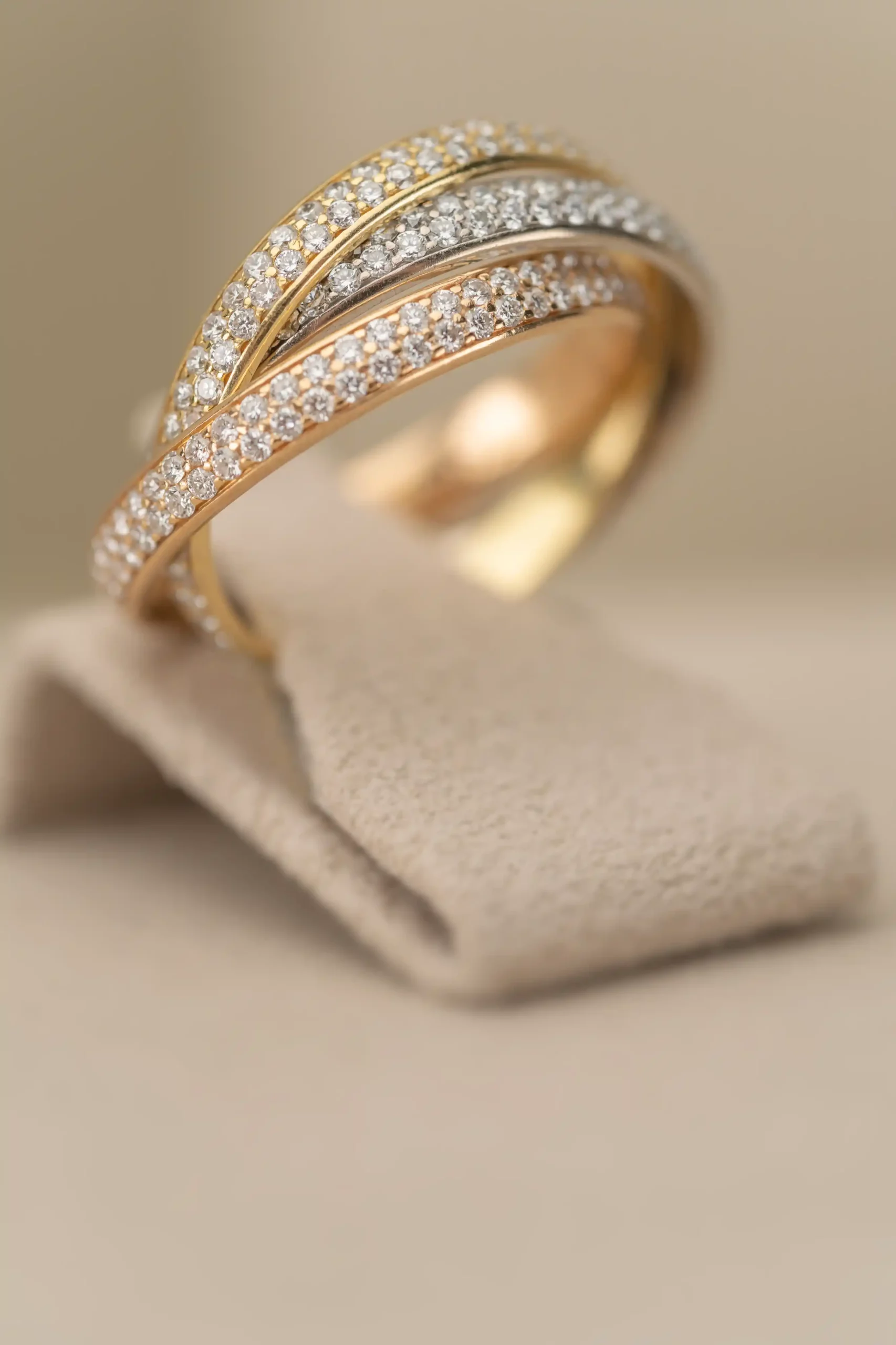 Cada faixa representa um valor intemporal: ouro rosa para o amor, ouro amarelo para a fidelidade e ouro branco para a amizade. Os delicados diamantes pavé acrescentam um brilho refinado, preservando a pureza do design clássico do Trinity.