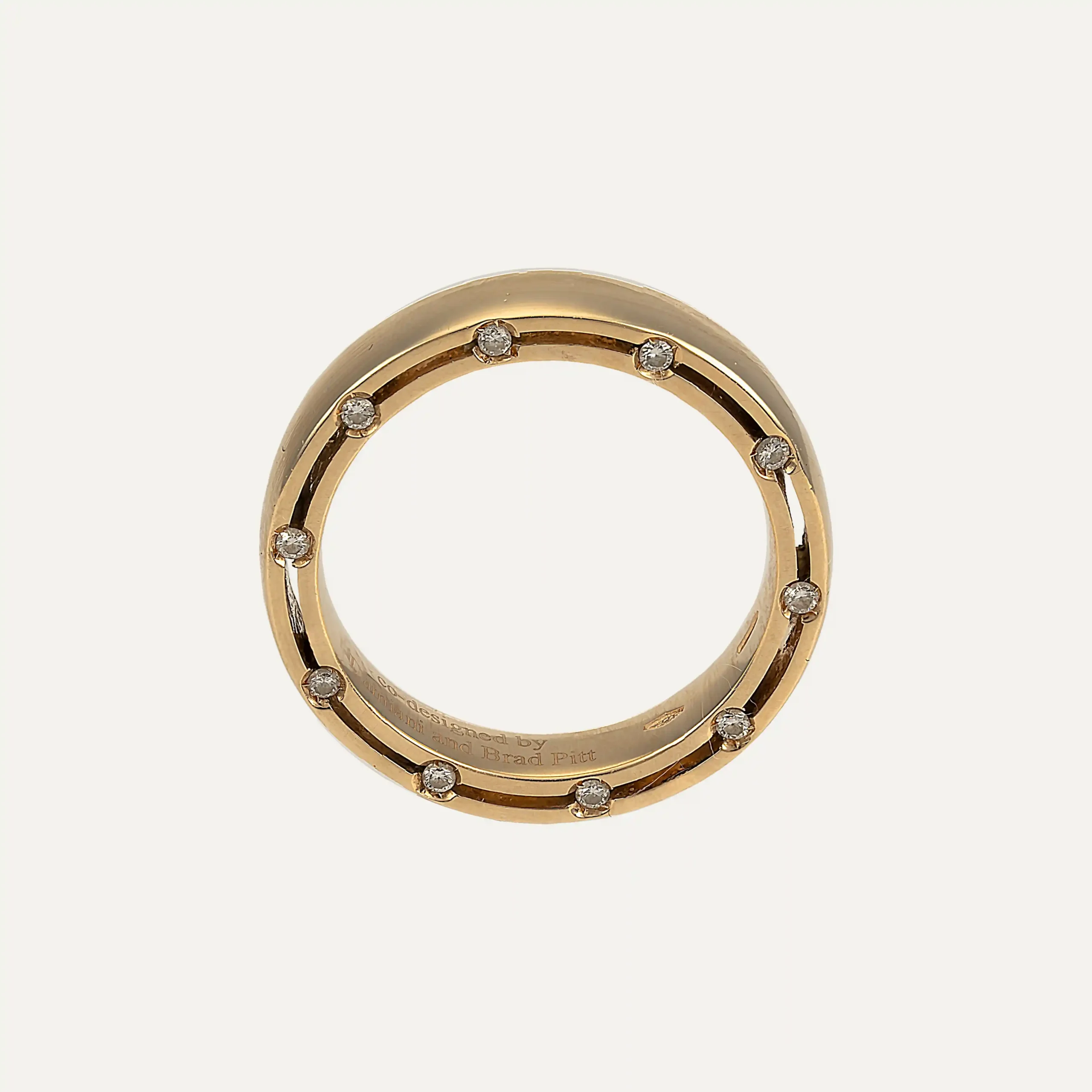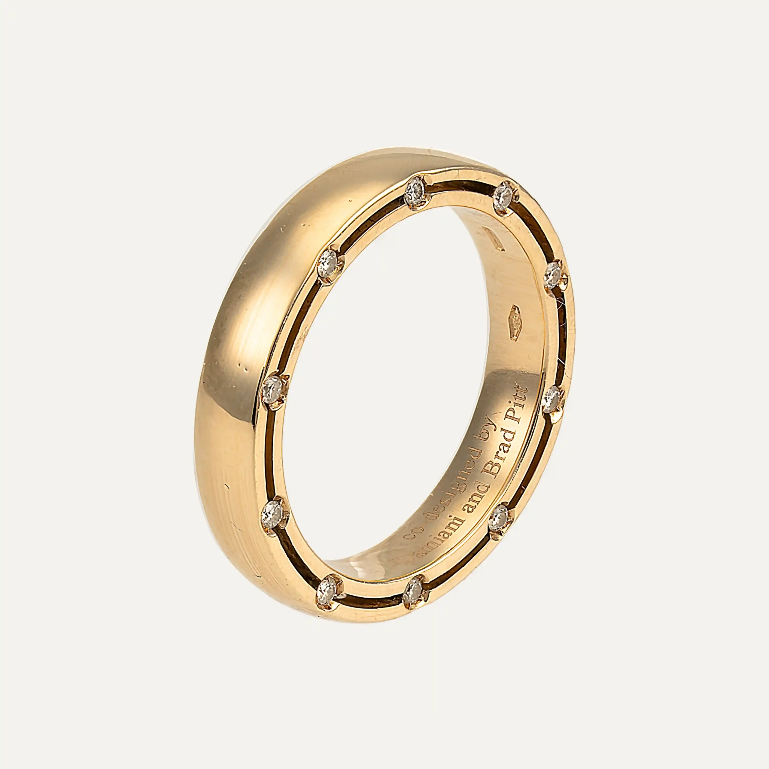 Anel Damiani ouro amarelo 18kt – 750‰, da coleção D.Side. Criado pelos mestres ourives de Valenza e Brad Pitt, celebra o amor com dois círculos concêntricos em ouro amarelo, unidos por 20 diamantes em talhe brilhante, com cerca de 0,20ct no total. Este design exclusivo celebra o amor e simboliza o vínculo eterno entre dois amantes, combinando elegância, significado e sofisticação. Assinado por Damiani e Brad Pitt.