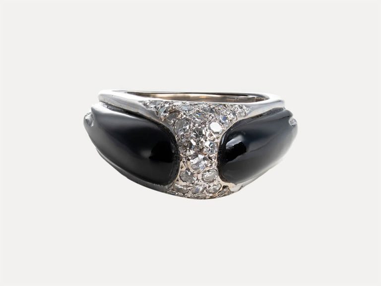Anel em ouro branco de 14kt – 585‰ cravado com 35 diamantes em talhe brilhante e 2 ónix nas laterais. Anel em forma de triangulo.