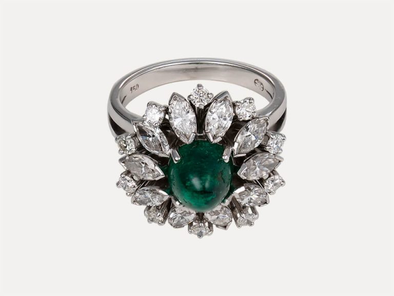Anel em ouro branco de 18kt – 750‰ e platina 900‰ cravado com 1 esmeralda ao centro em gota cabochão com cerca de 2.92ct, circundada por 10 diamantes talhe navete de 1.9ct e 10 brilhantes de 0.44ct