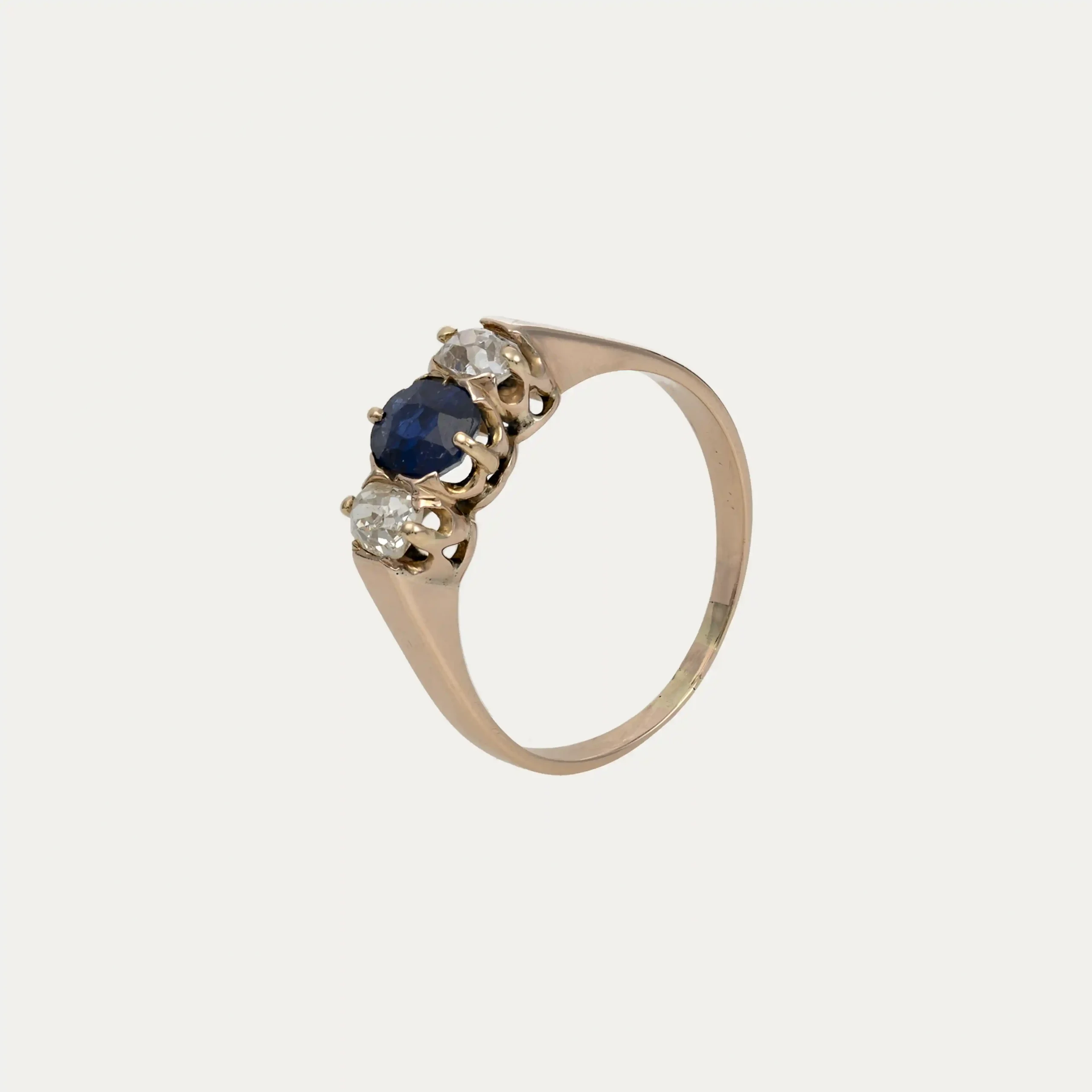 Anel de ouro rosa 18kt – 750‰, com 2 diamantes em talhe oval e 1 safira azul ao centro oval.