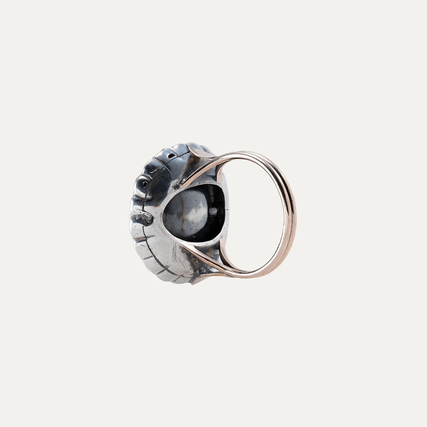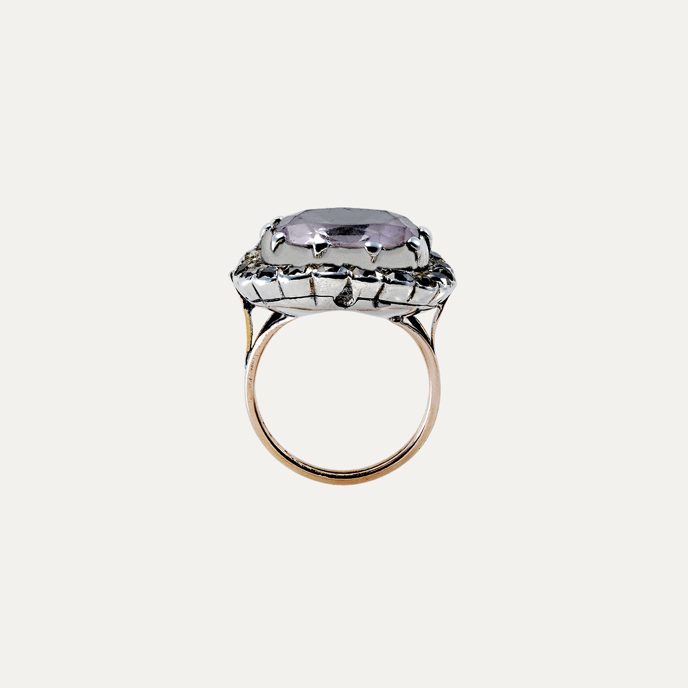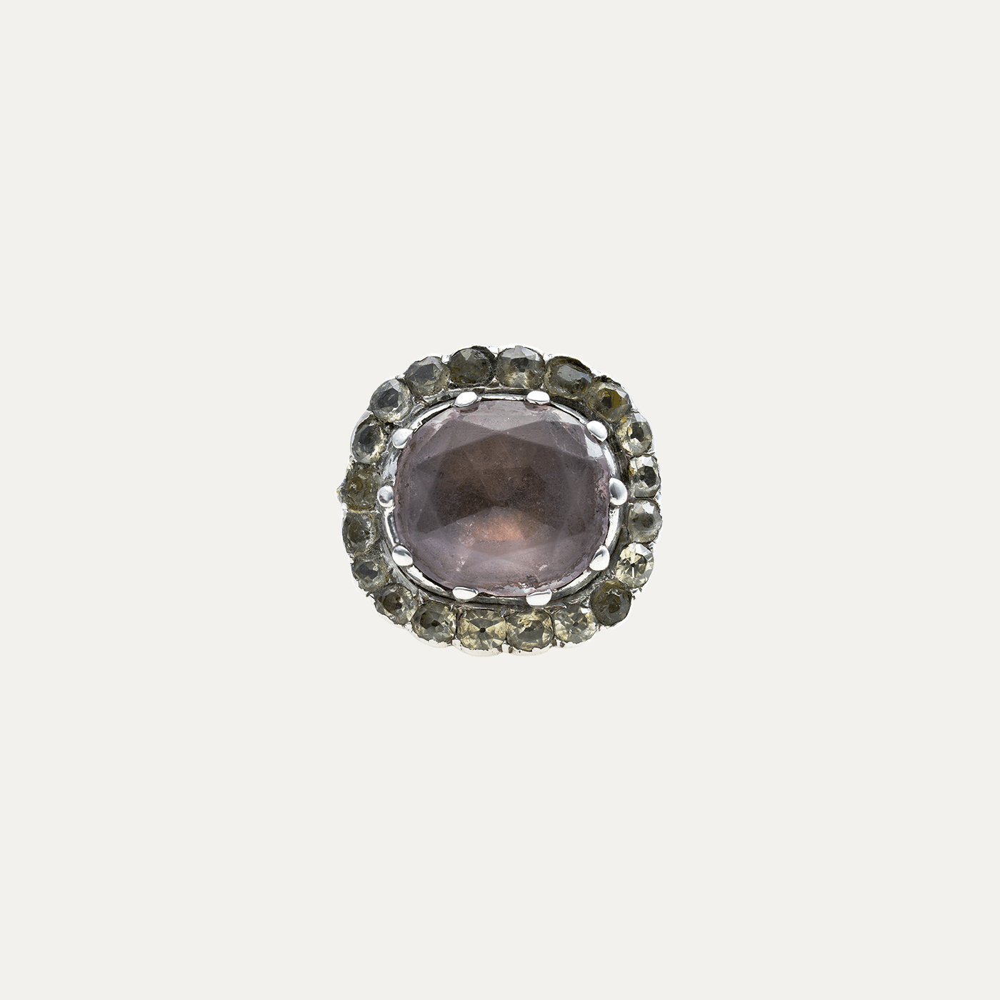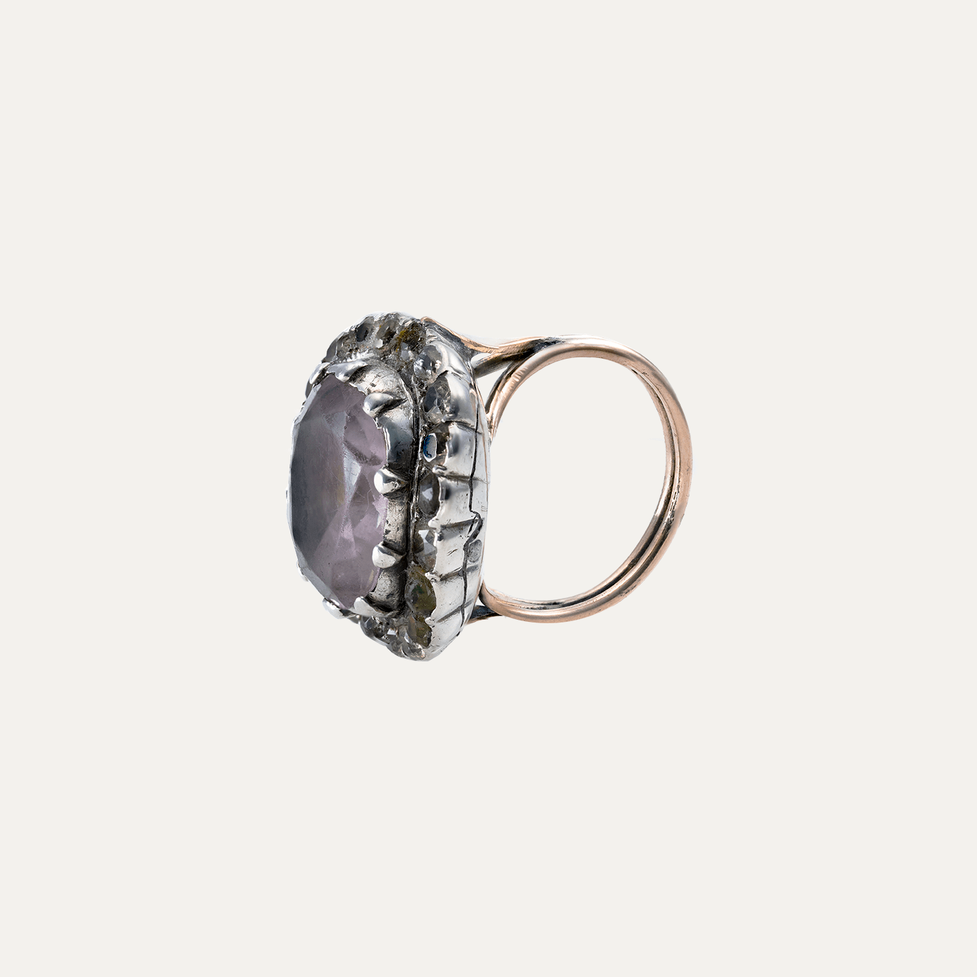 Antigo anel em ouro e prata com uma ametista ao centro, rodeado de 20 crisolitas. Restauros e adaptações. Português, sem contraste, ao abrigo do Decreto-Lei n.º 120/2017, artigo 2, nº 2, alínea C e artigo 3.