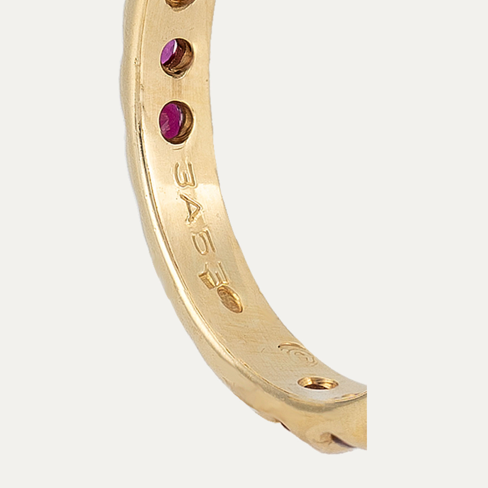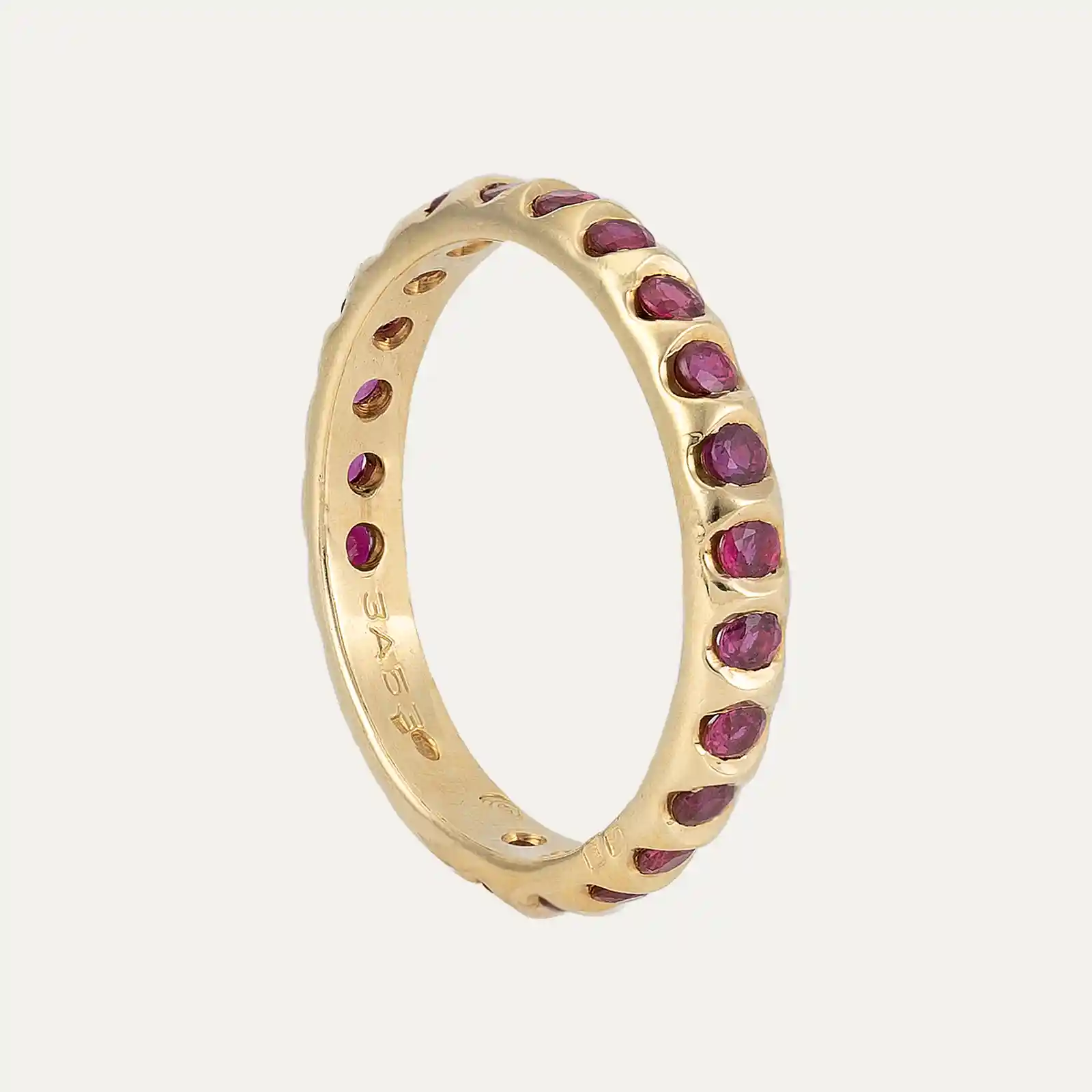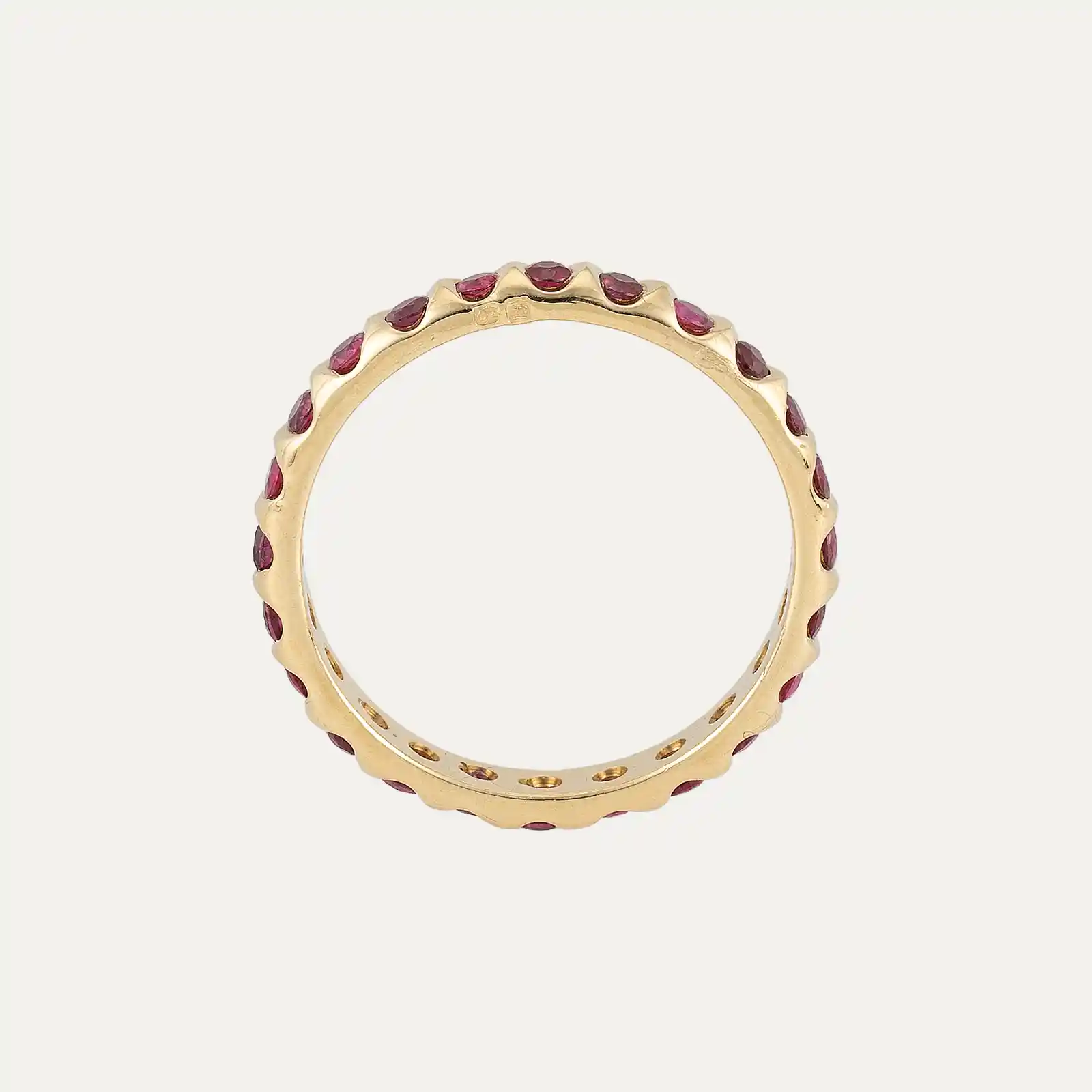 Anel em ouro amarelo 18kt – 750‰, adornado com uma fileira contínua de 24 rubis, distribuídos ao longo de todo o anel.