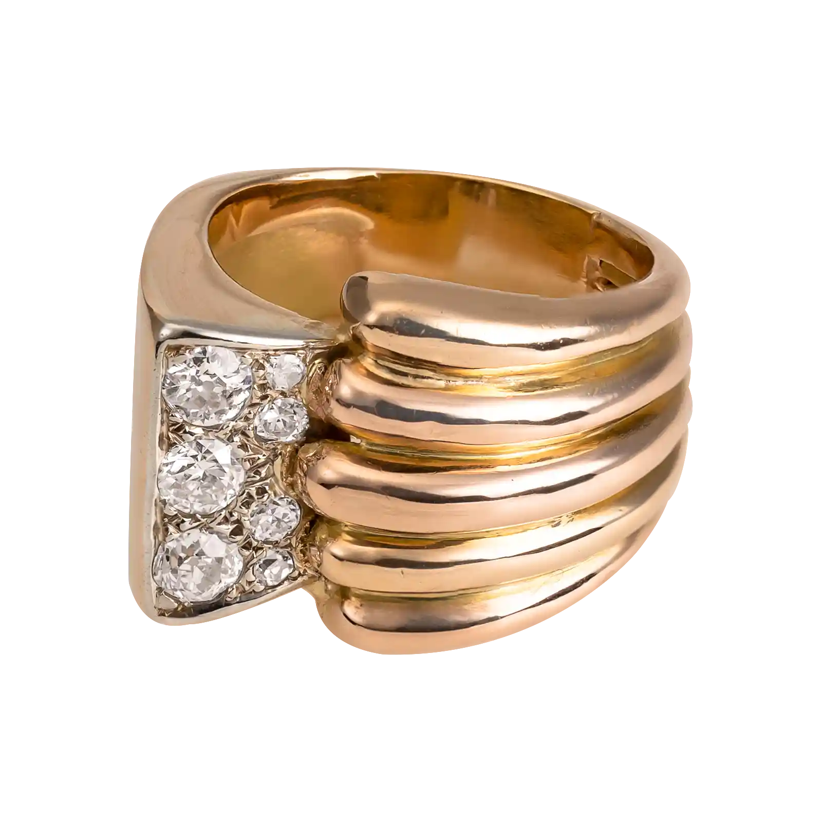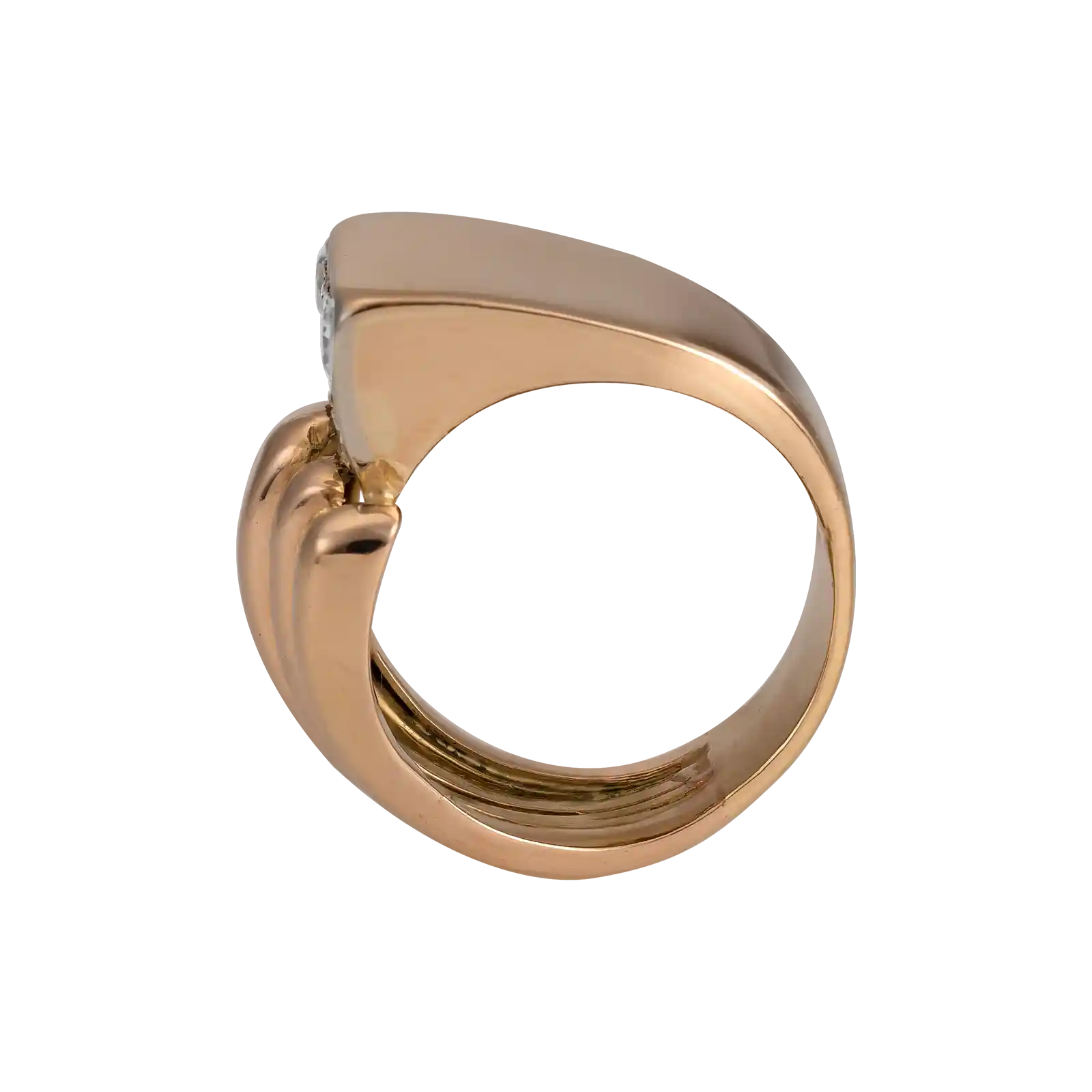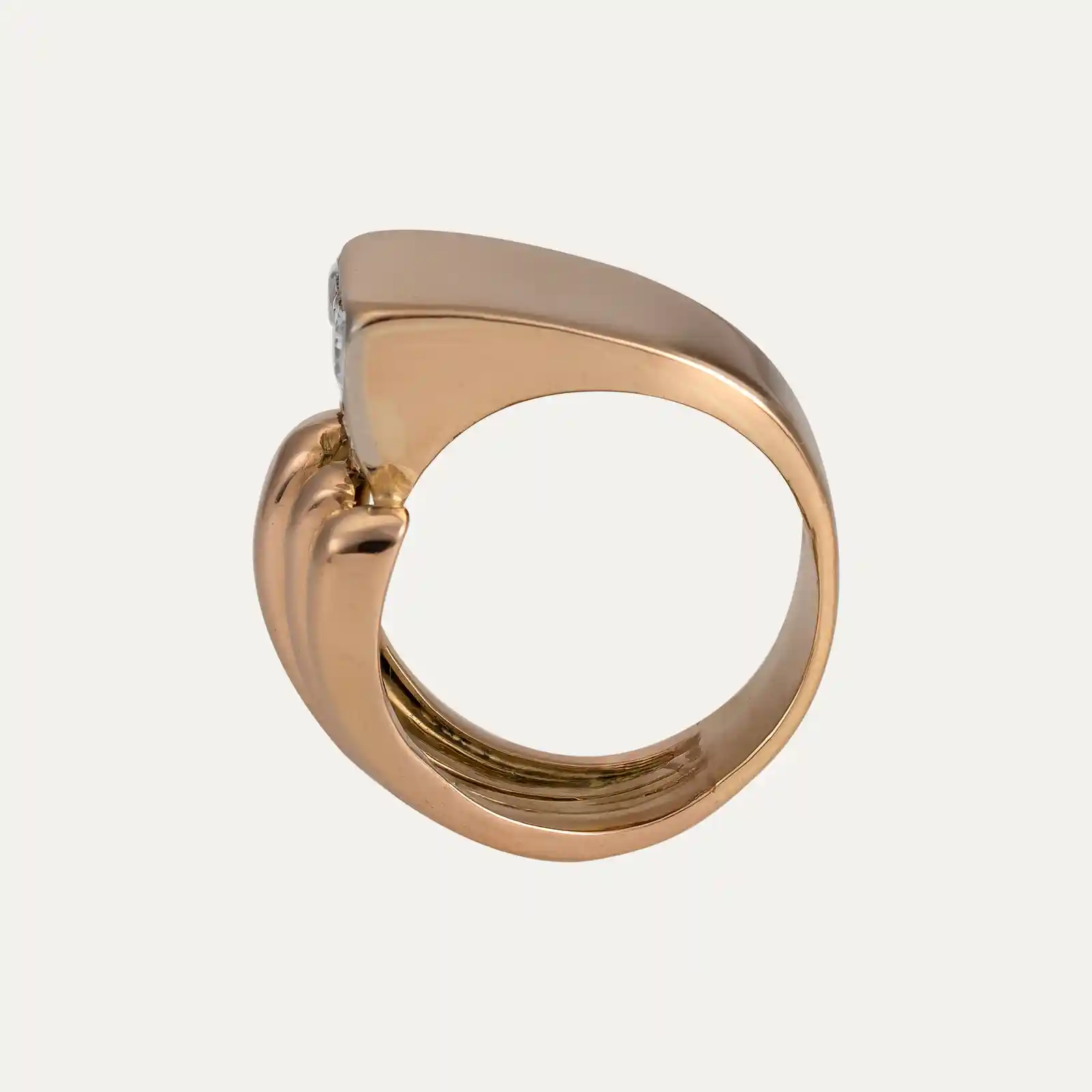 Anel em ouro rosa 19.2kt – 800‰, com formas geométricas. Cravado com 9 diamantes em talhe brilhante com cerca de 0.594ct no total.