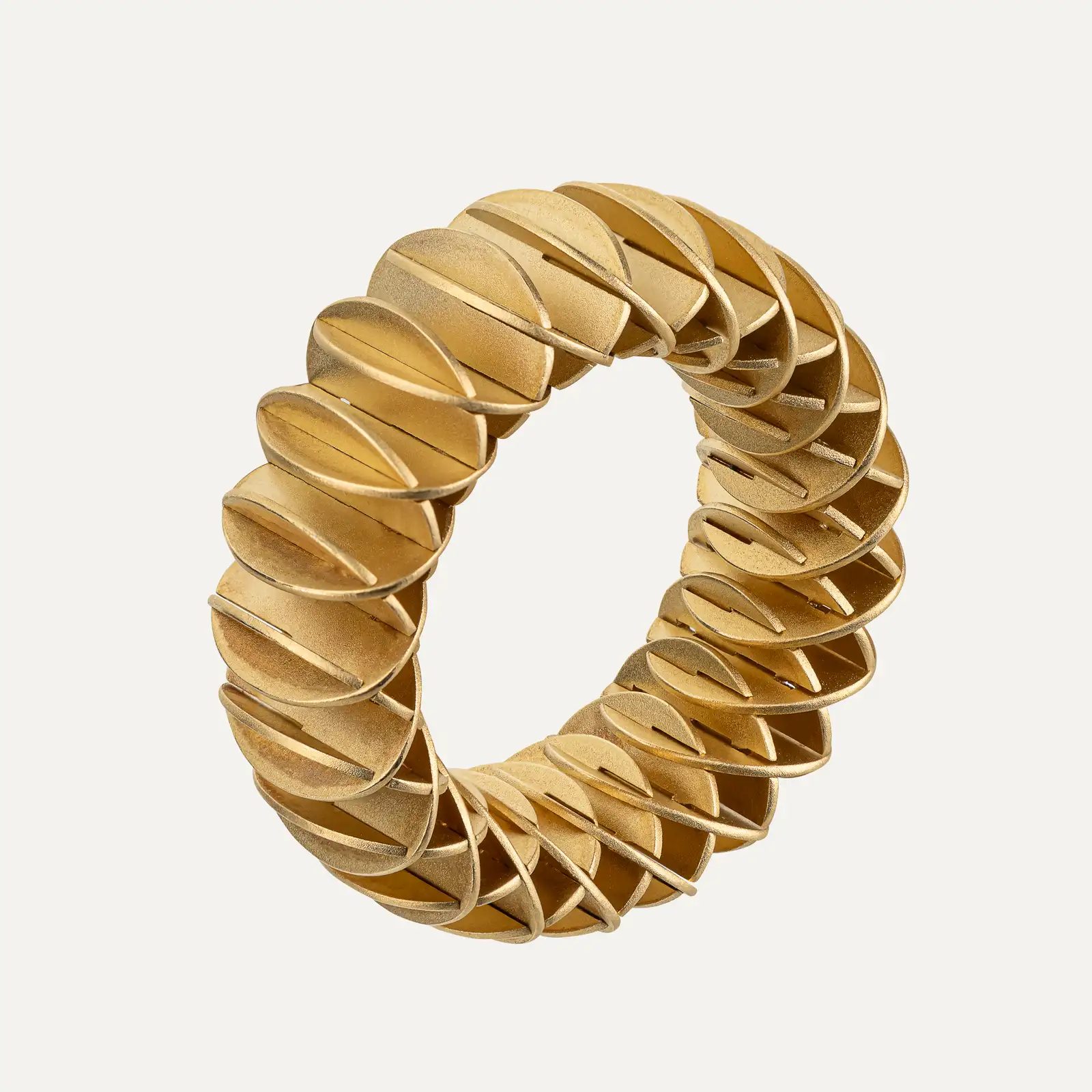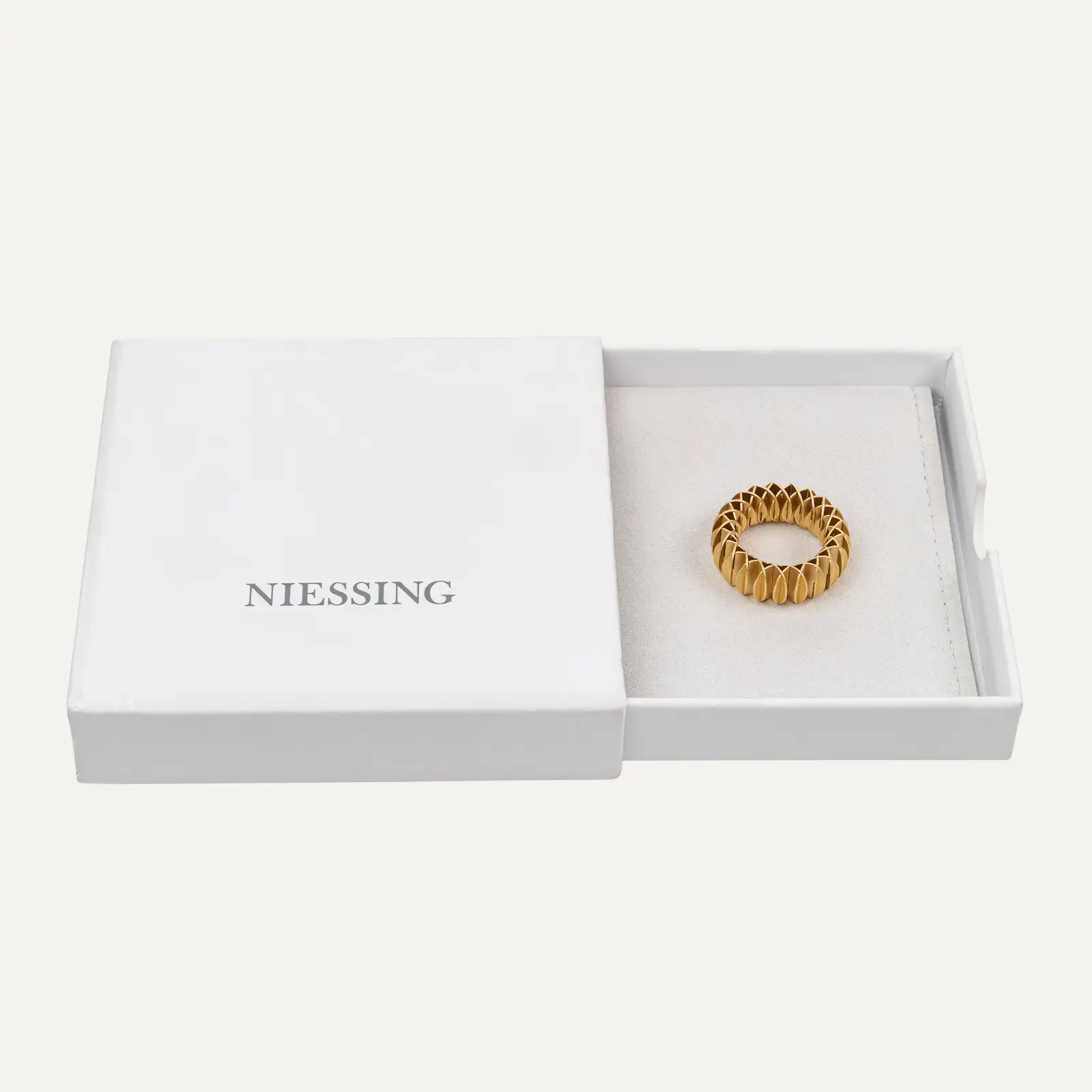 O acabamento mate confere profundidade ao ouro e reforça o carácter arquitetónico da peça, enquanto a construção meticulosa evidencia o elevado nível de mestria artesanal pelo qual a Niessing é reconhecida internacionalmente.
