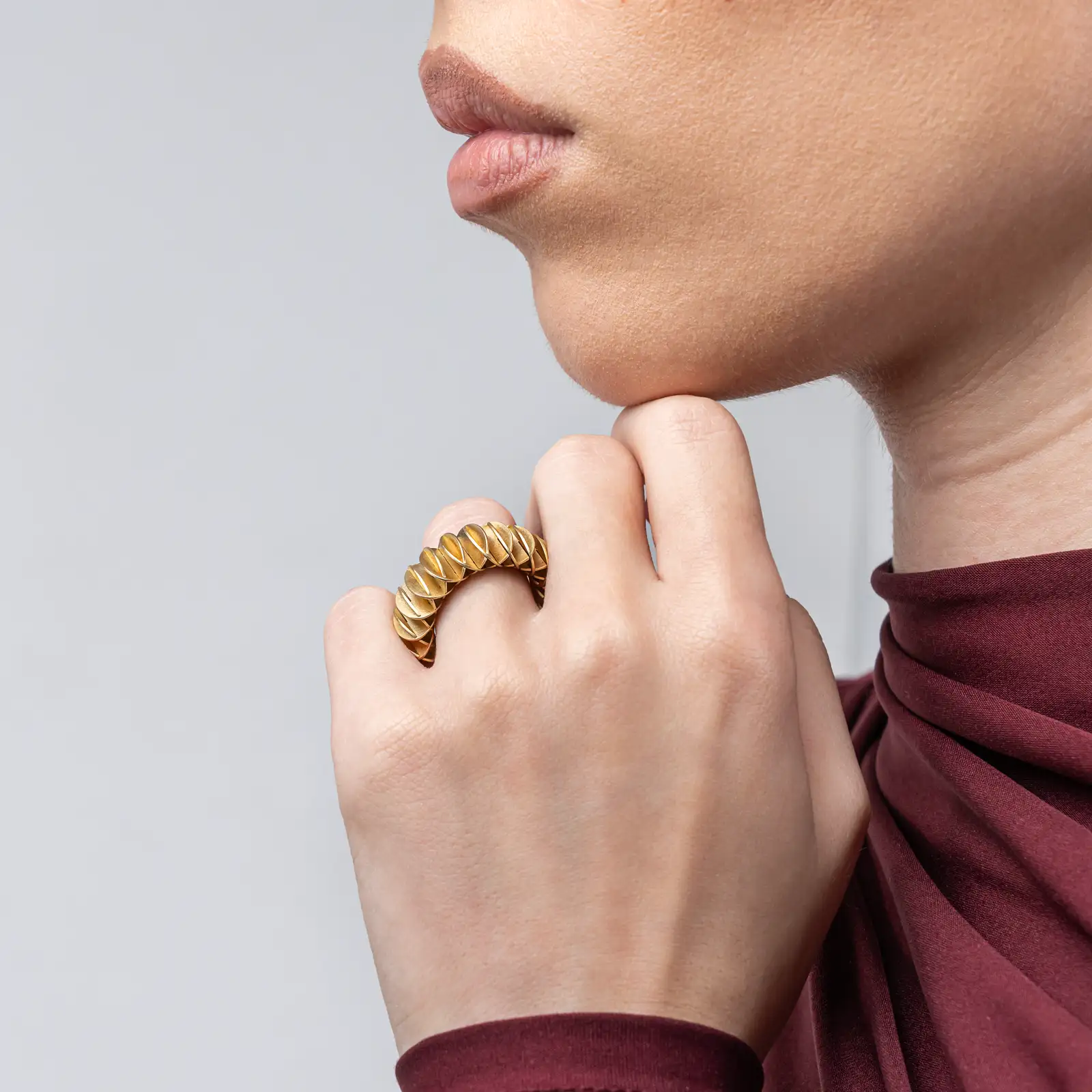 Uma celebração da forma e da precisão. Este anel Niessing, em ouro amarelo, traduz a essência do design contemporâneo alemão: rigor técnico, inovação e estética depurada. A sua estrutura escultural, composta por elementos repetidos e ritmados, cria um efeito visual dinâmico e sofisticado, com uma presença marcante no dedo.