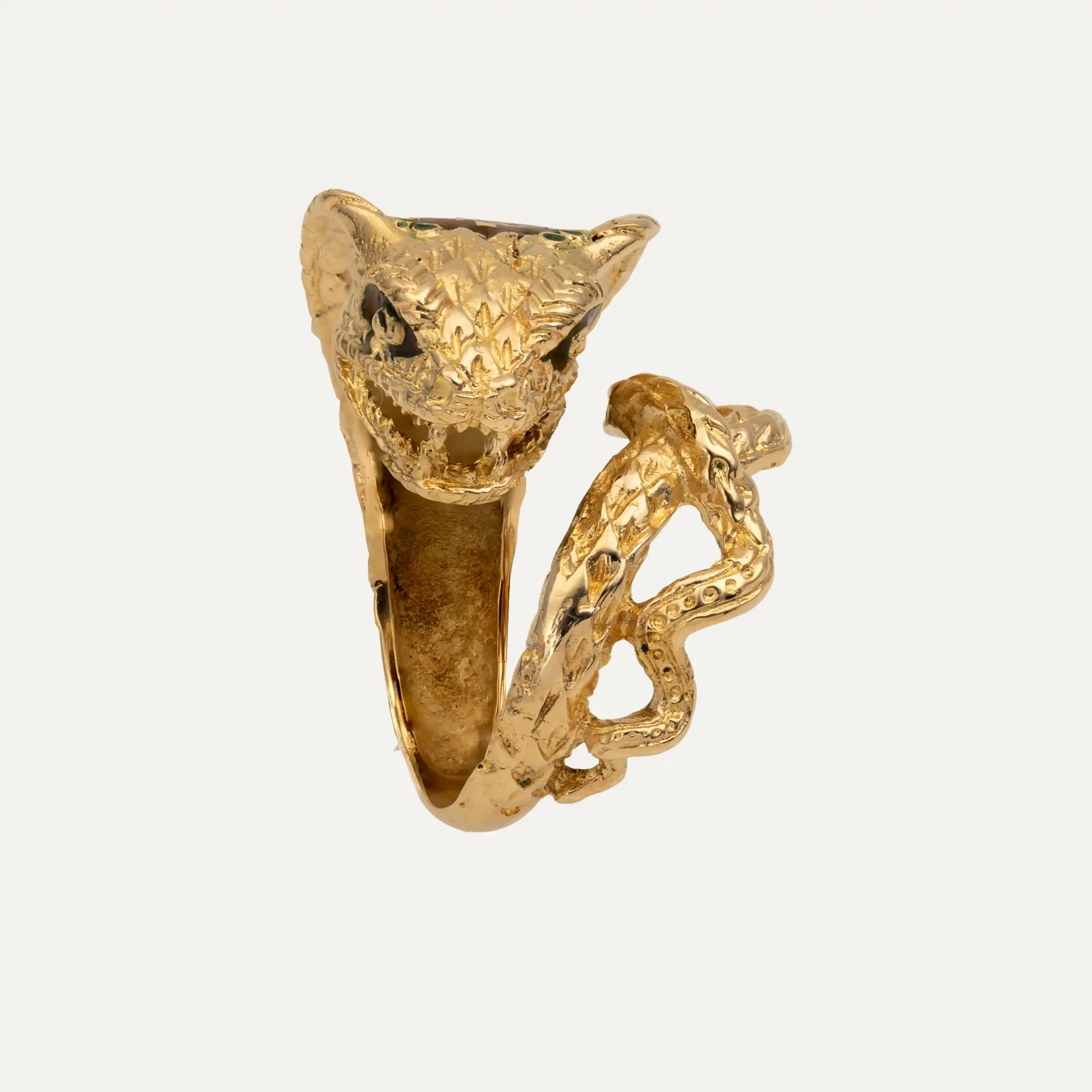 Anel com formato serpente em ouro amarelo 14kt – 585‰, com esmalte laranja tijolo e verde. O corpo do anel possui texturas detalhadas que imitam as escamas do animal.