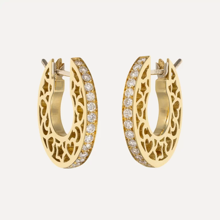 Na lateral, um delicado jogo de recortes em forma de estrelas, corações e meias-luas acrescenta profundidade, simbolismo e um carácter poético ao design, revelando um trabalho artesanal de elevada precisão. O contraste entre o brilho dos diamantes e a textura vazada do ouro cria uma estética contemporânea com inspiração clássica.