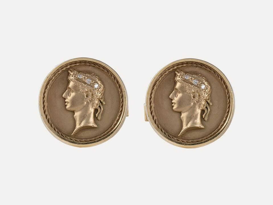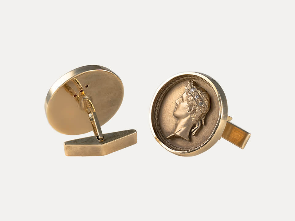 Botões de punho redondos, com figura humana em alto relevo, em ouro amarelo de 9kt – 375‰ e 6 pequenos diamantes em talhe brilhante