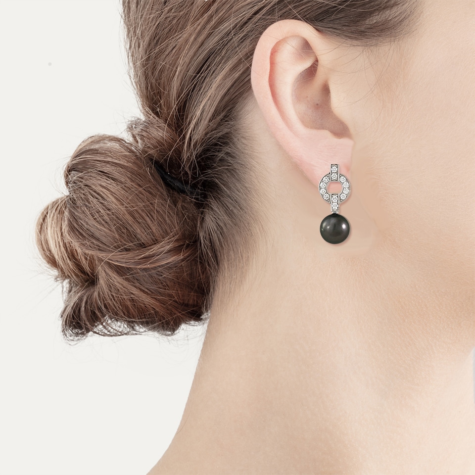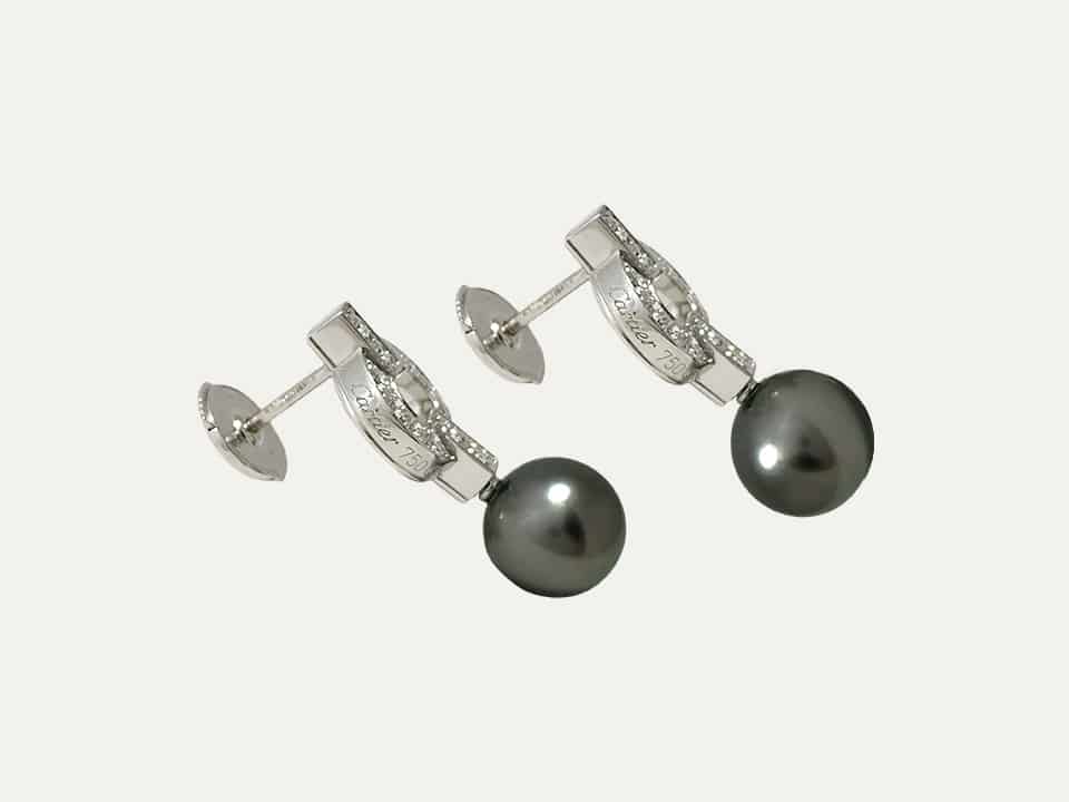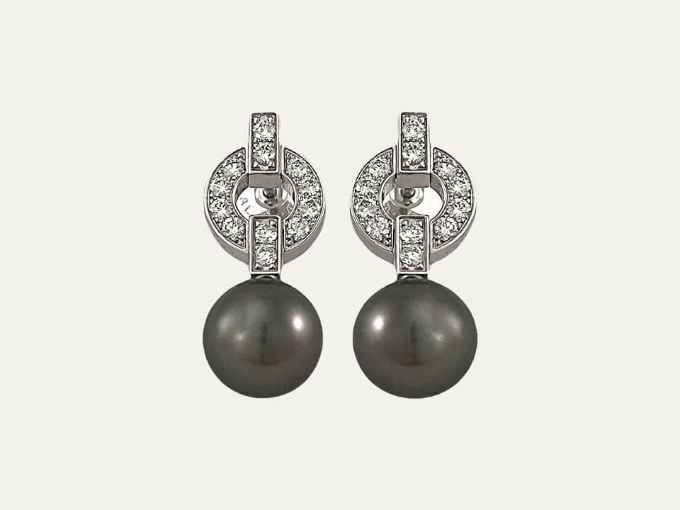 Brincos da Cartier, modelo Himalia, em ouro branco de 18 kt – 750 ‰ com 2 pérolas redondas e cinzentas do Taiti e 24 brilhantes. Assinados Cartier e numerados.