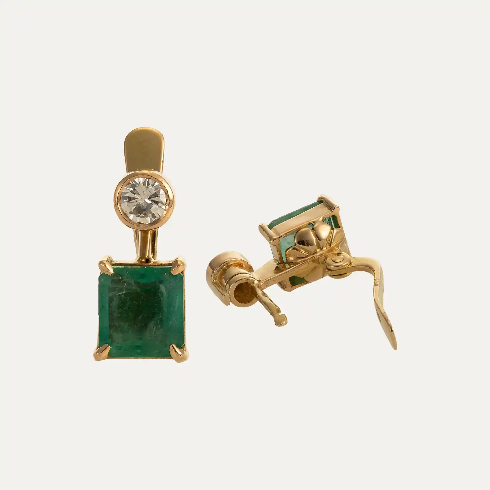 Brincos em ouro amarelo 19.2kt – 800‰ com 2 diamantes, em talhe brilhante, com cerca de 0.40ct no total e 2 esmeraldas em forma retangular com cerca de 2.8ct. Sistema de espigão e aro.