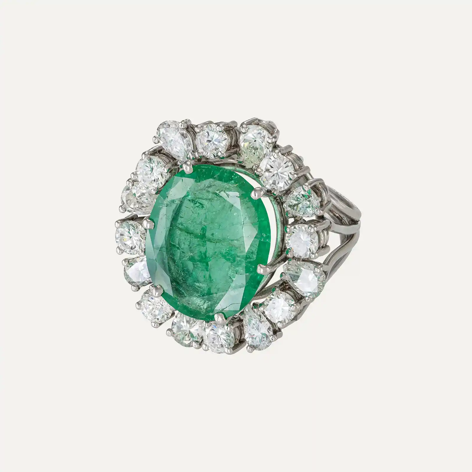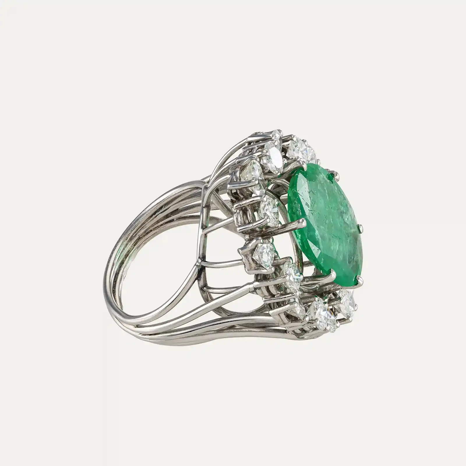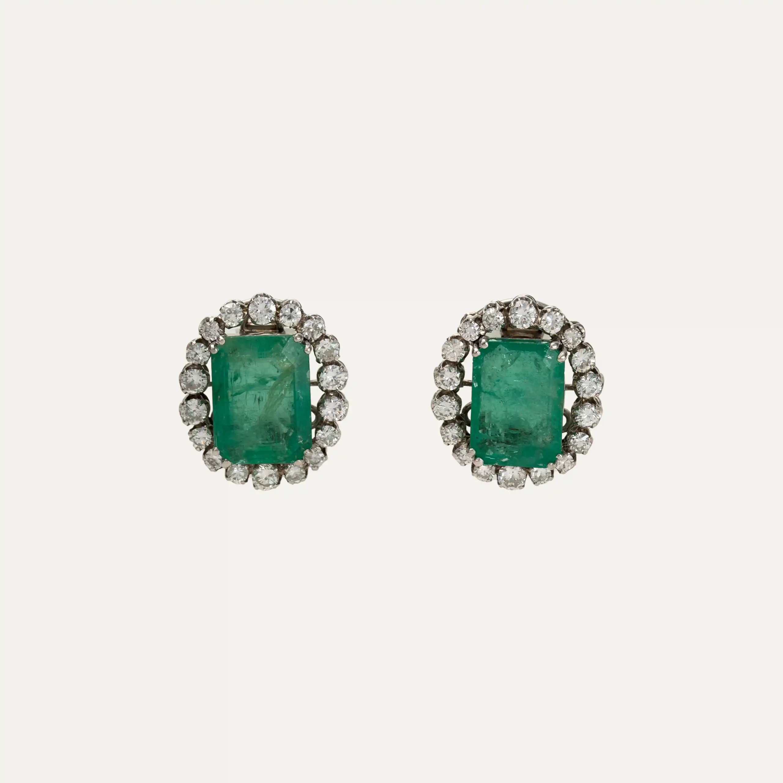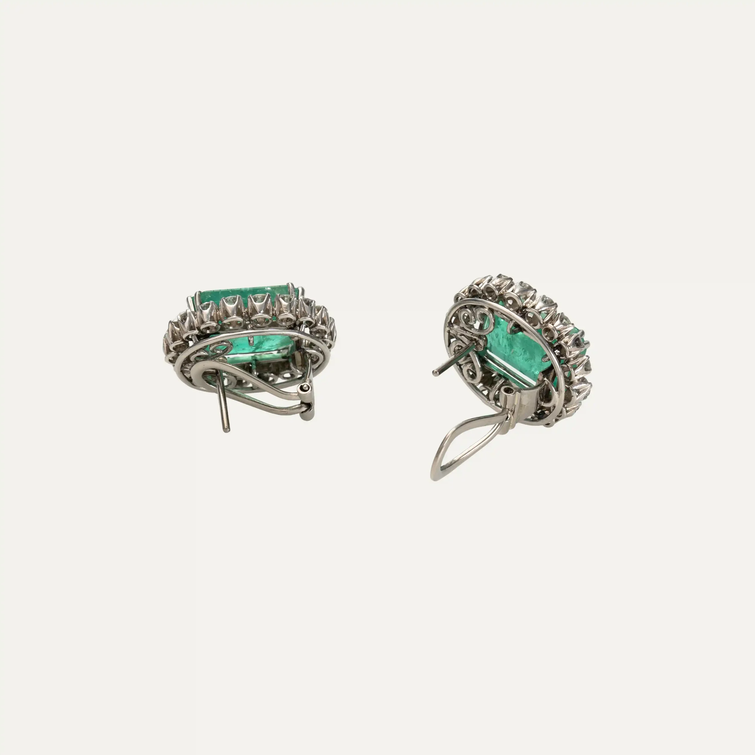 Brincos em ouro branco e platina com 2 esmeraldas retangulares rodeadas por diamantes, talhe brilhante, que totalizam cerca de 2.88ct. Fazem conjunto com o anel com Referencia 9004321.
