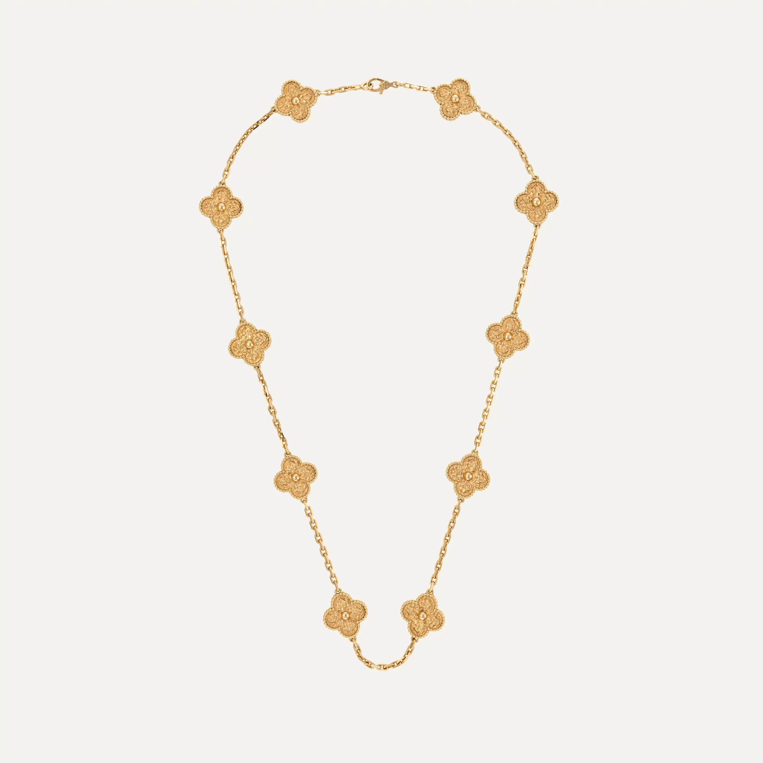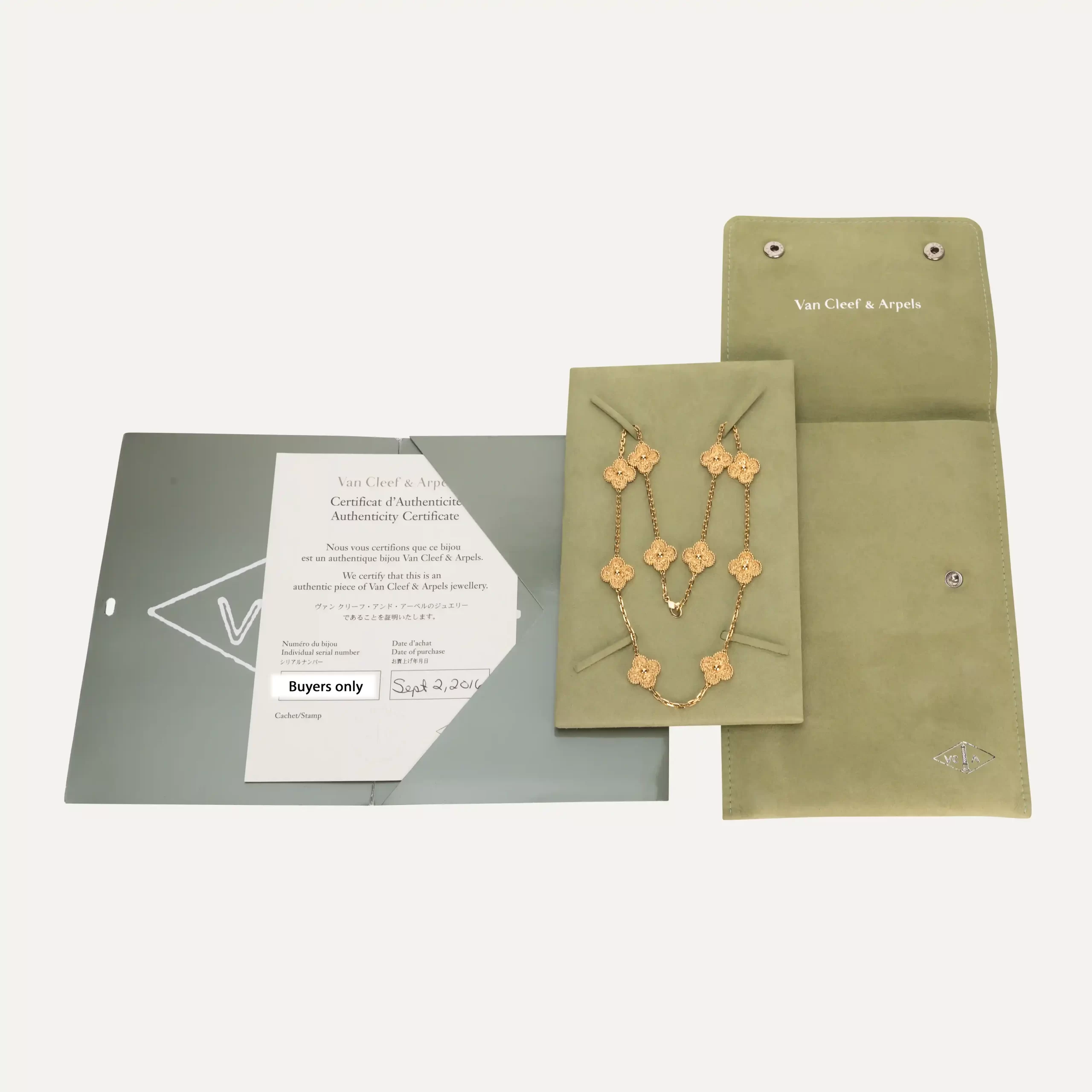 Ícone absoluto da alta joalharia francesa, este colar Van Cleef & Arpels Alhambra em ouro amarelo apresenta 10 motivos emblemáticos, símbolo intemporal de sorte, elegância e sofisticação.