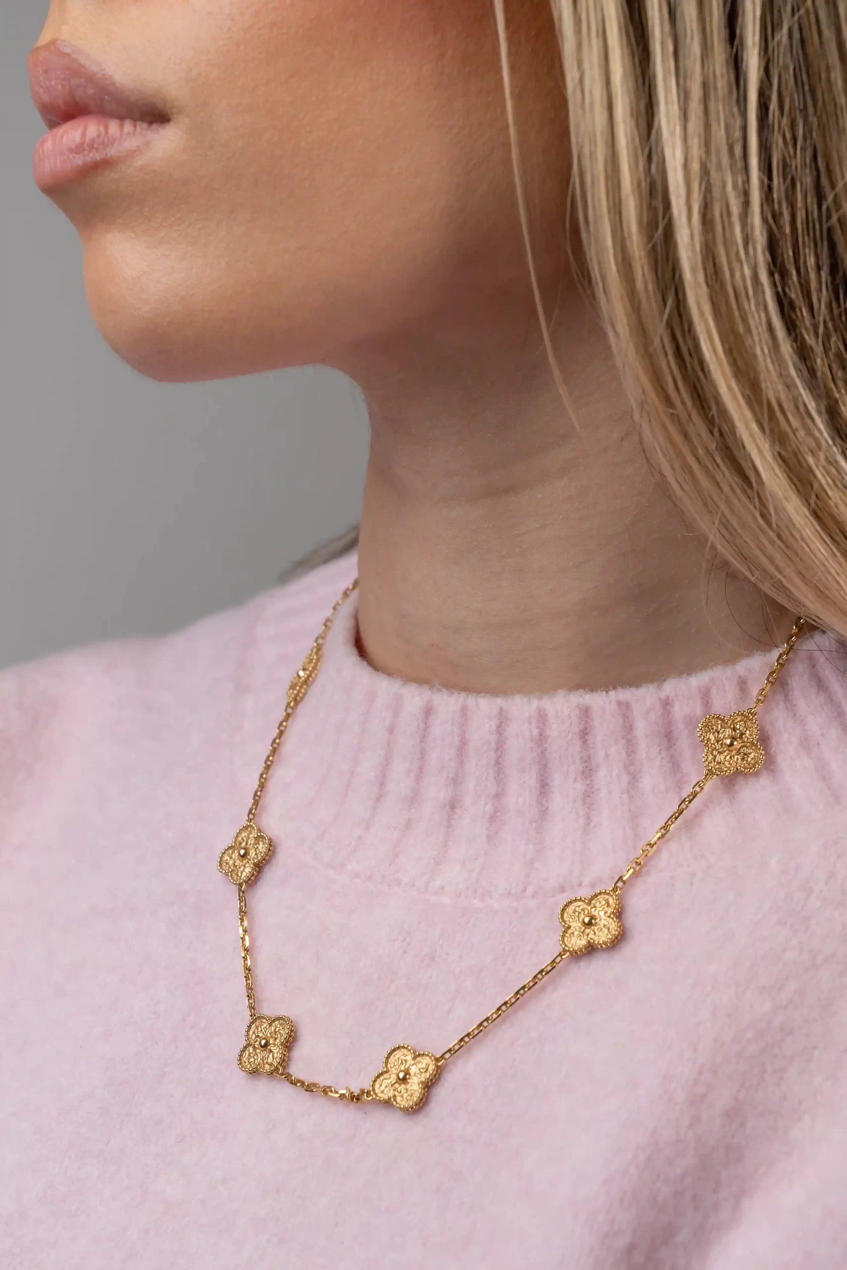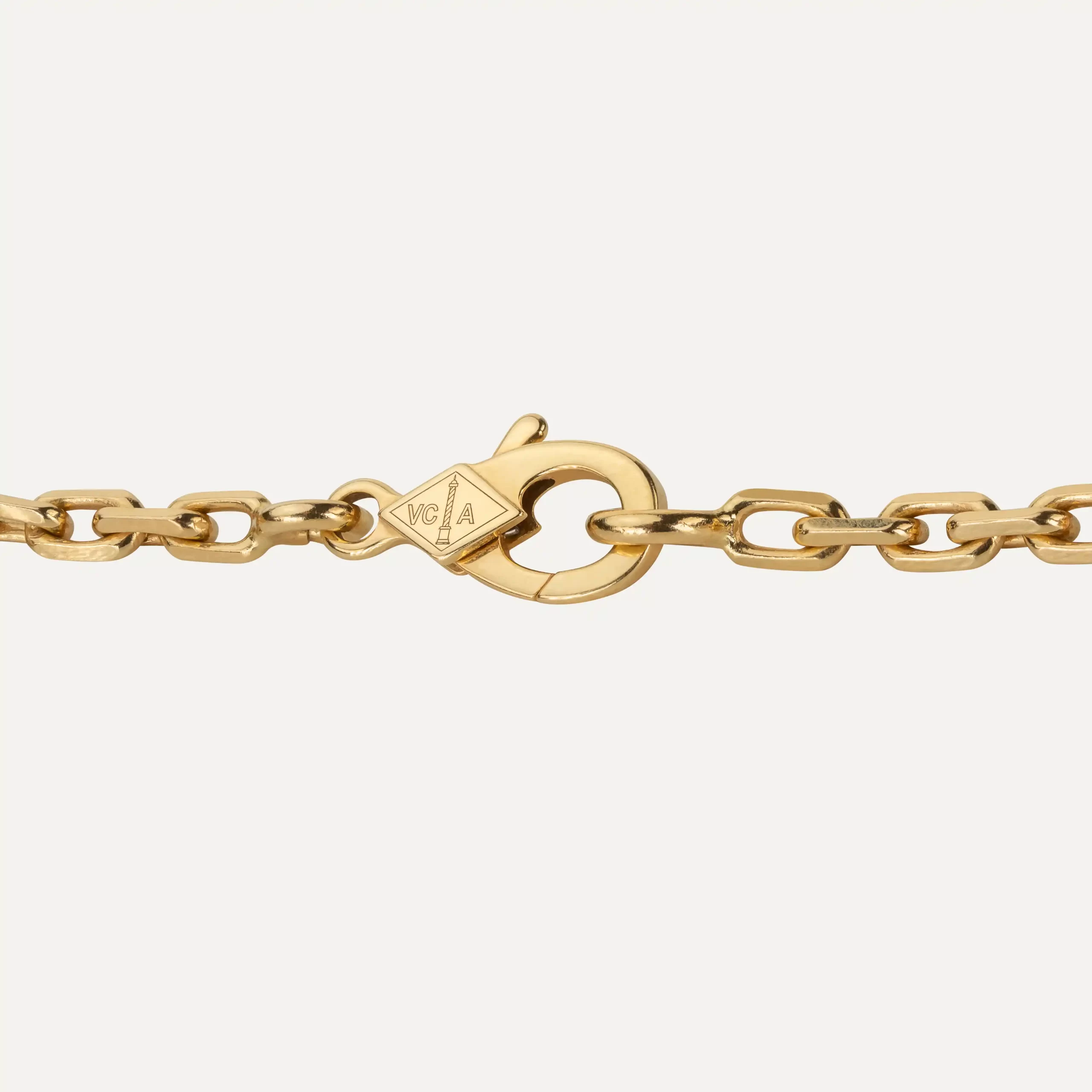 Criado segundo o savoir-faire excecional da maison, cada motivo Alhambra é meticulosamente trabalhado, revelando um delicado acabamento texturado que confere profundidade, brilho e carácter à peça. A corrente em ouro amarelo equilibra harmoniosamente o design, a elegância e versatilidade.