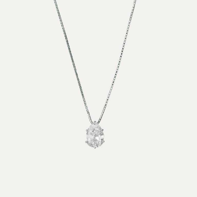 Fio em ouro branco 18kt – 750‰, diamante em forma pera de 5,26ct, com cor G e pureza VS1. Com certificado emitido por GIA (Gemological Institute of America).
