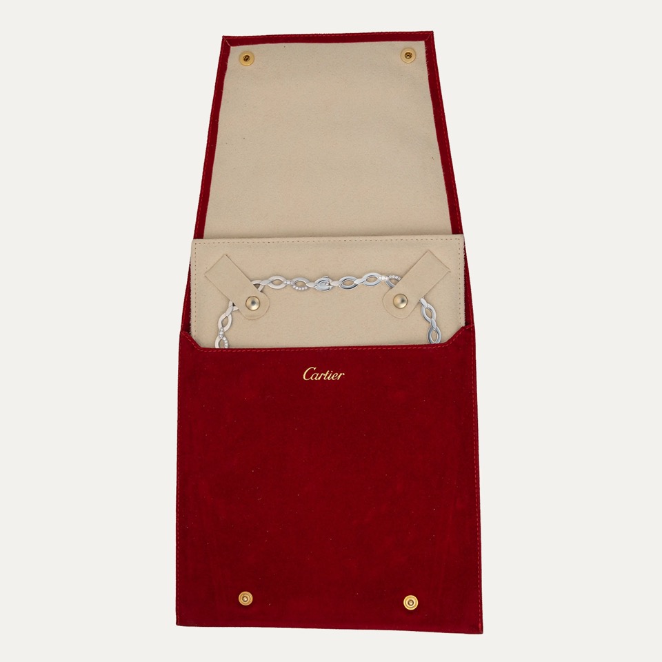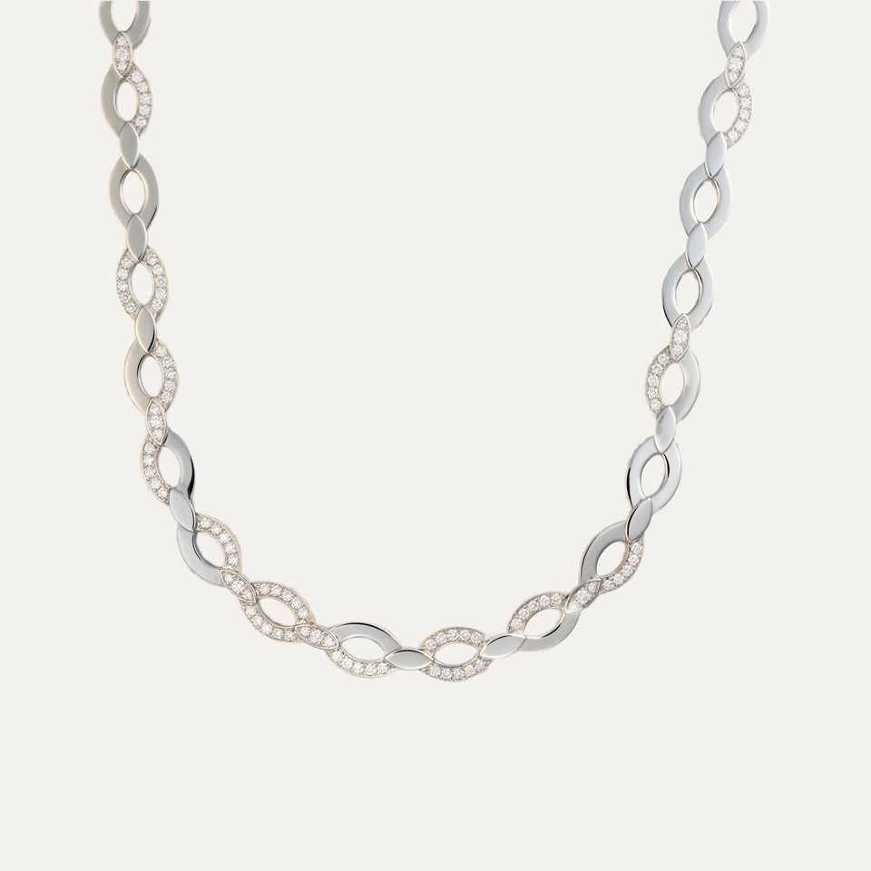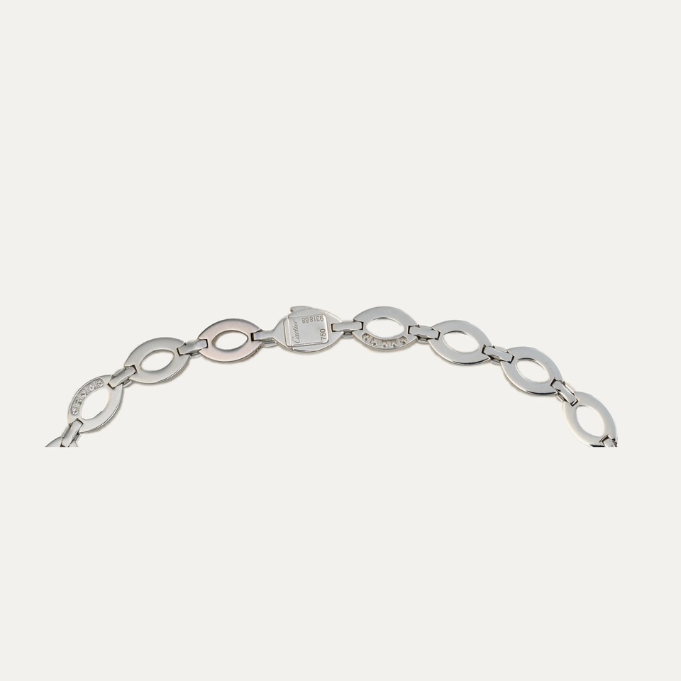 Gargantilha Cartier em ouro branco 18kt – 750‰, da colecção Diadea, inspirada nas tiaras usadas pela realeza. Colar articulado, composto por 27 elos ovais, parcialmente cravejados com 112 diamantes em talhe brilhante, cor G e pureza VS. com cerca de 3.572ct no total. Com um fecho de pressão e um fecho de segurança invisível. Criada por Charles Jacqueau no principio do século XX. Assinado Cartier. Bolsa de veludo e documento de intervenção Cartier.