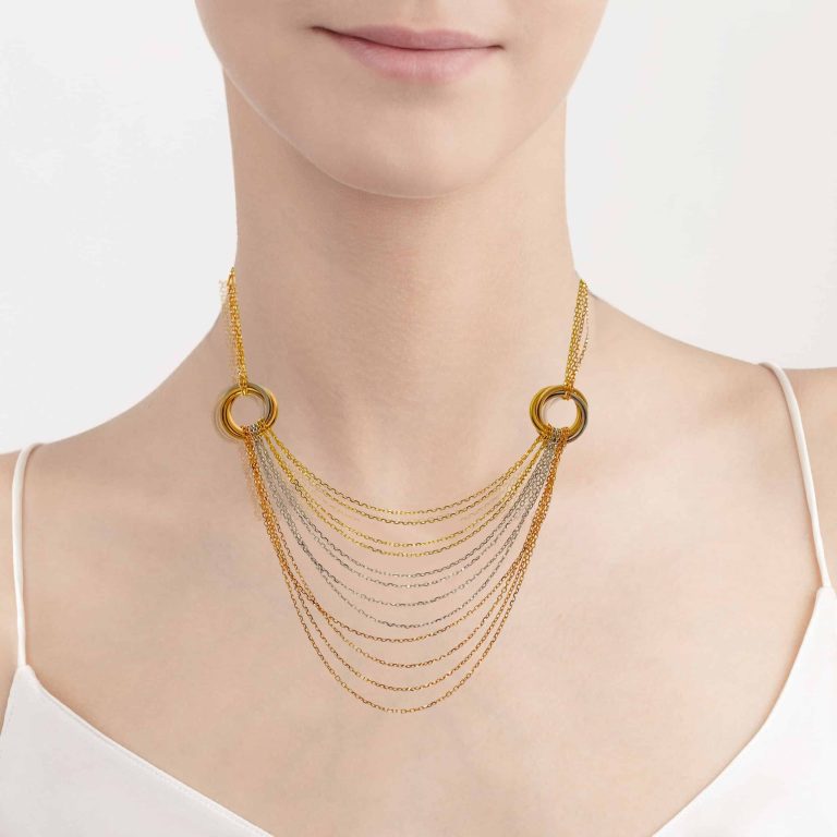 Gargantilha Cartier Trinity em ouro amarelo, branco e rosa de 18 kt – 750 ‰. Assinada e numerada “RV5114”, com certificado.