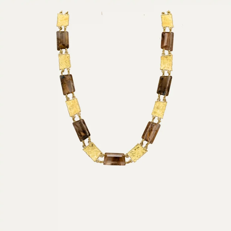 Colar em ouro amarelo de 14 kt – 585 ‰, que combina a luminosidade do ouro com a elegância natural do quartzo rutilado em forma trapezóide. As pedras, cuidadosamente selecionadas, revelam delicados filamentos dourados que criam reflexos únicos, realçados pela simplicidade dos retângulos em ouro amarelo. Peça de equilíbrio perfeito entre modernidade e intemporalidade. Fecho com argola de mola.