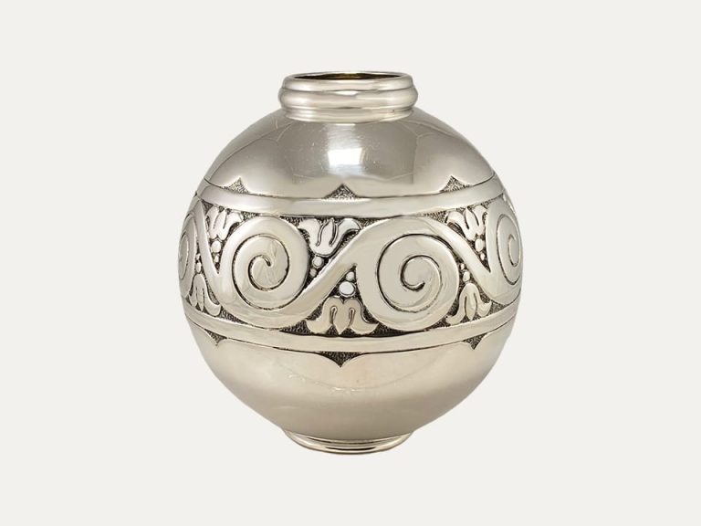 Jarra Art Deco em prata de 833 ‰ portuguesa com decoração geométrica. Contraste Javali de Lisboa (1887-1937), marca de ourives de Manuel Pinto de Lima (reg. 1931), marca comercial da ourivesaria ELOY DE JESUS (Vidal – 67 e 689). Dim. – 17 x 15 cm; Peso – 564 g.